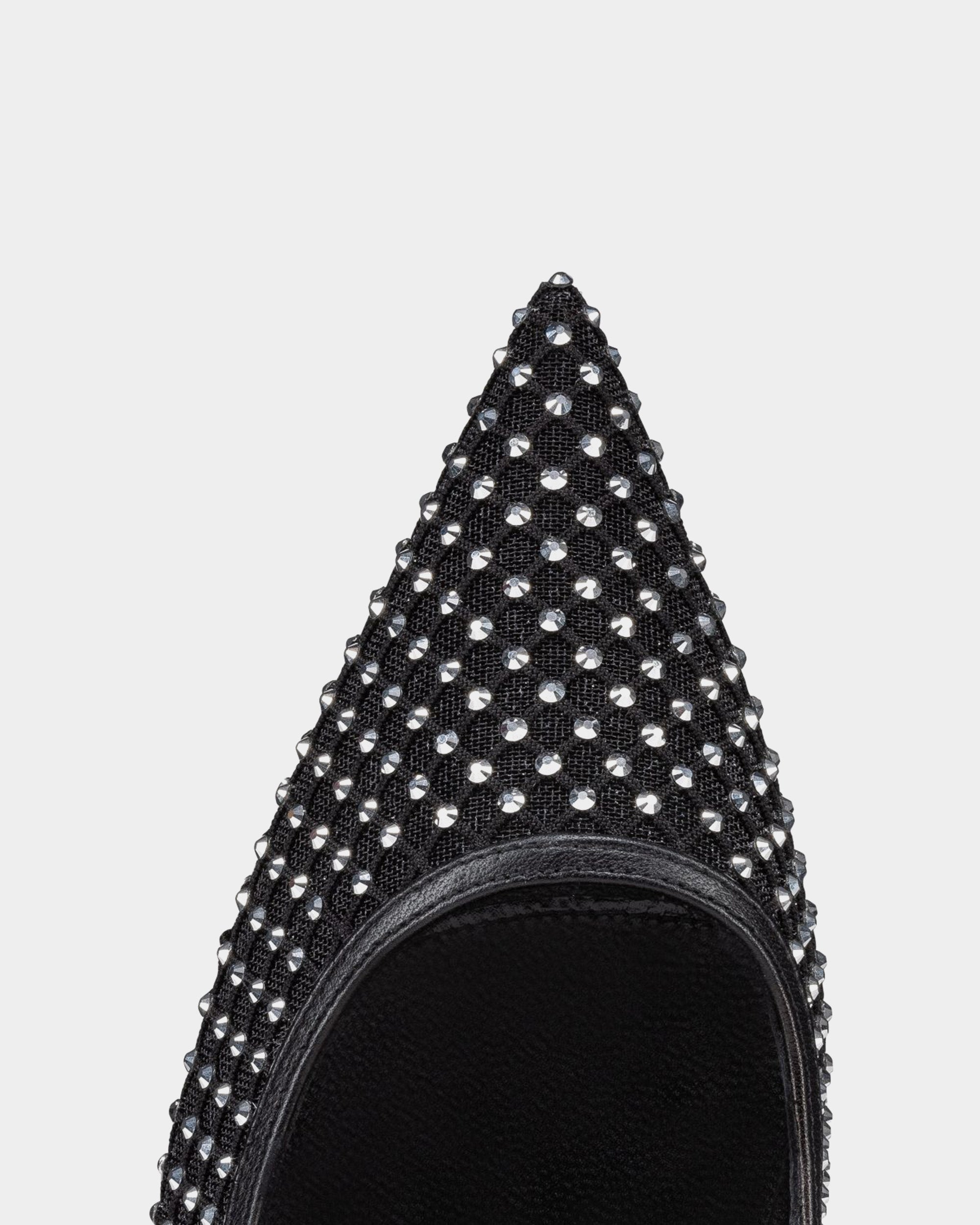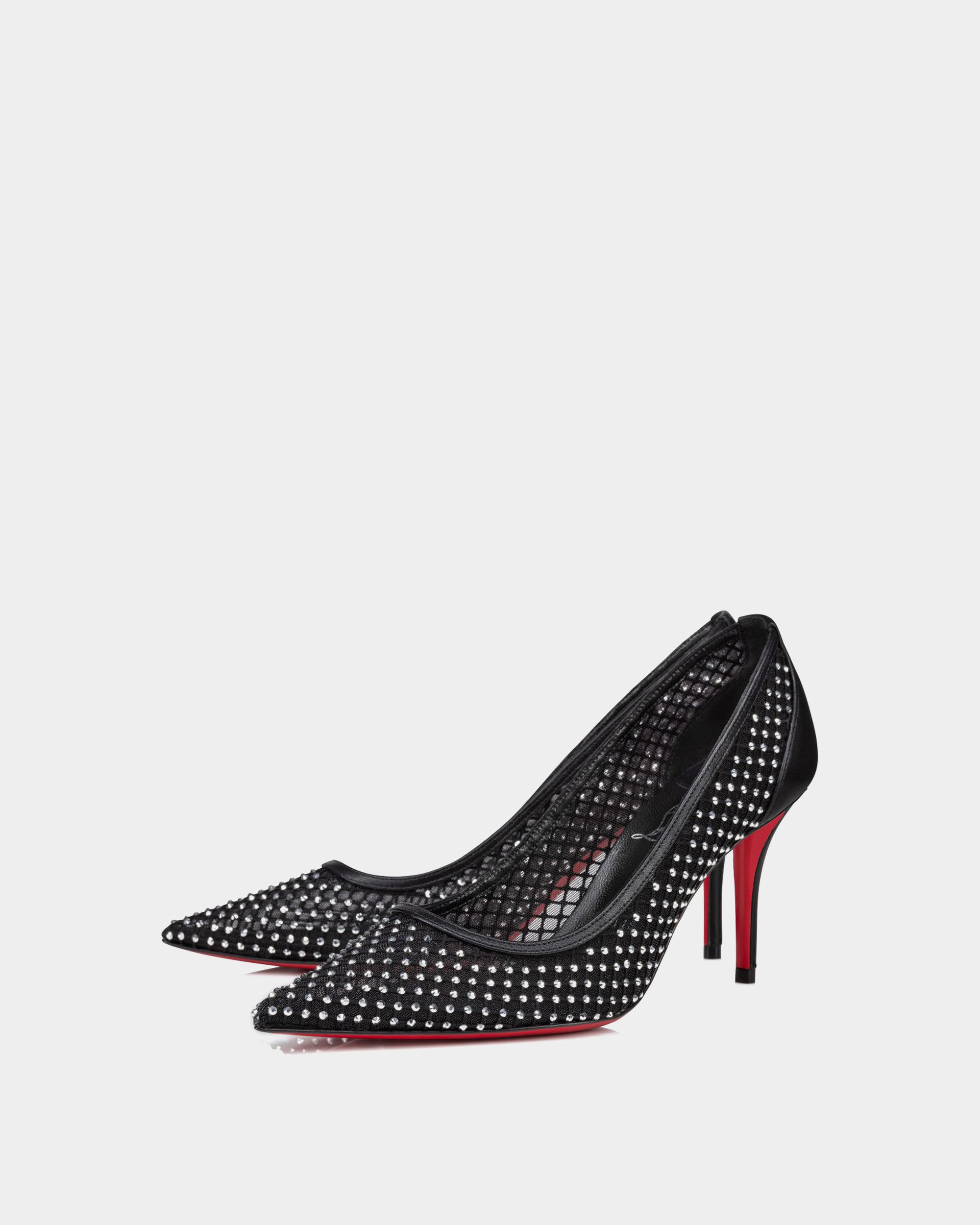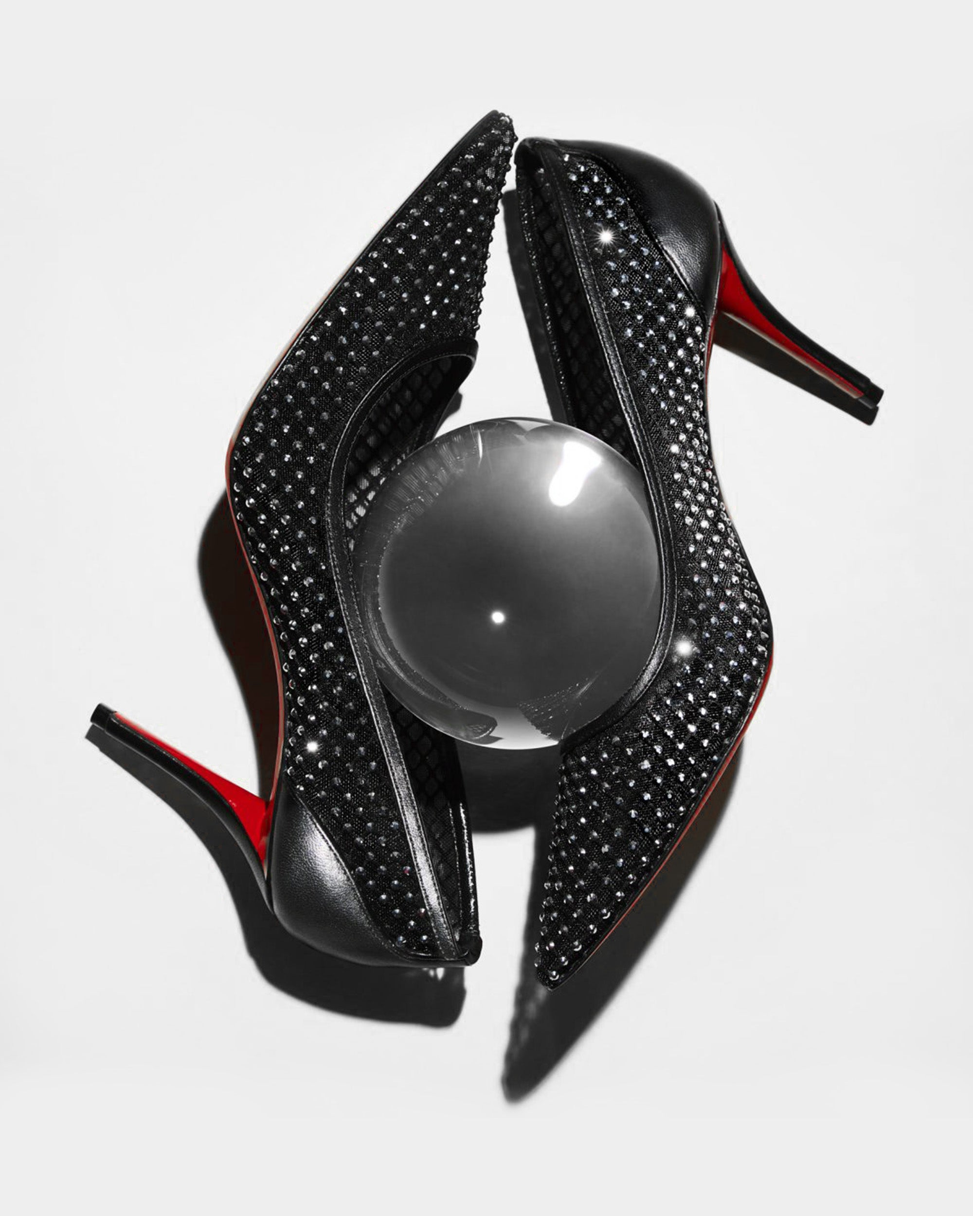 以尖頭與優雅弧形鞋口設計打造,黑色網布營造若隱若現的輕盈視覺效果,鑲嵌滿版水晶細節閃耀奢華光芒;搭配細高跟與經典紅底,完美融合性感與高貴,無論是晚宴、紅毯或時尚派對,皆能散發耀眼氣場,成為吸引目光的焦點之作。