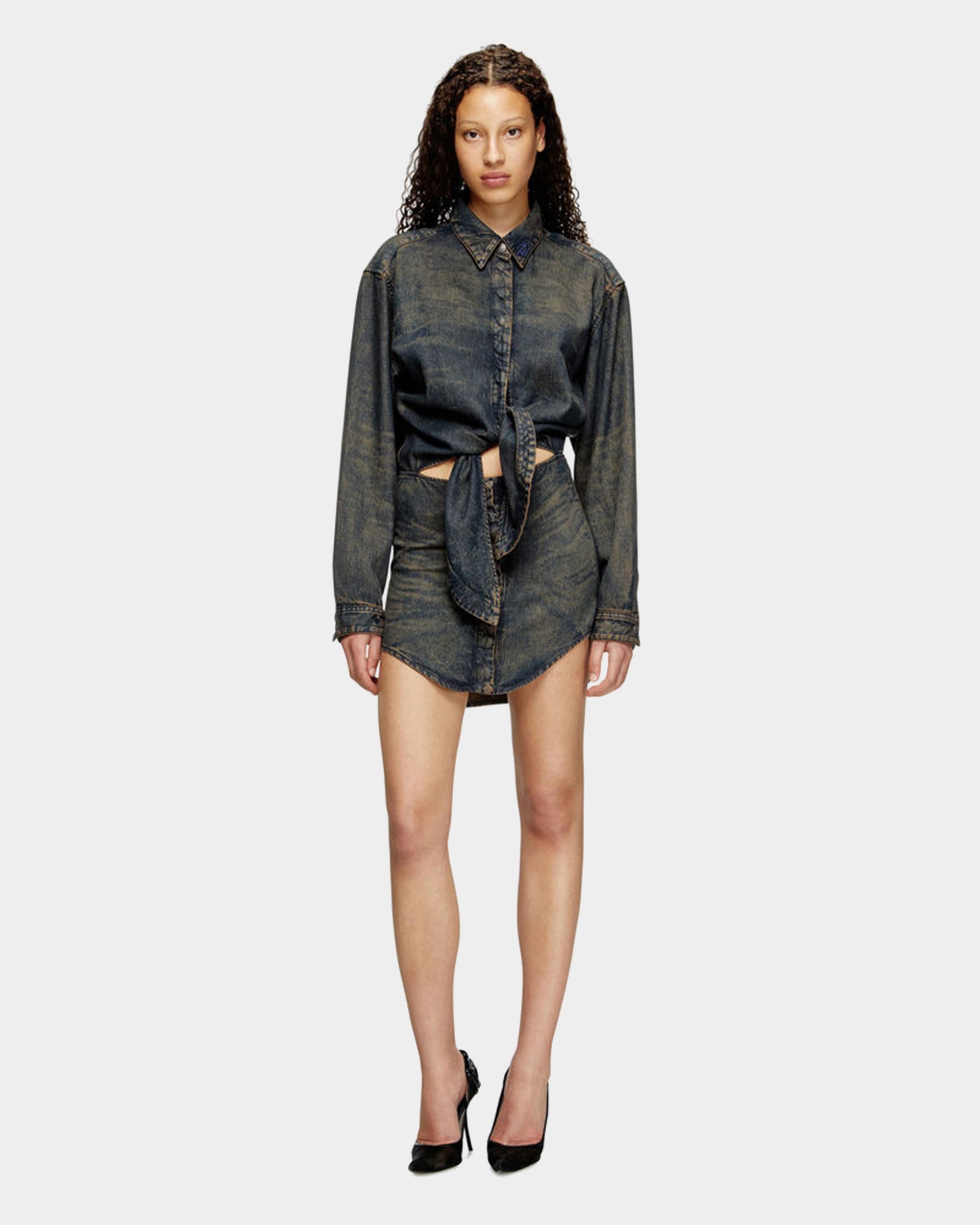 融合了襯衫與裙裝的設計,展現出新季節的風格與獨特風格。 它採用黑色輕盈的丹寧布,具有流動感的質地,並經過激光技術處理,呈現出自然磨損效果。