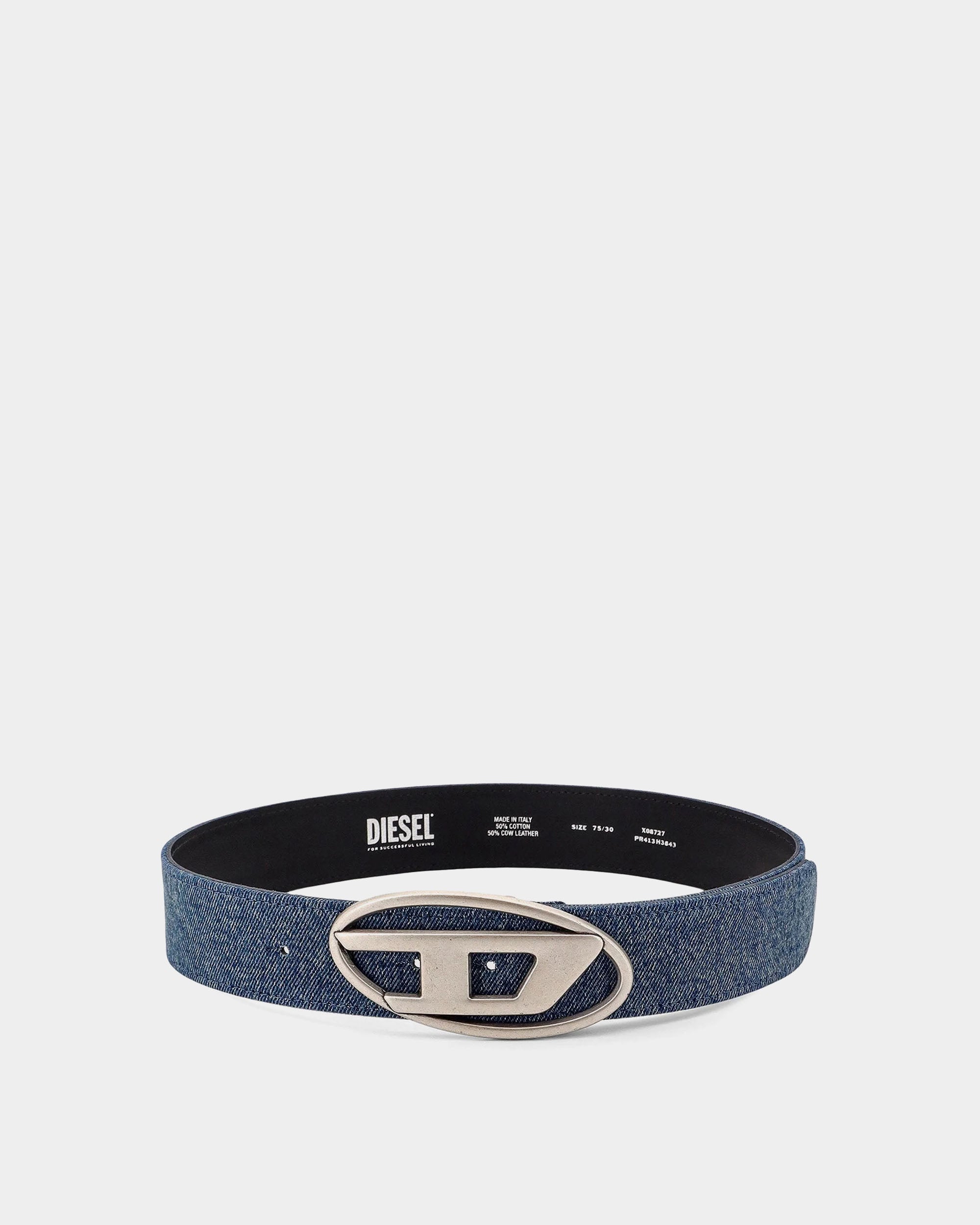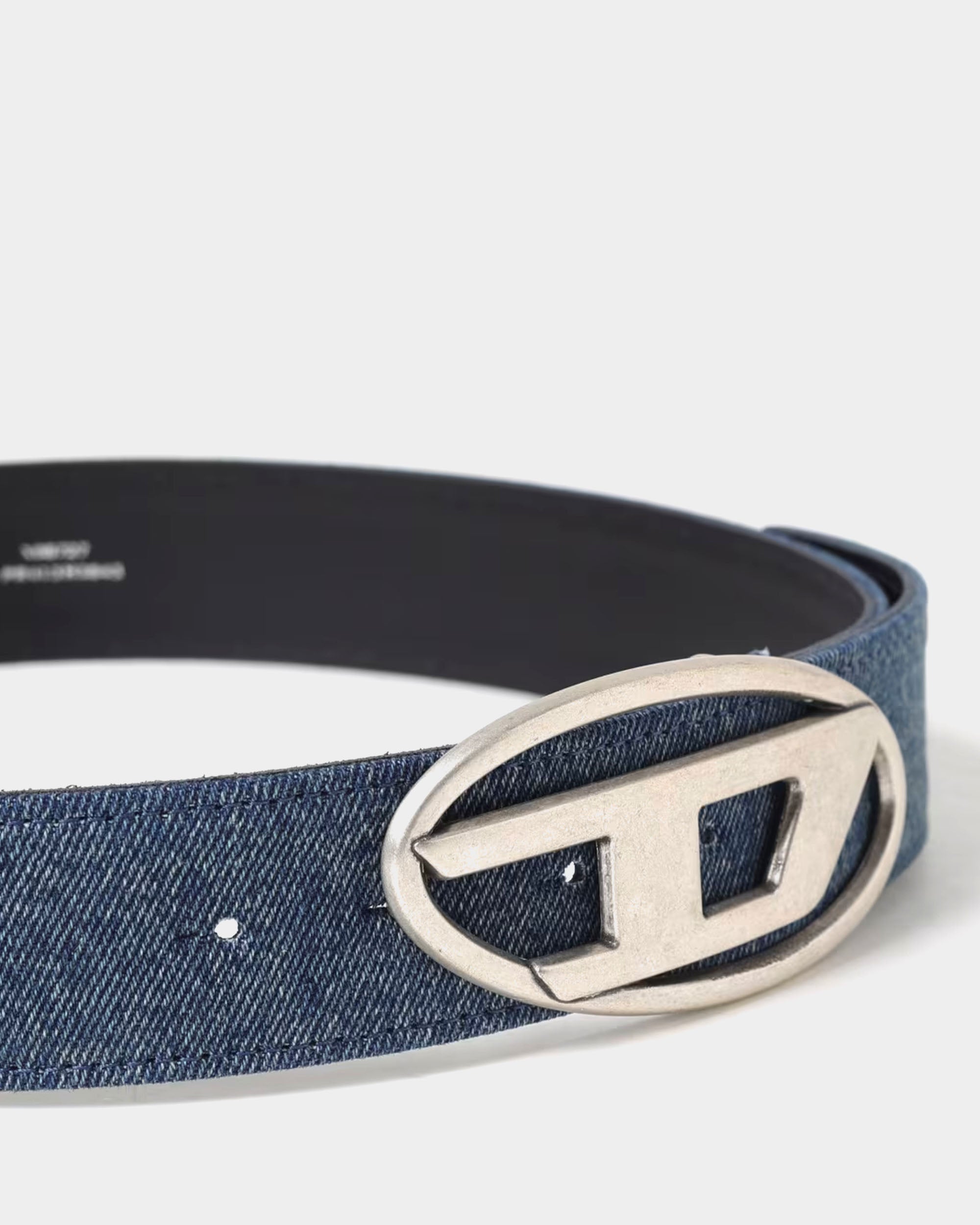 融合牛仔布與皮革,展現粗獷與精緻工藝的對比美感。腰帶正面飾有醒目的「Oval D」金屬標誌扣環,整體呈現品牌街頭風格。