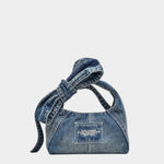 採用柔洗牛仔布製成,頂部飾有醒目的超大蝴蝶結手提把,配備可拆卸調節肩背帶與磁釦開合,內藏一隱藏拉鍊內袋,兼具造型趣味與日常實用。