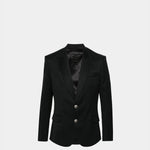 Balmain Black Two Button Jacket 以經典黑色羊毛材質打造,展現出精緻的剪裁和優雅氣質。設有尖領設計與結構化肩部,塑造出精緻的輪廓。雙排扣前襟搭配兩個標誌性銀色獅子金屬扣,增添奢華感。兩個翻蓋口袋與一個胸袋設計,兼具實用性與時尚感,修身袖口更添細節。這款西裝外套完美融合了經典設計與現代感,是正式場合或日常穿搭的理想選擇。