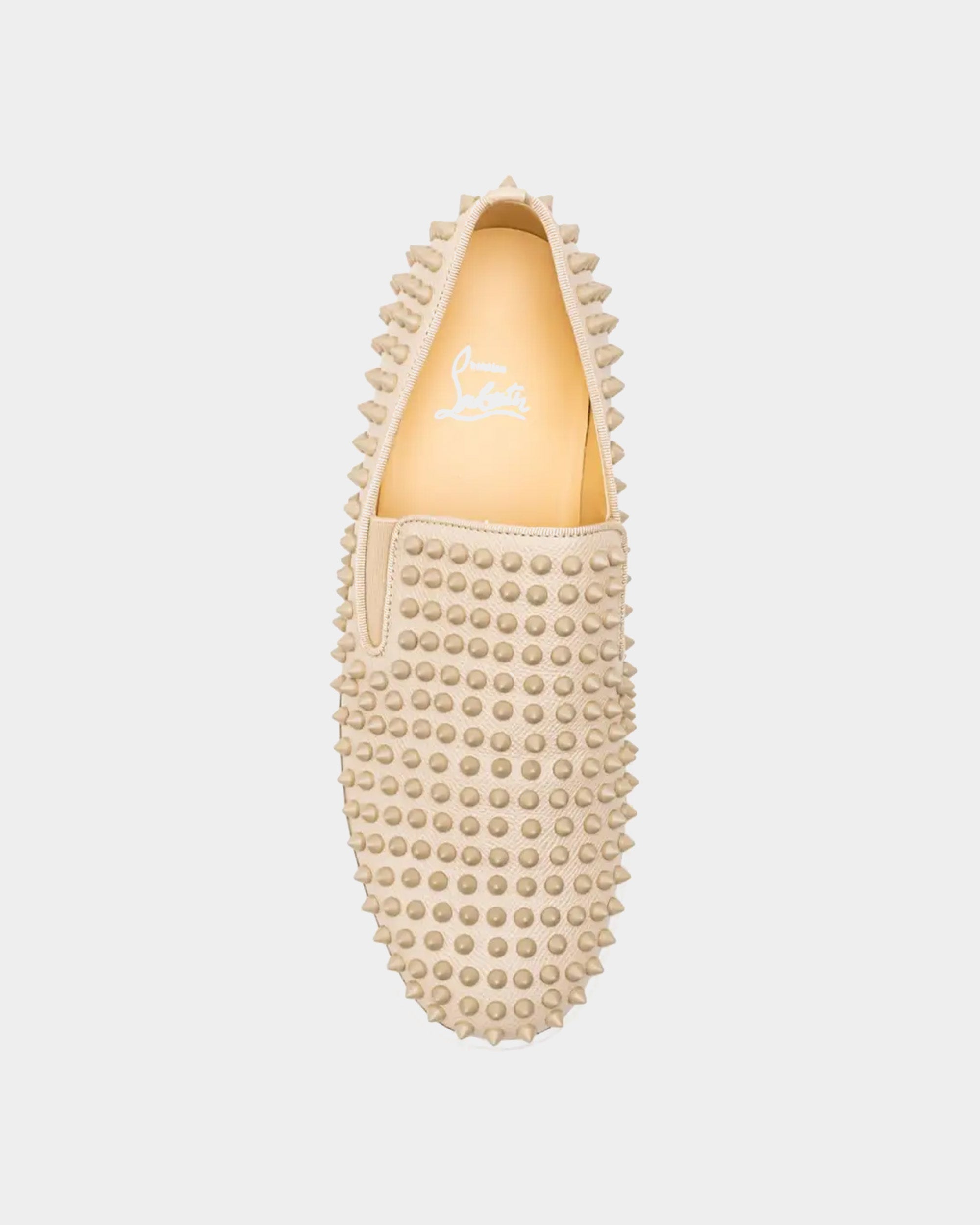 以光滑小牛皮鞋面覆蓋標誌性鉚釘裝飾,結合厚底設計,展現街頭感與高端工藝的強烈碰撞;米色調低調百搭,搭配標誌性紅底細節,無論日常休閒或潮流造型,都能成為吸睛焦點,展現獨特個性與自信態度。