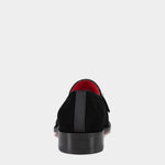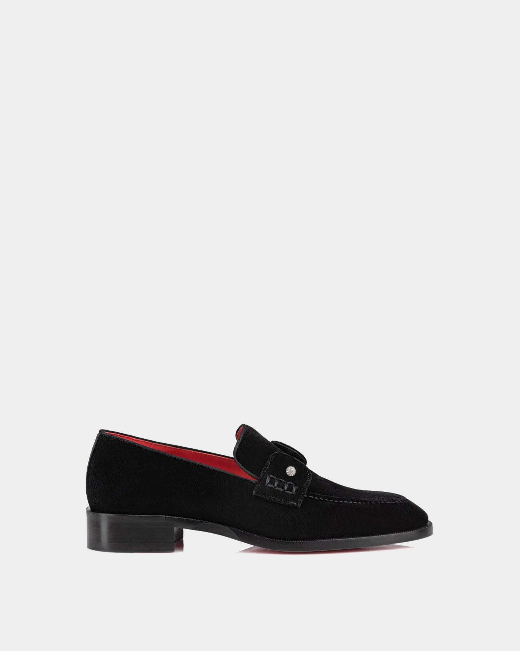 以柔軟天鵝絨材質搭配經典便士鞋型,鞋面飾有低調水鑽細節,展現內斂中的奢華;紅色皮革內裡與標誌性紅底相呼應,為正式西裝或晚宴造型增添獨特辨識度,是紳士衣櫃中不可或缺典雅單品。