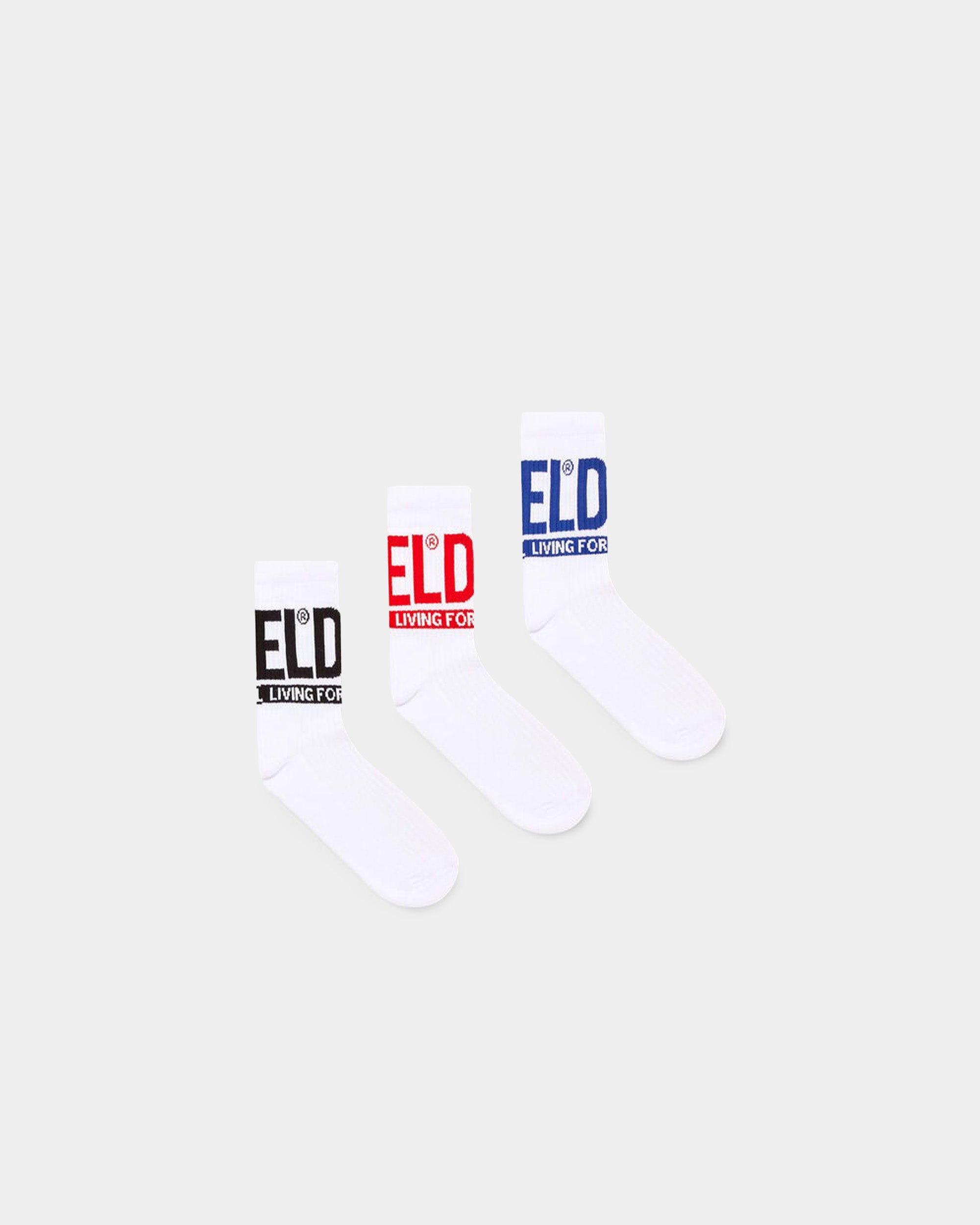 這款三件組襪子採用彈性有機棉混紡材質,提供舒適的穿著體驗。每雙襪子均在襪口處織有「Diesel For Successful Living」的 jacquard 字樣,展現品牌獨特的設計風格。顏色搭配多樣,易於與其他服裝搭配,適合日常穿著。