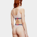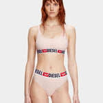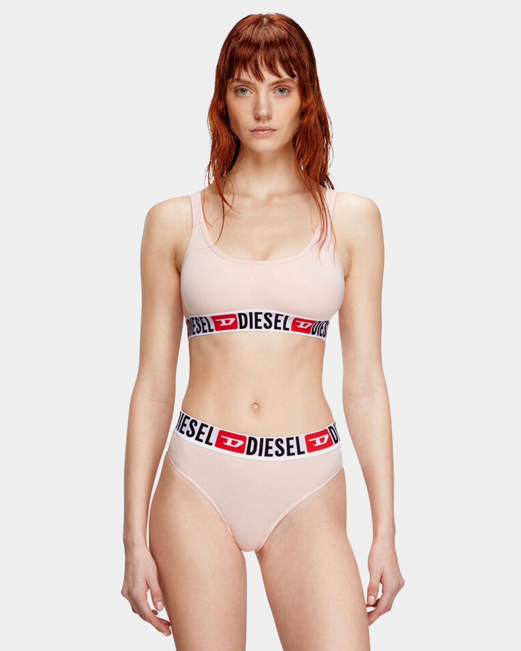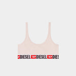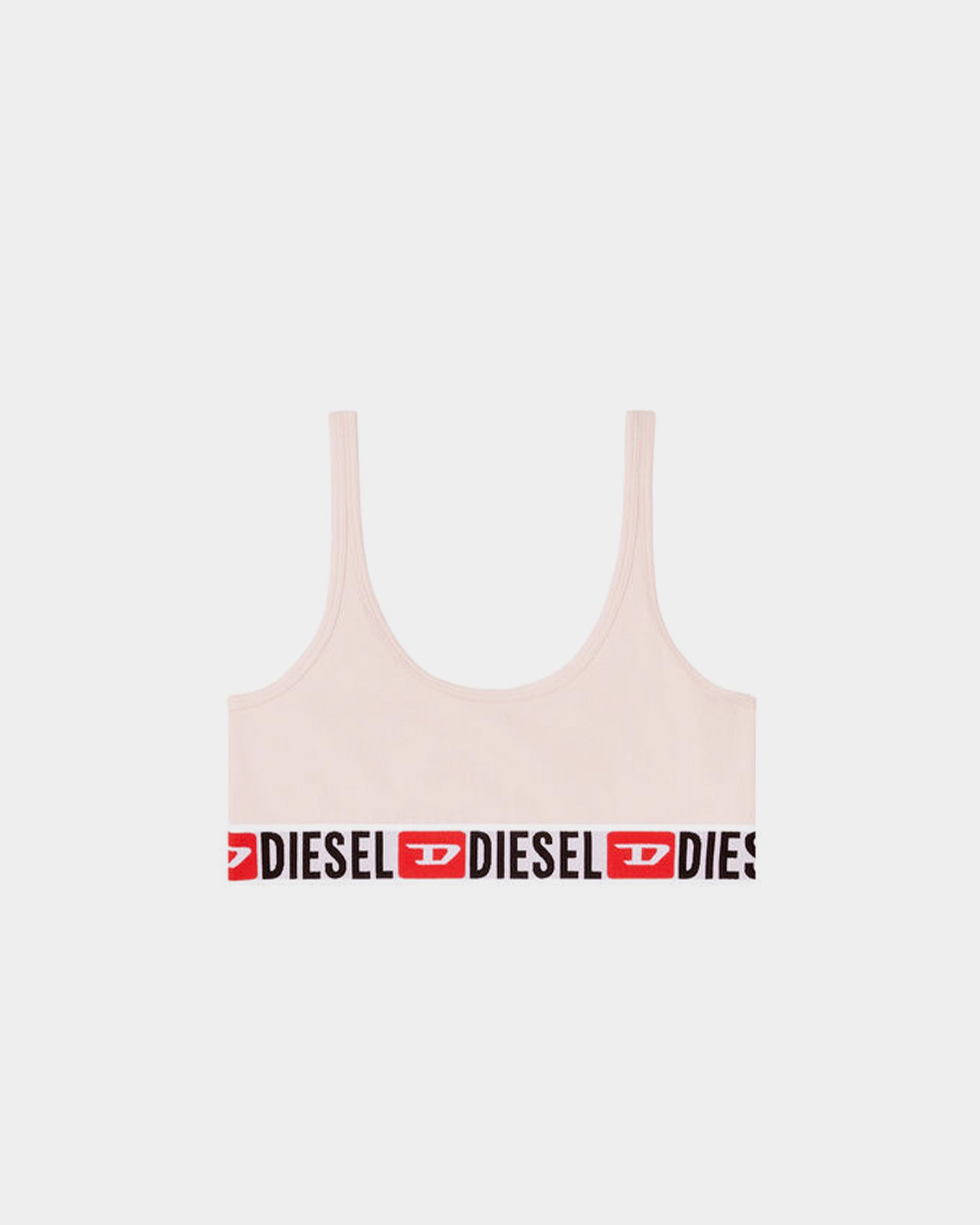 這款 UFSB-ORIBA 女款運動型內衣採用透氣的彈性棉質面料,提供舒適的穿著體驗。設計上採用圓領和寬鬆的彈性下圍帶,並印有 Diesel 和 D 字母標誌,展現品牌獨特的設計語言。該內衣為套頭設計,適合日常穿搭或輕度運動場合。