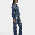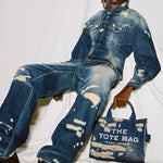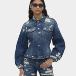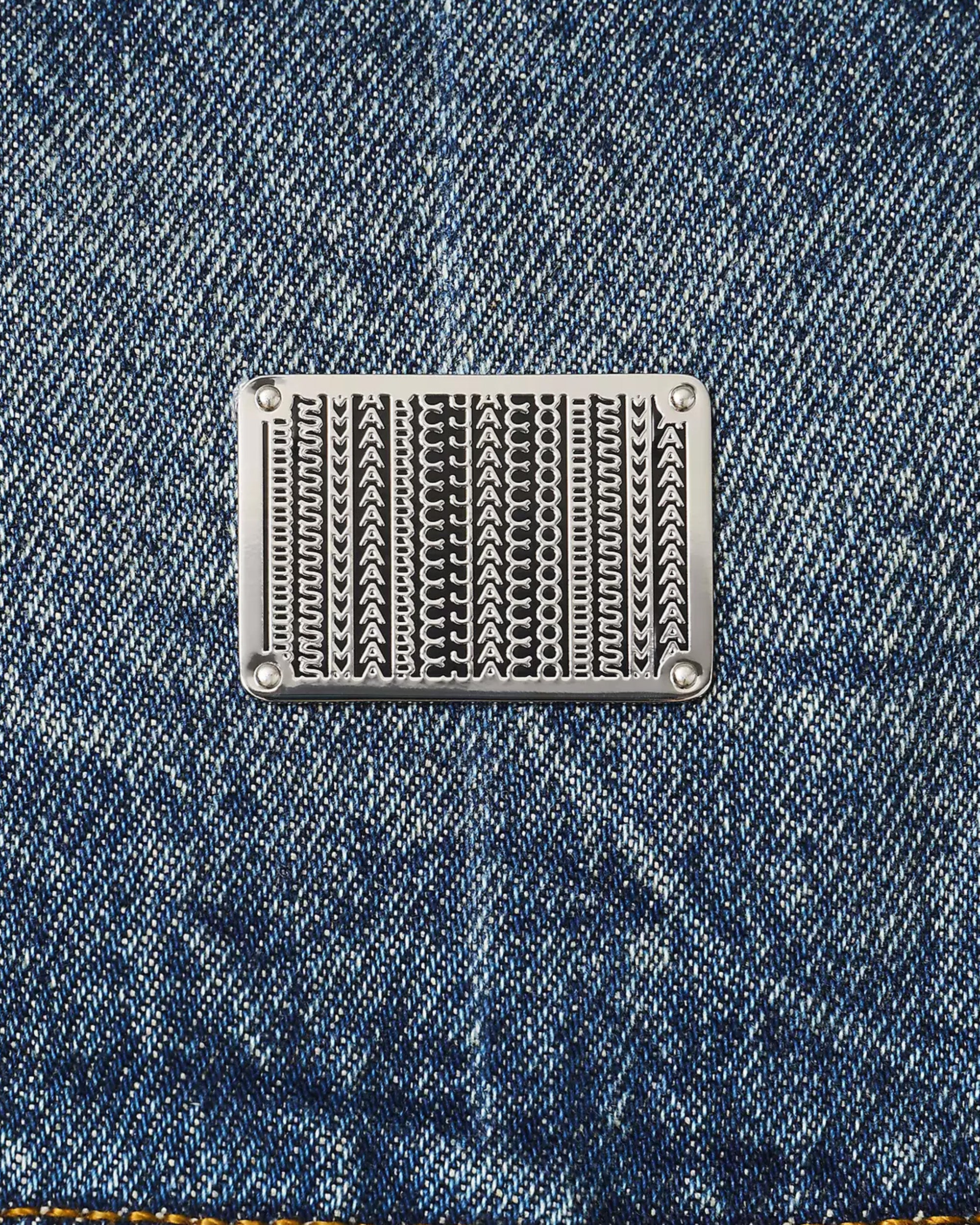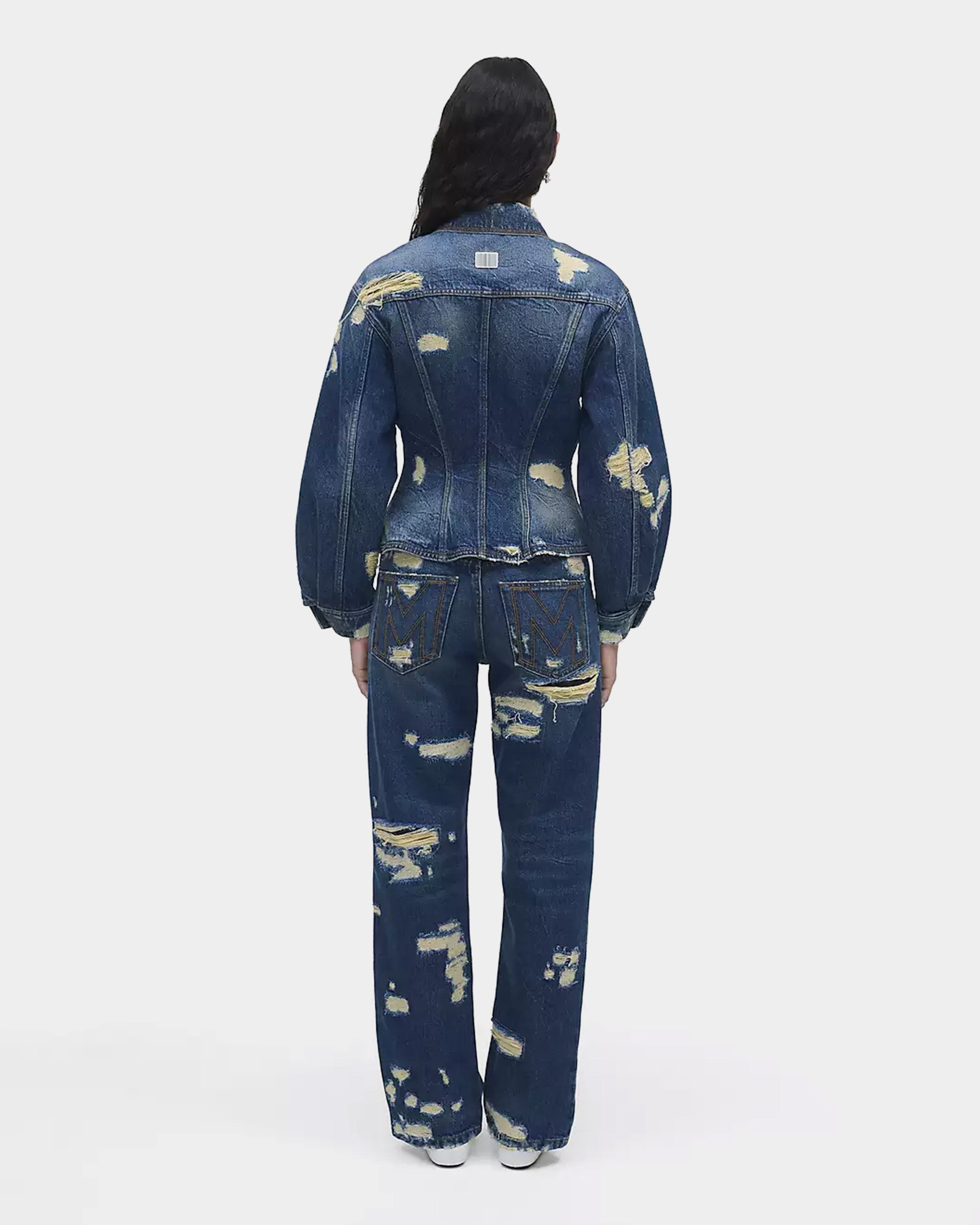 這款牛仔外套結合破壞修補工藝與荷葉細節設計,展現個性與女性化元素的對比美學。是一件兼具潮流感與設計感的單品。