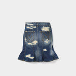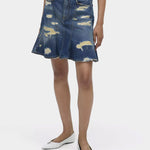這款迷你裙結合了破壞修補細節與荷葉裙擺設計,展現叛逆與甜美的雙重魅力。為日常或派對造型增添俏麗氣息。