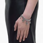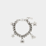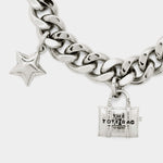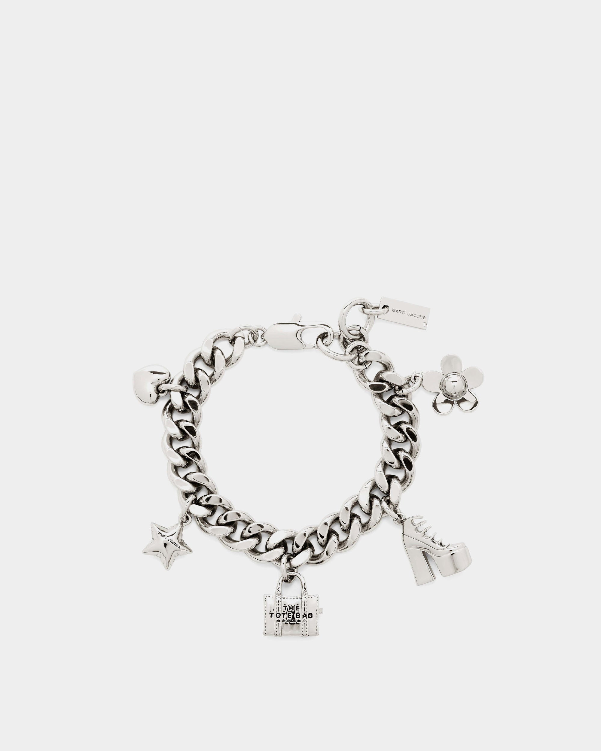 以銀色鍍層黃銅鏈條製作,多款經典 Marc Jacobs 標誌小吊飾垂掛其上,時尚又具品牌代表性。