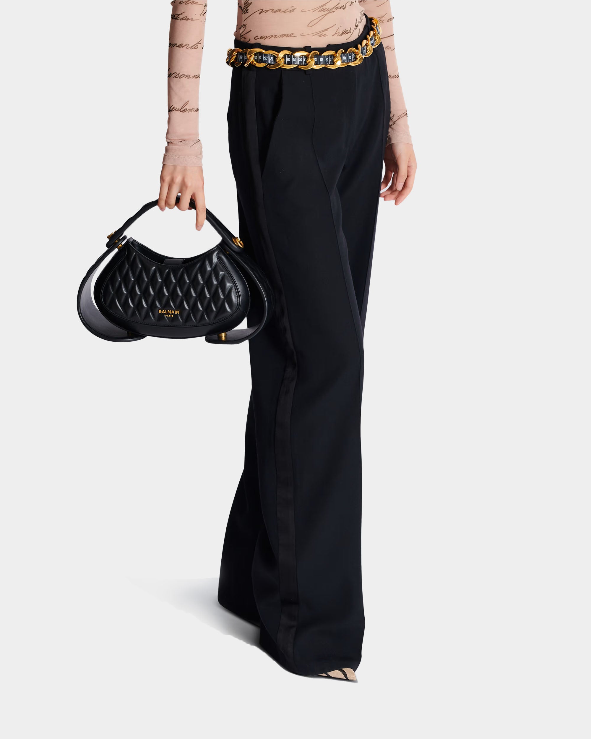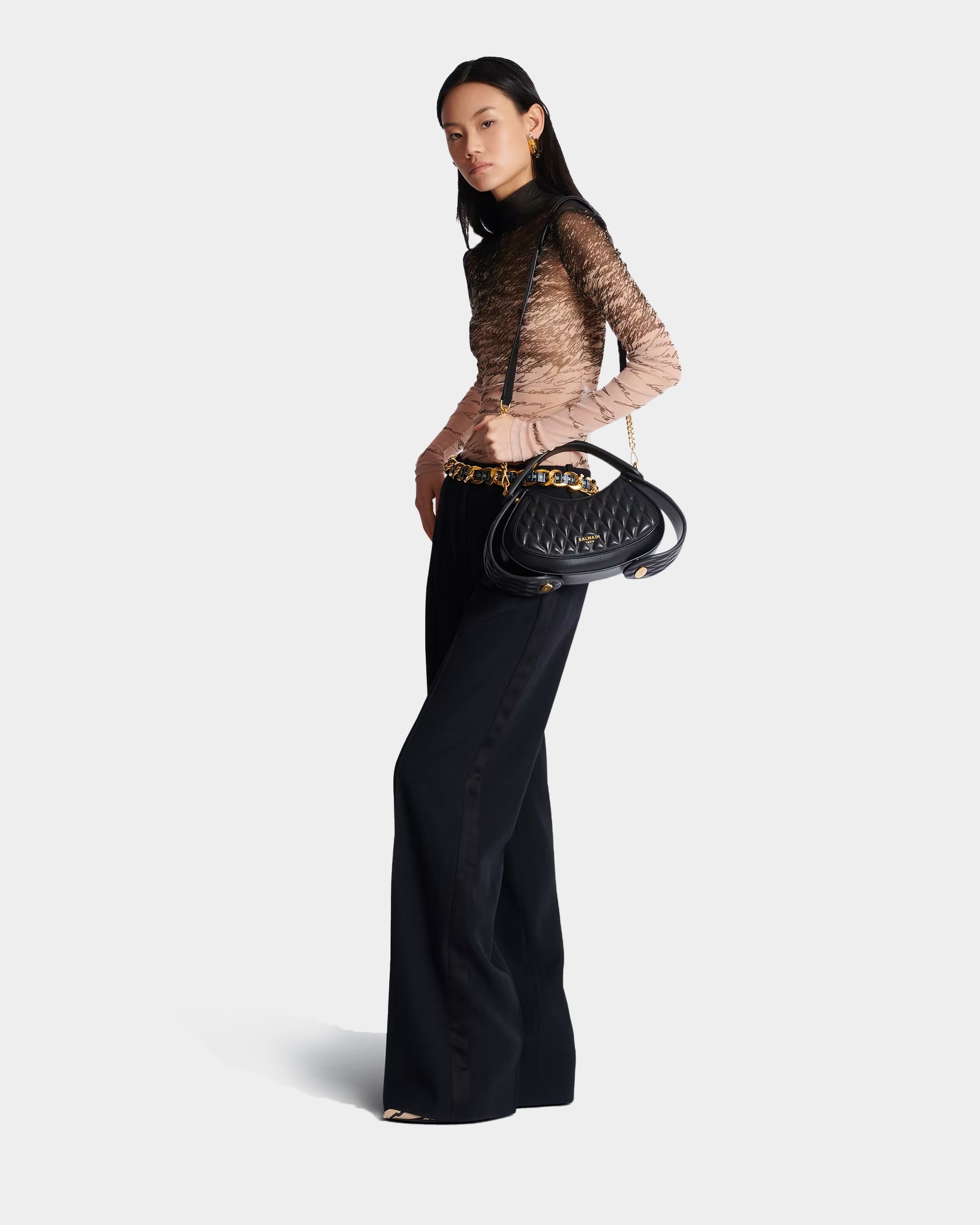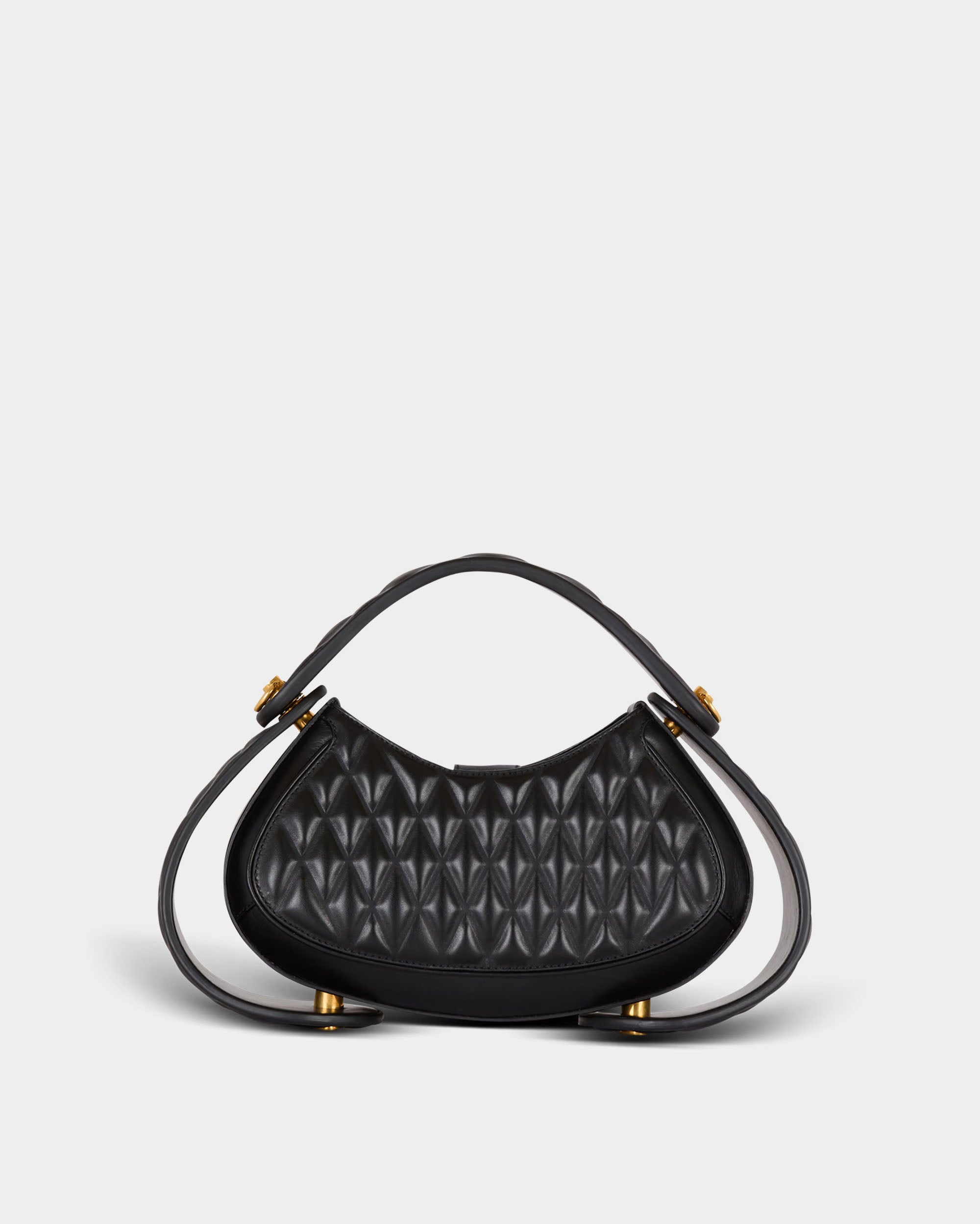 The Balmain Jolie Madame bag is a perfect blend of exquisite craftsmanship and versatile design, and is a symbol of luxury taste. This bag can be carried by hand, on the shoulder or across the body, and is paired with an adjustable and detachable leather and chain shoulder strap, making it easy to handle both daily wear and formal occasions. The metal Balmain Paris logo on the front highlights the brand's noble and luxurious temperament. The soft rubber handle and curved side design add a sense of delicate elegance. The shiny gold curved side details and magnetic buckle design are simple and modern. The interior is equipped with a leather card holder pocket and the Balmain embossed logo, and the exquisite details present an unparalleled luxurious style. No matter what style this bag is paired with, it is a perfect display of fashion and taste.