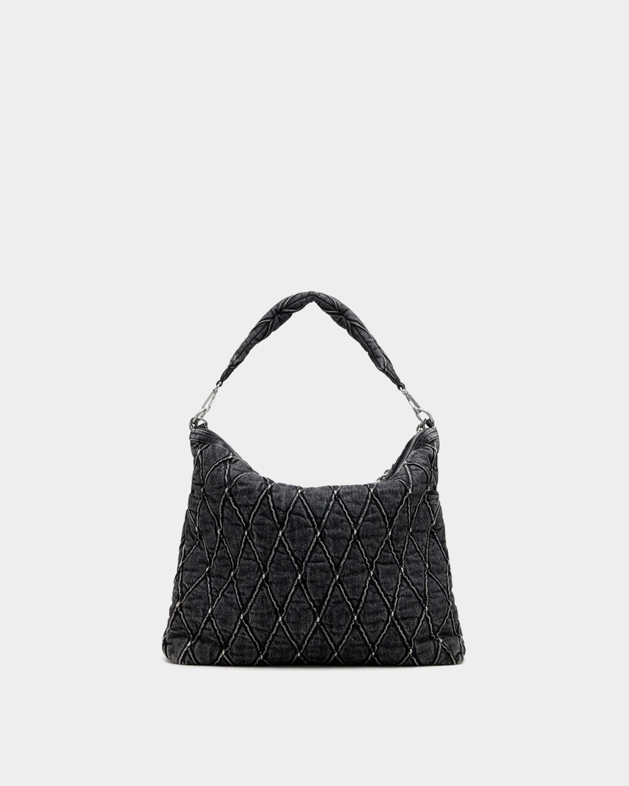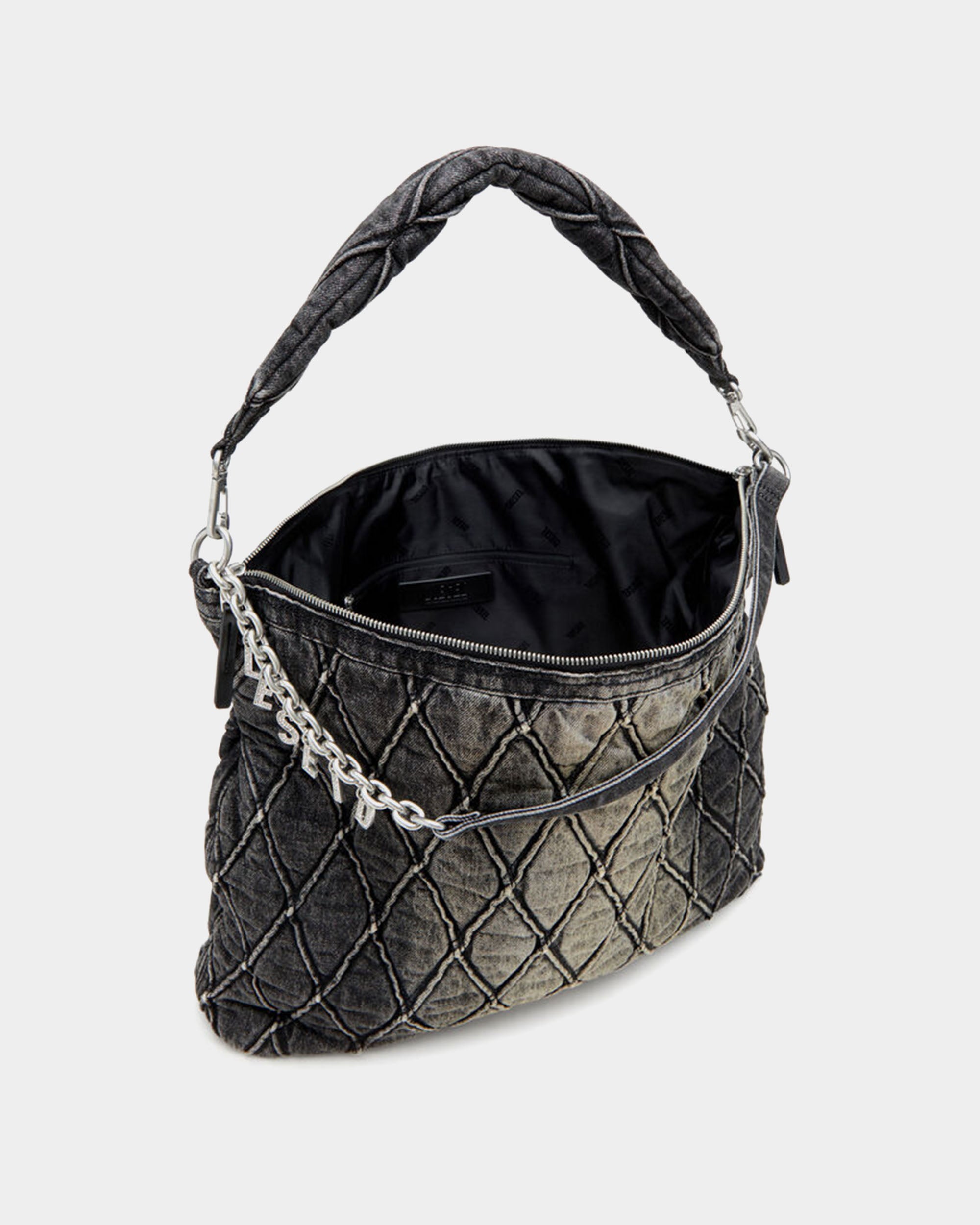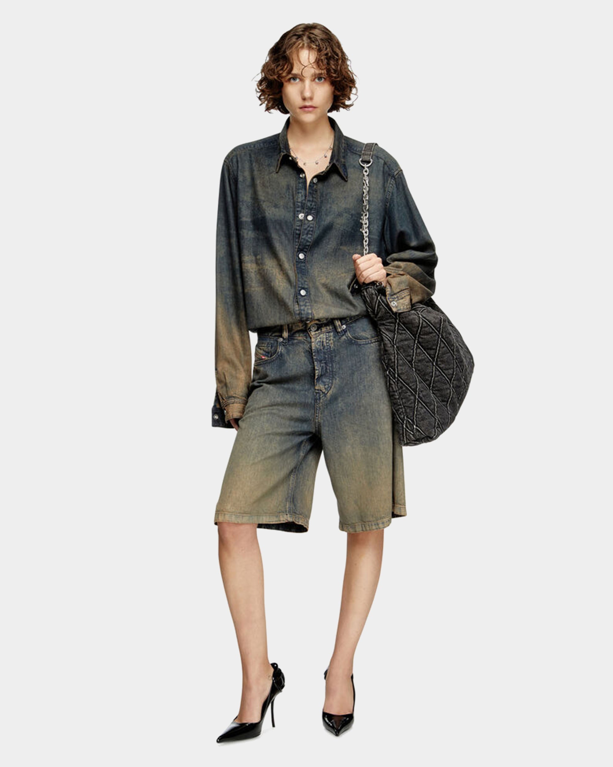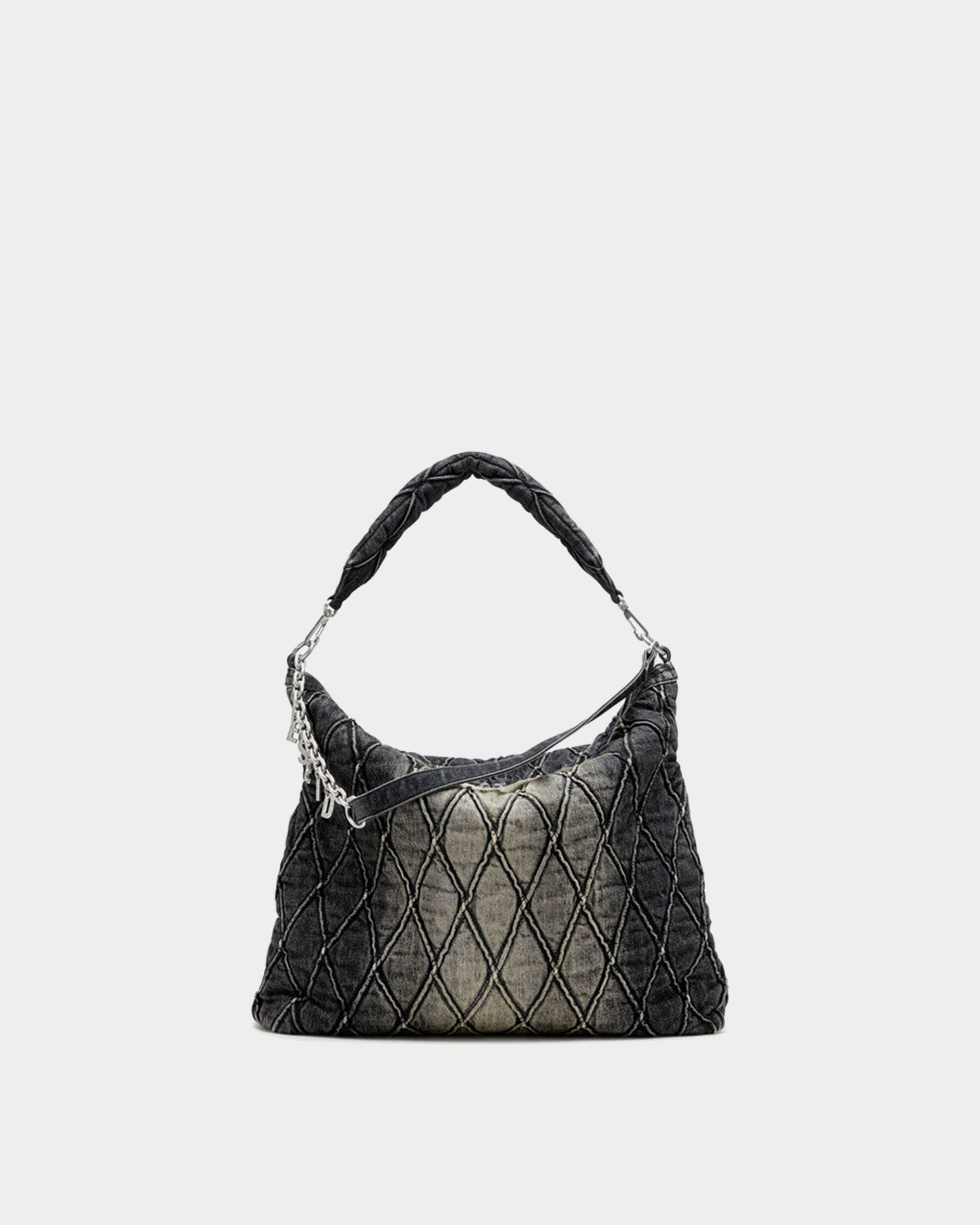 採用經典的菱格紋光面牛仔布,搭配髒洗效果,展現復古風格。包身設計簡約,配有可調節的金屬鏈條與牛仔布肩帶,並飾有鑲水晶的金屬 Diesel 標誌,增添時尚感。