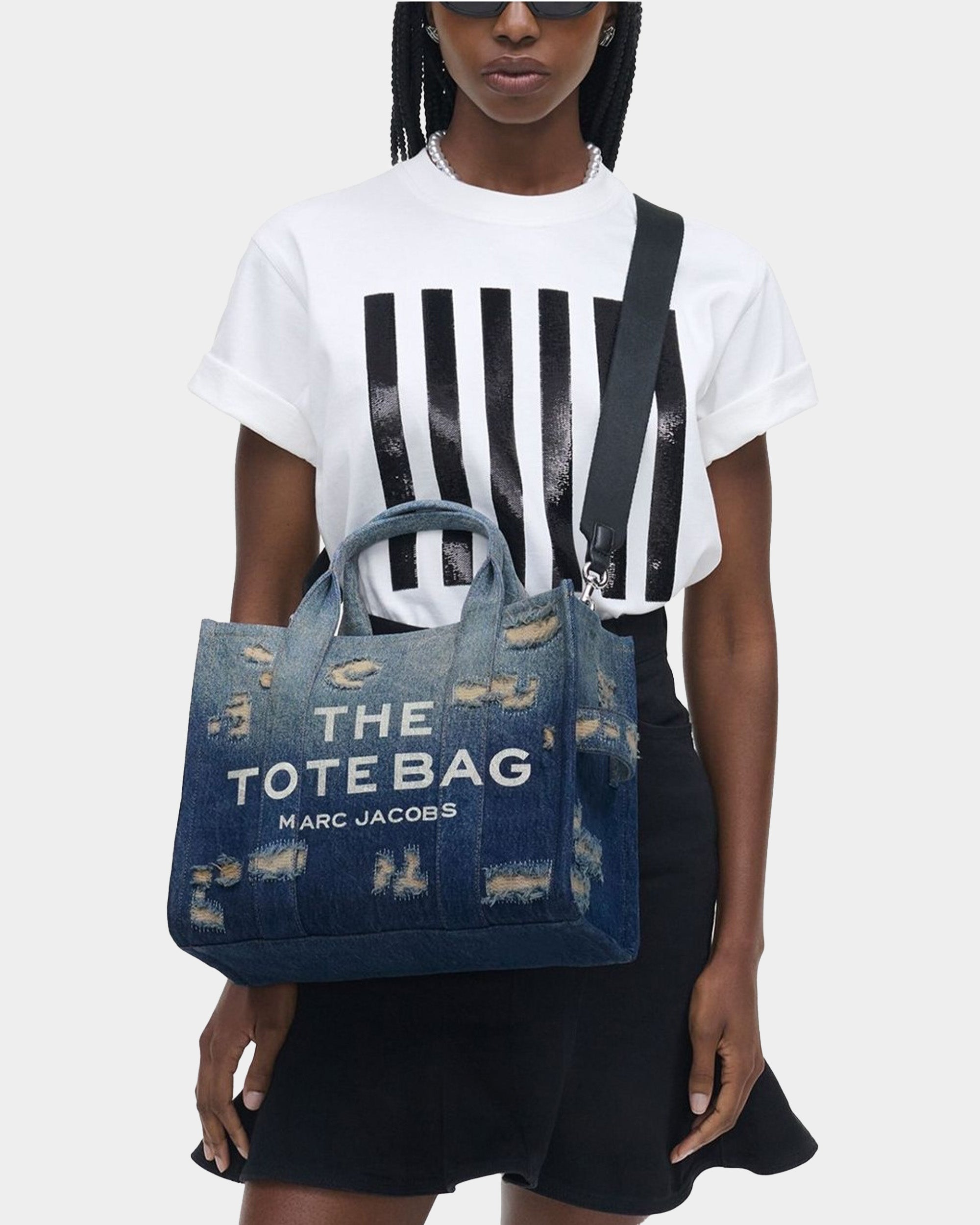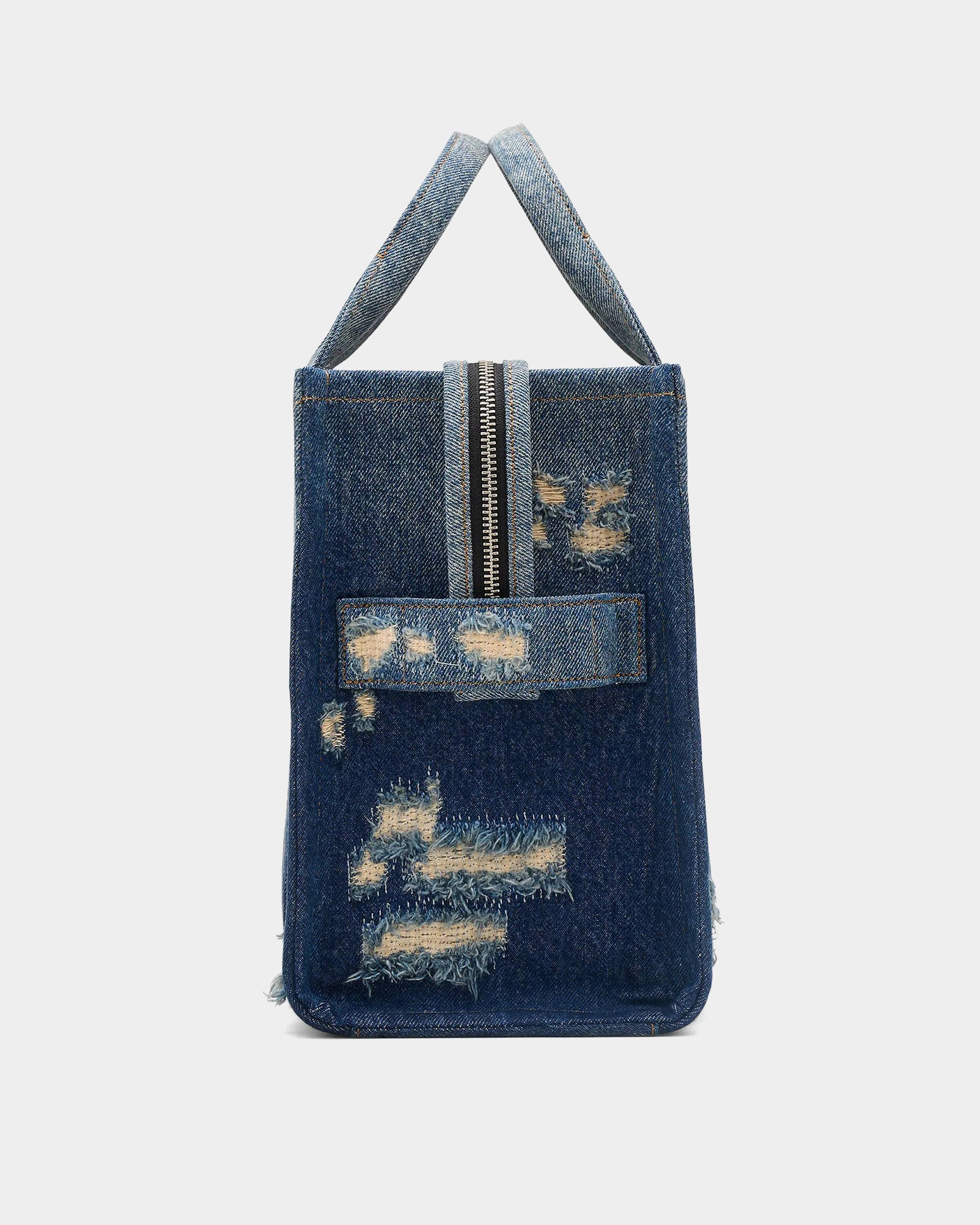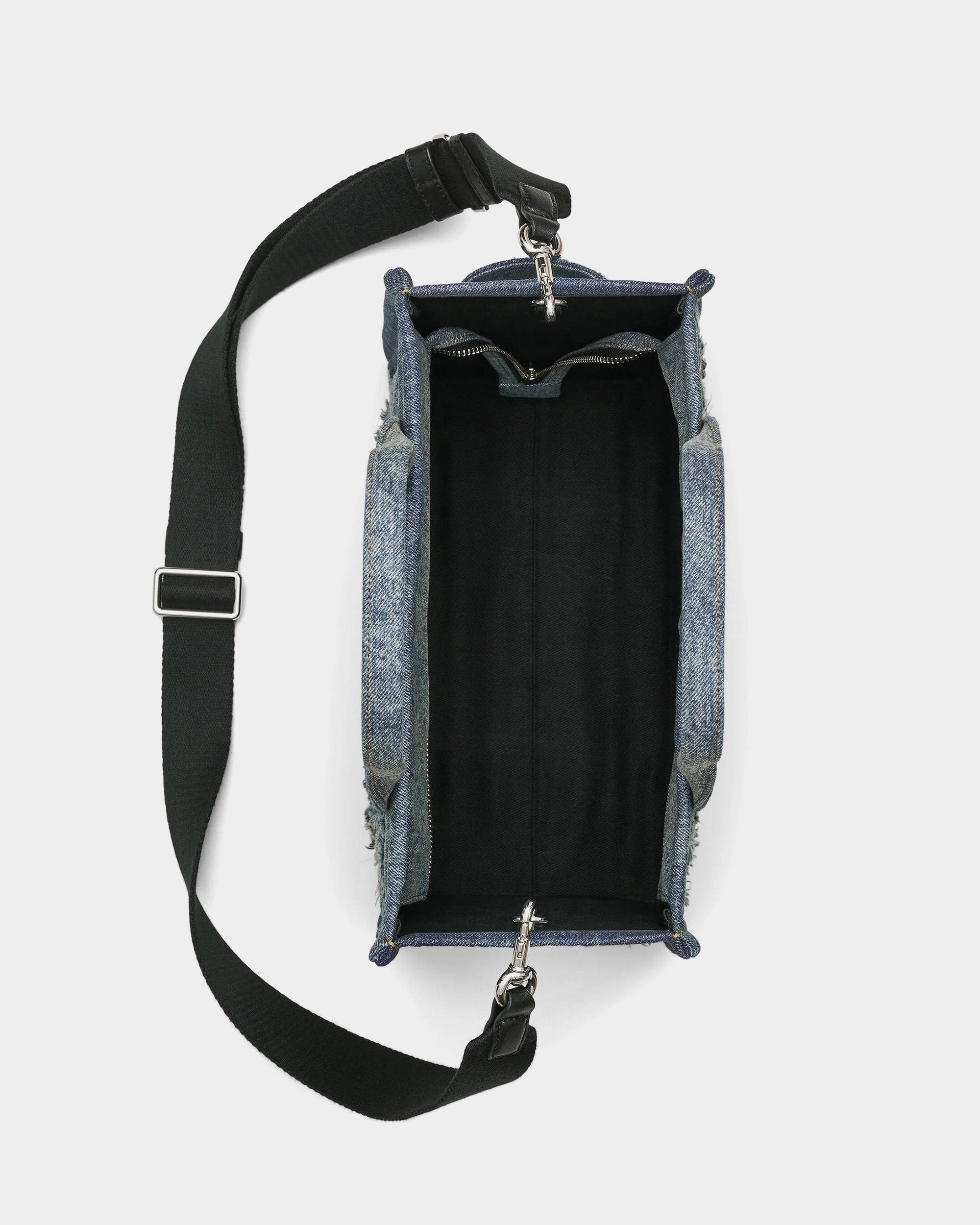 以 100% 棉牛仔布打造,經手工做舊、塗刷破壞效果,配有厚實拉鍊開合與可調可拆肩背帶,兼具時尚質感與日常實用性。