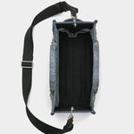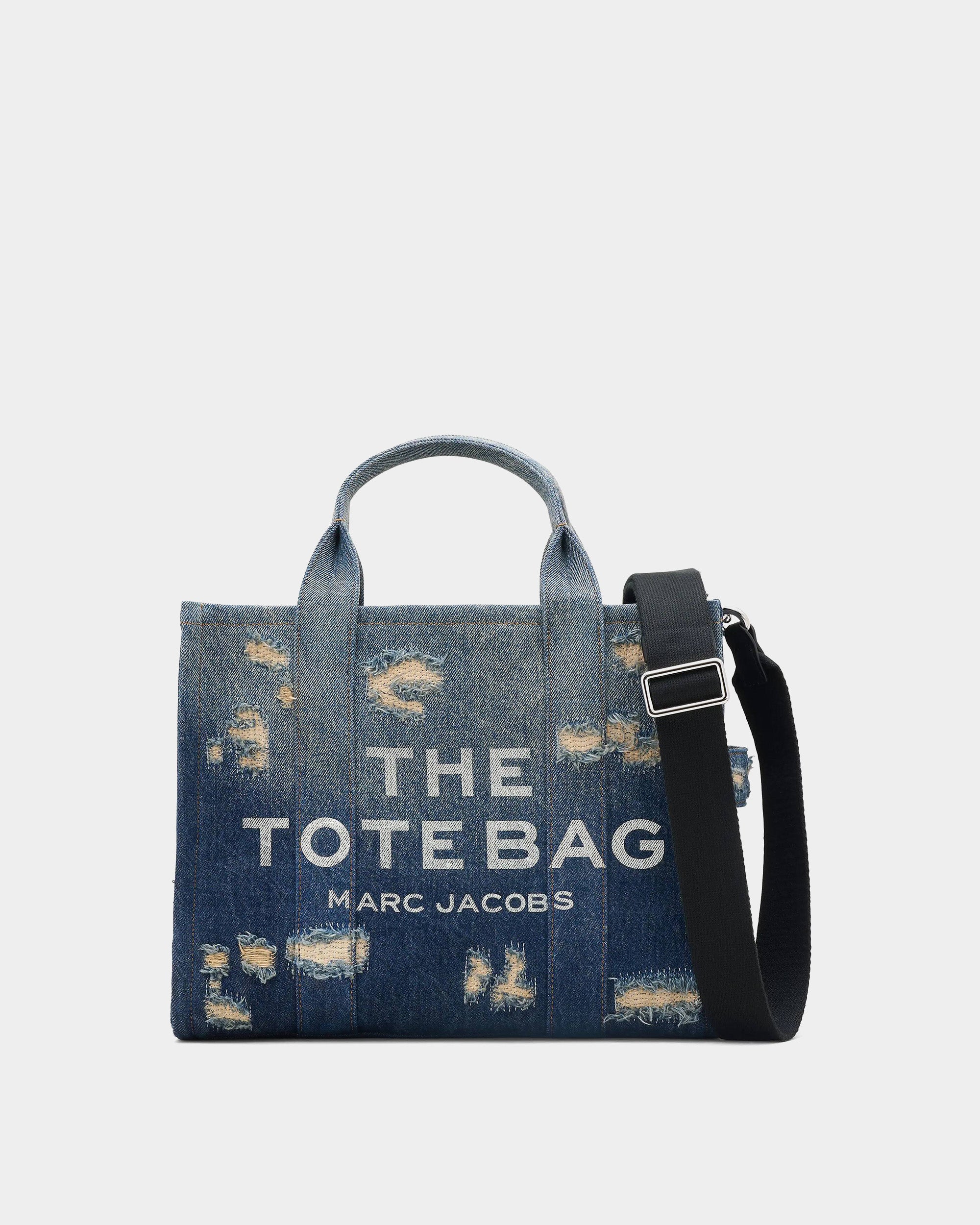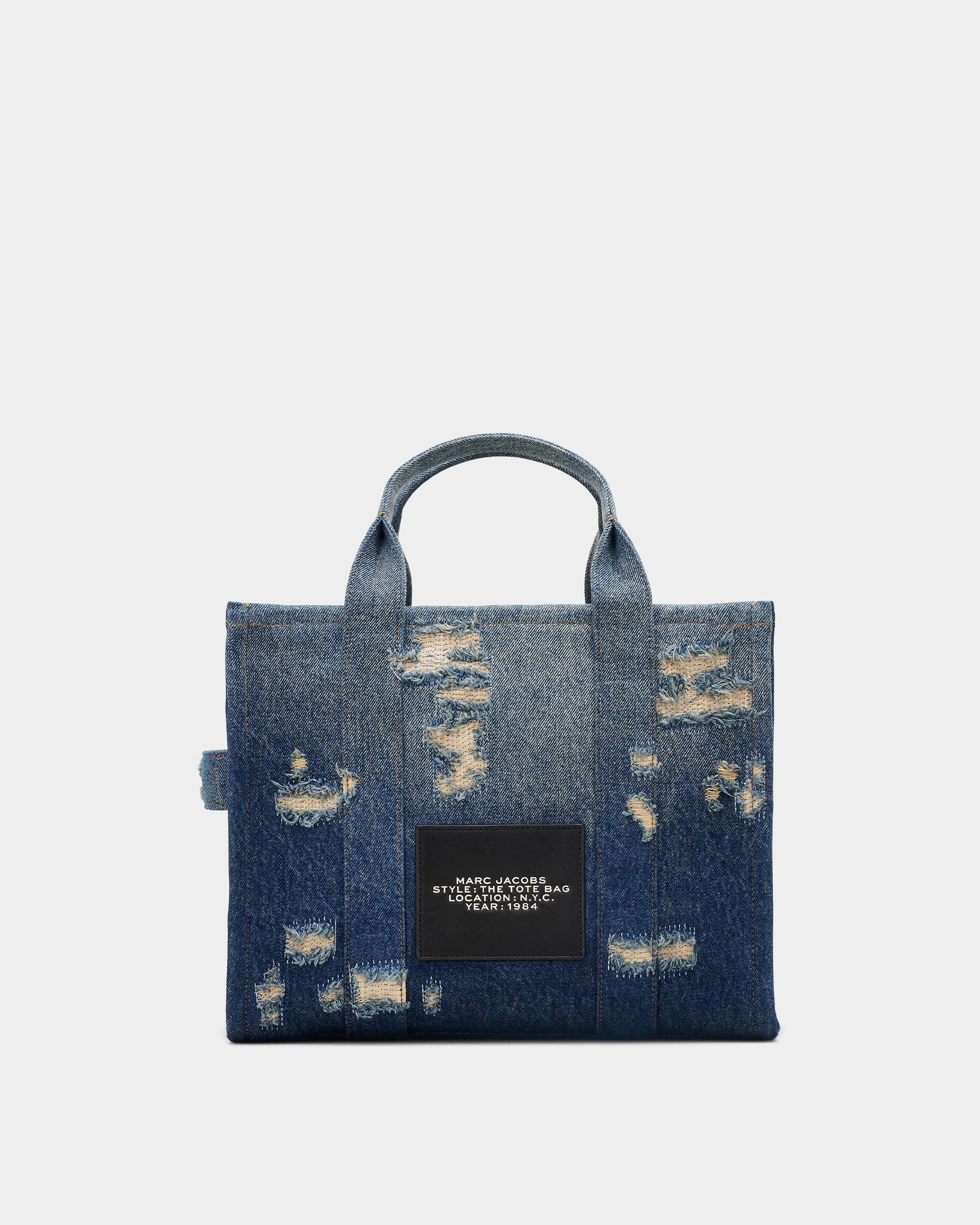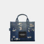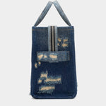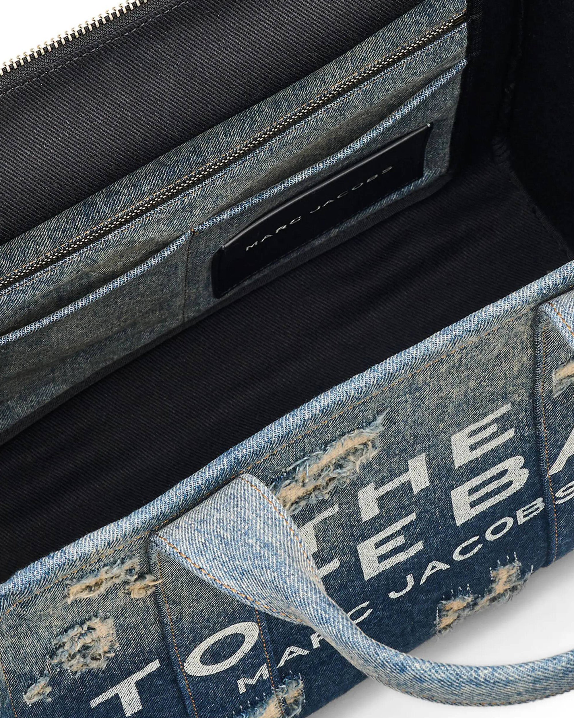 以 100% 棉牛仔布打造,經手工做舊、塗刷破壞效果,配有厚實拉鍊開合與可調可拆肩背帶,兼具時尚質感與日常實用性。