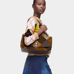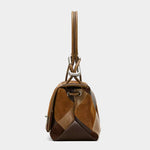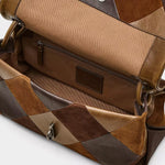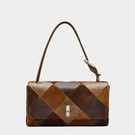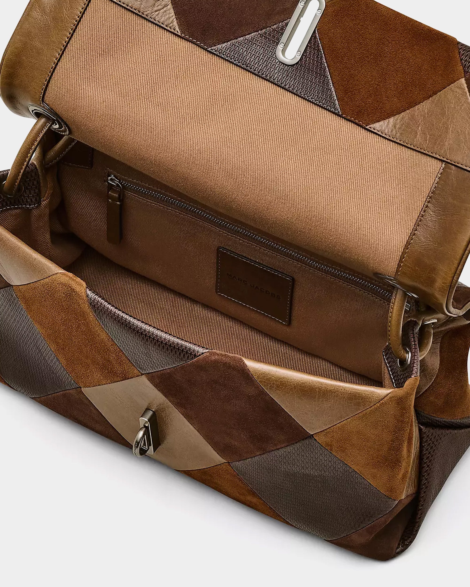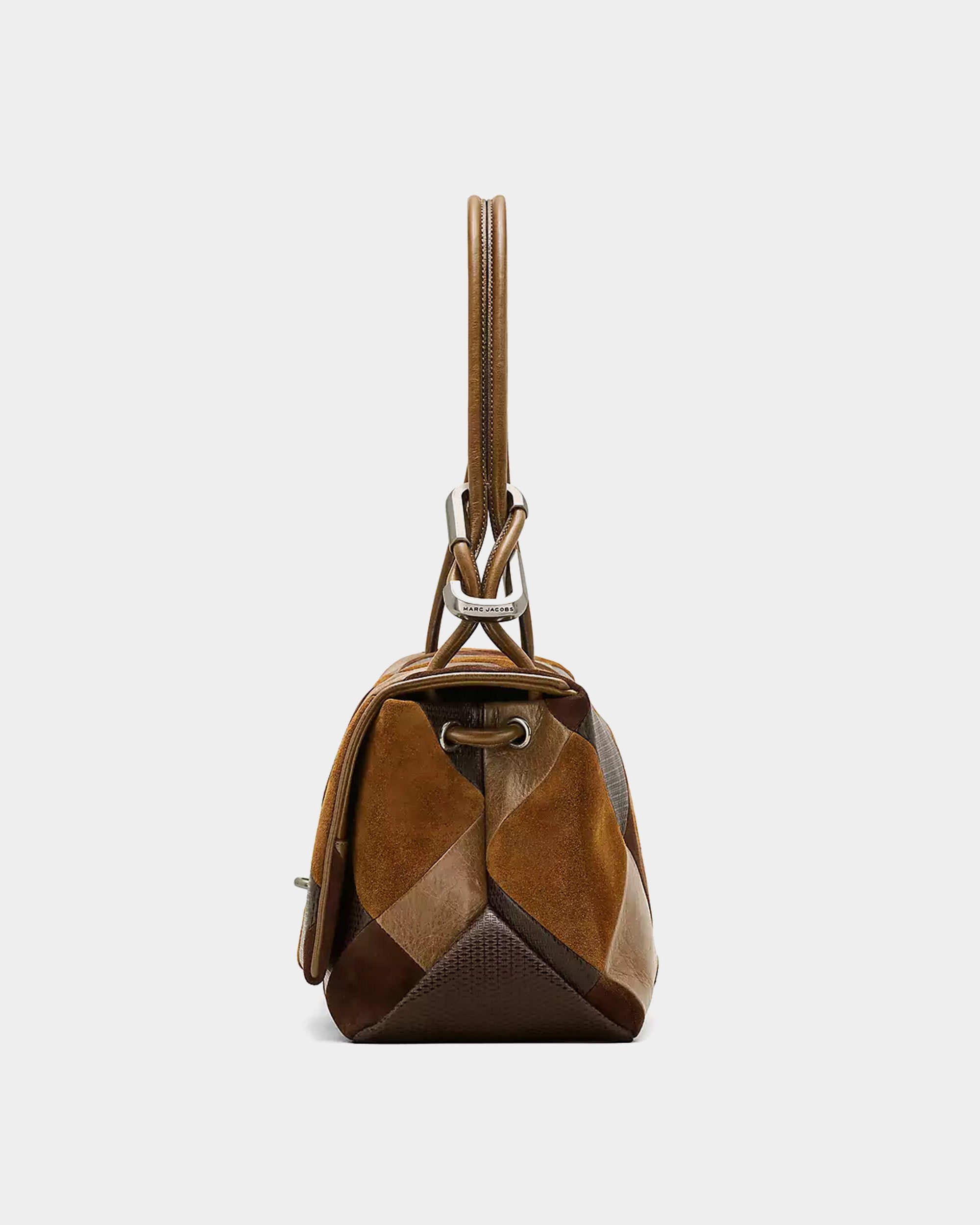 幾何拼接麂皮結合光滑皮革飾邊,展現 MARC JACOBS 經典的復古奢華氣息。大面積的菱格拼接設計以深淺棕色交錯呈現立體層次,搭配銀色旋扣細節,散發高級質感。包身容量寬敞,內層設有拉鍊與貼袋,長肩帶設計讓攜帶更舒適,是兼具實用與造型感的秋冬亮點包款。