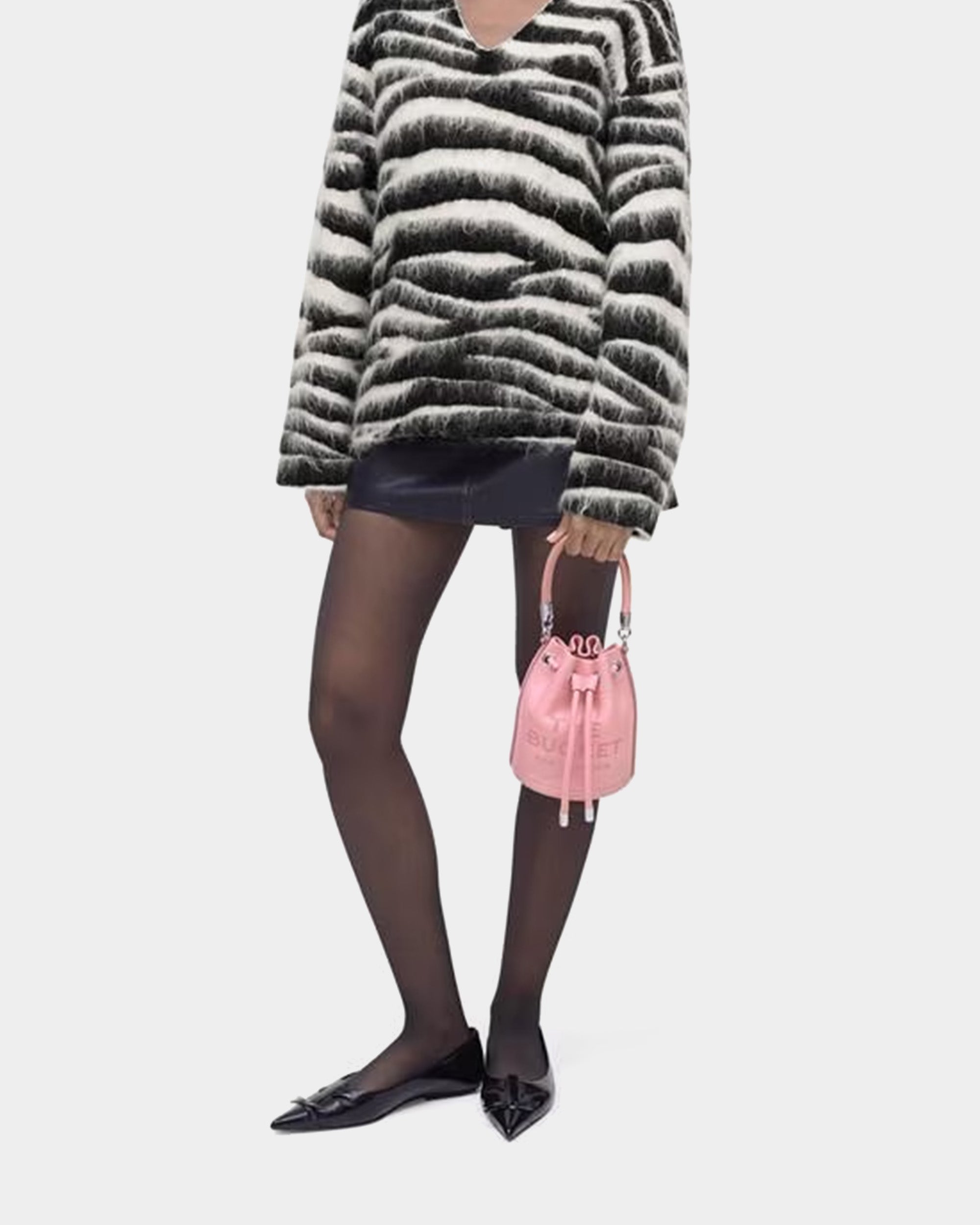 The classic bucket bag features a sleek leather body combined with metal eyelets and drawstring design, showing a sleek urban feel. The highlight is the detachable thick rope striped handle, which adds visual depth and fashion. The lightweight capacity makes it suitable for daily wear or urban casual style.