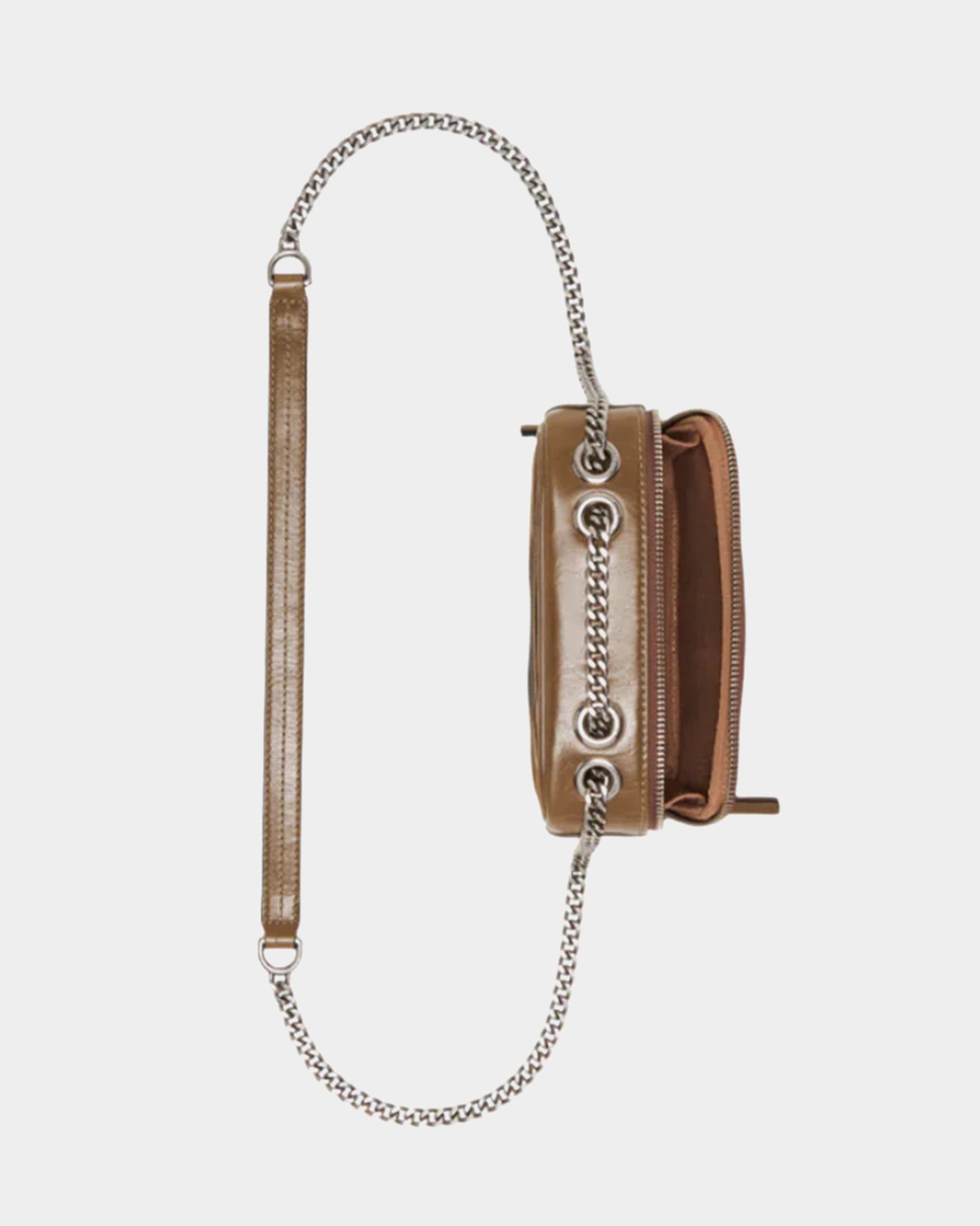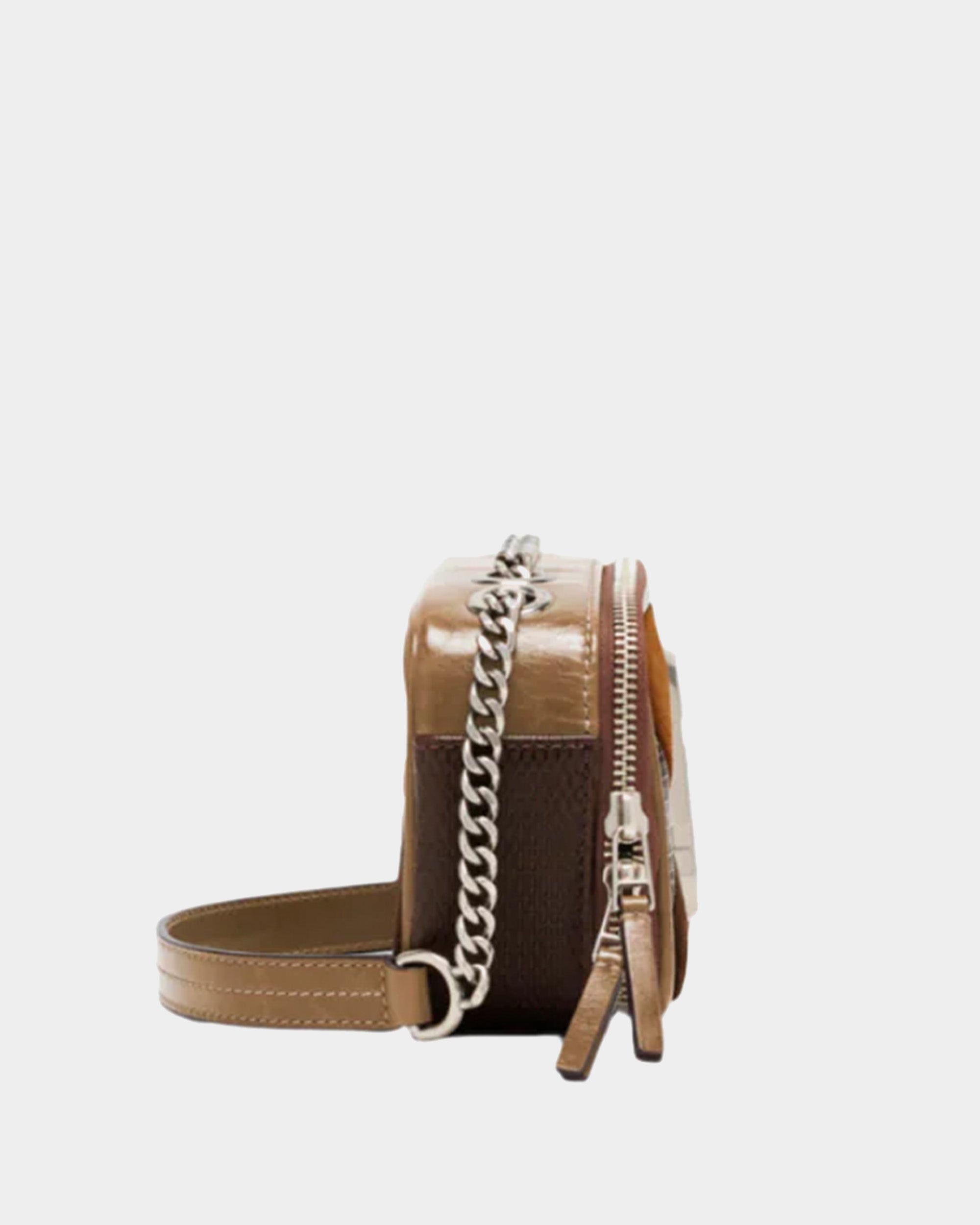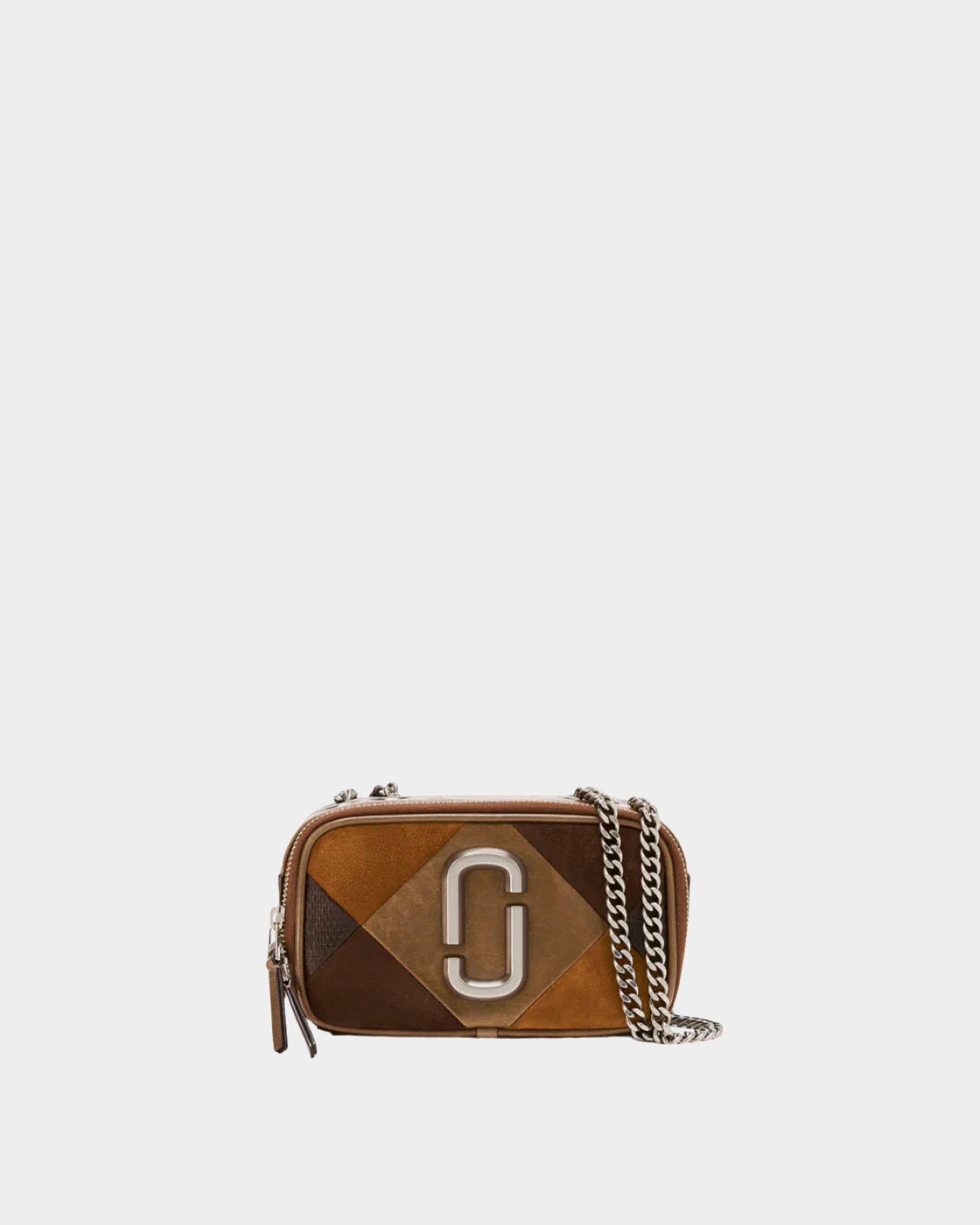 以幾何拼接麂皮打造,展現低調奢華質感。THE SOFTSHOT 系列以柔軟皮革結合立體結構著稱,此款以棕色調拼接設計增添層次,搭配銀色雙 J 標誌與金屬鍊帶,展現摩登都會氣息。雙層拉鍊主隔層設計方便收納手機與日常小物,是兼具實用與時尚的經典單品。
