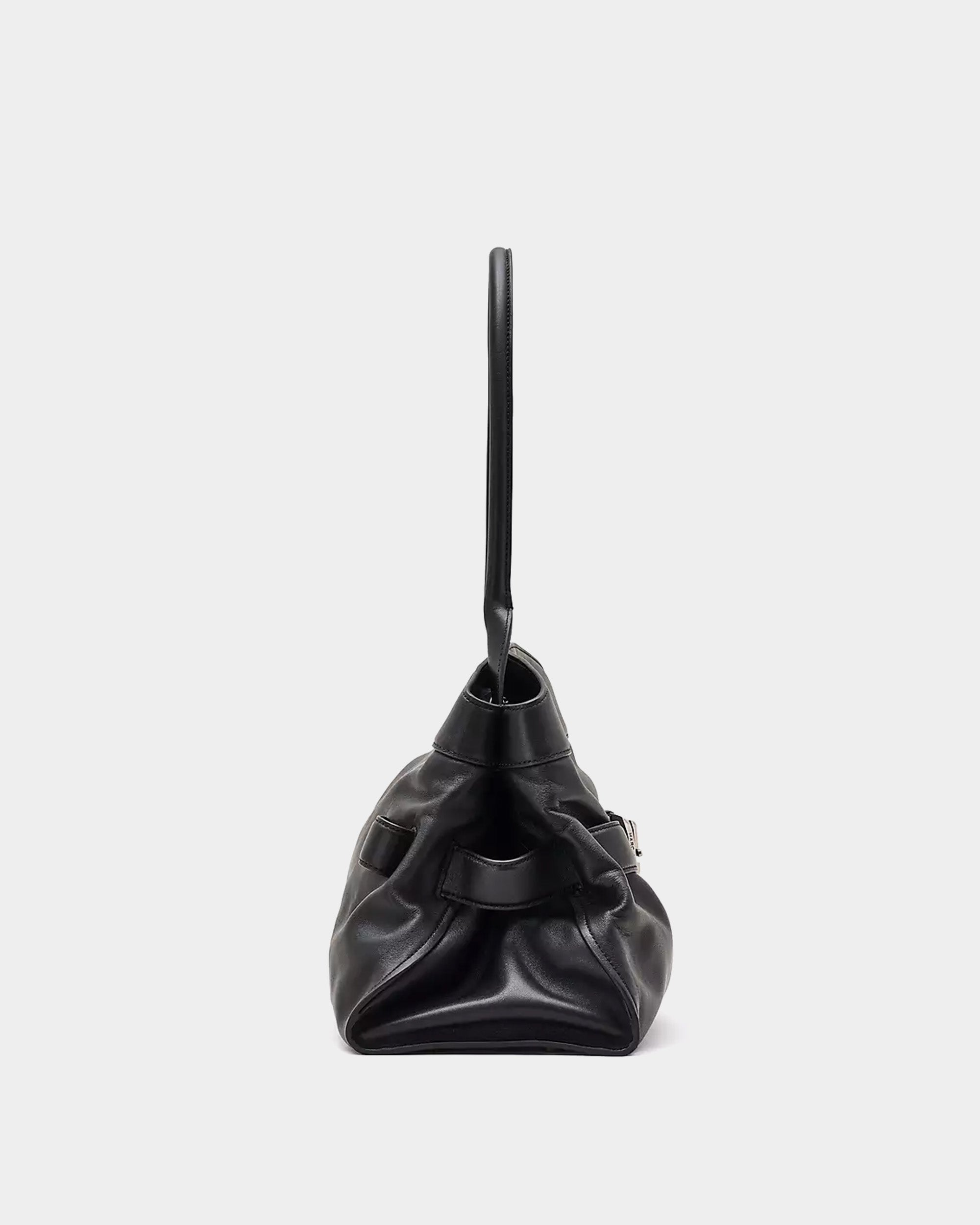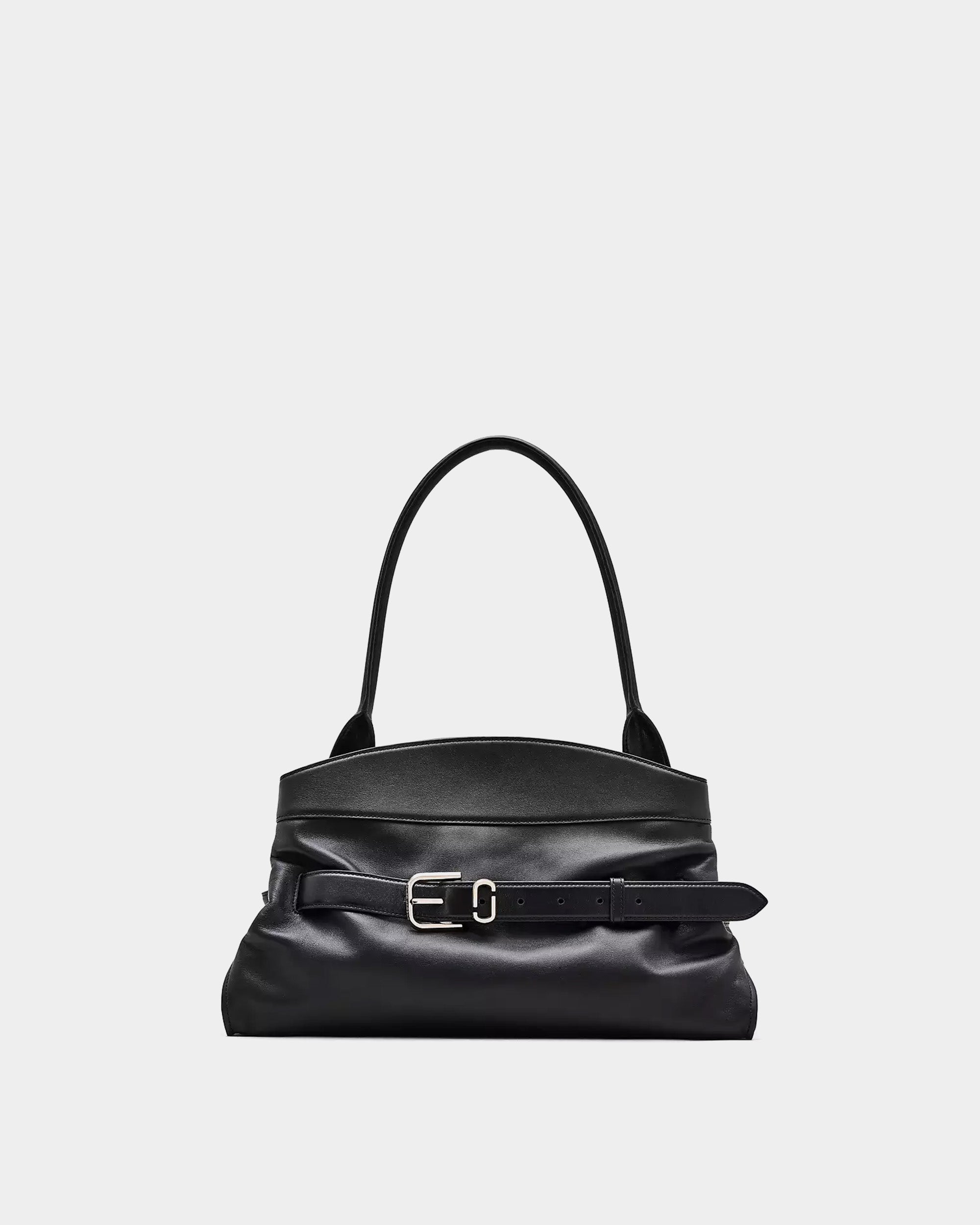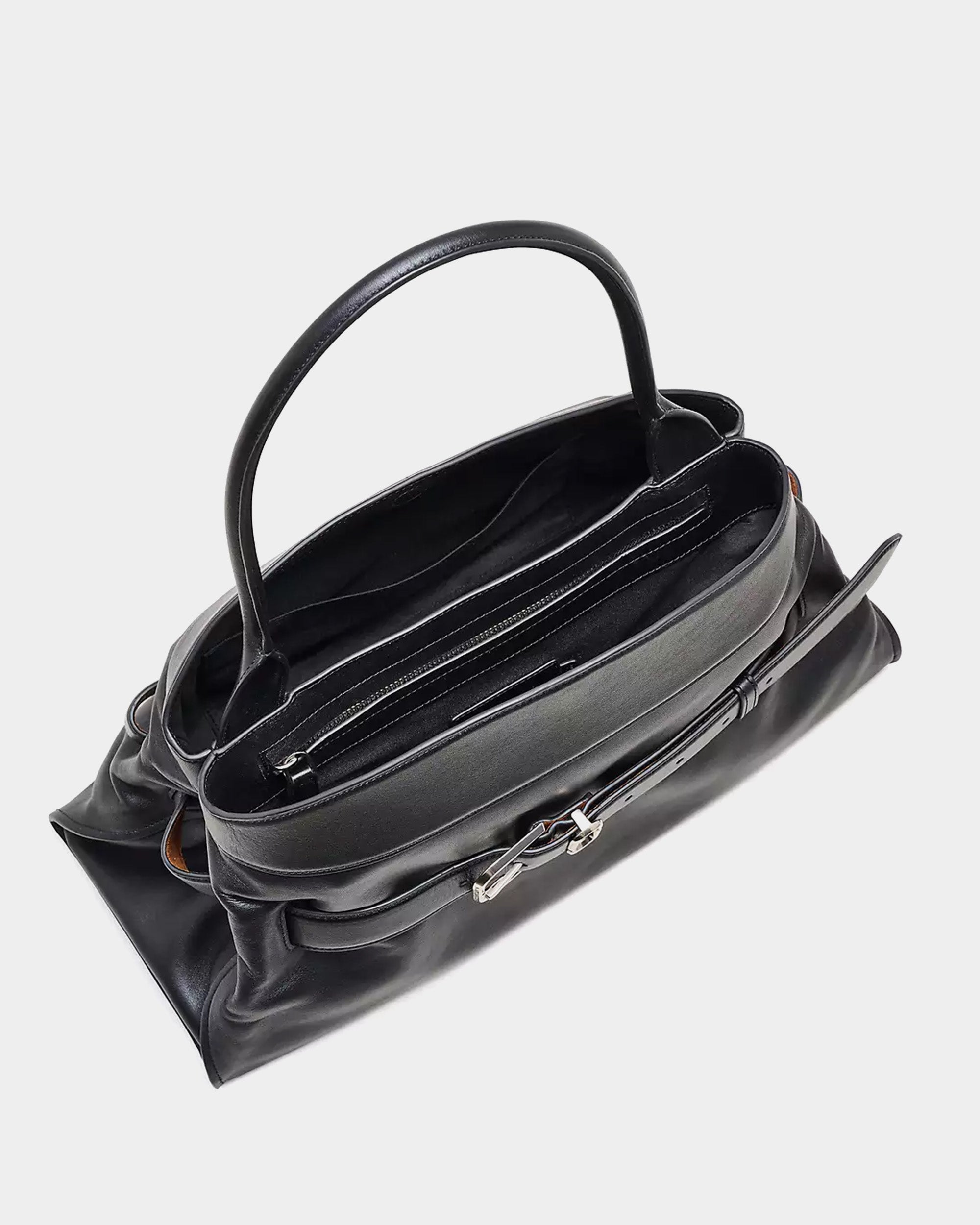 柔軟小牛皮打造,展現自然垂墜的優雅線條。包身以可調式皮革腰帶與金屬釦環點綴,散發復古又摩登的都會氣息。寬敞包內空間配置拉鍊口袋與收納層,搭配順滑皮革手把,無論通勤或正式場合皆能展現低調奢華。