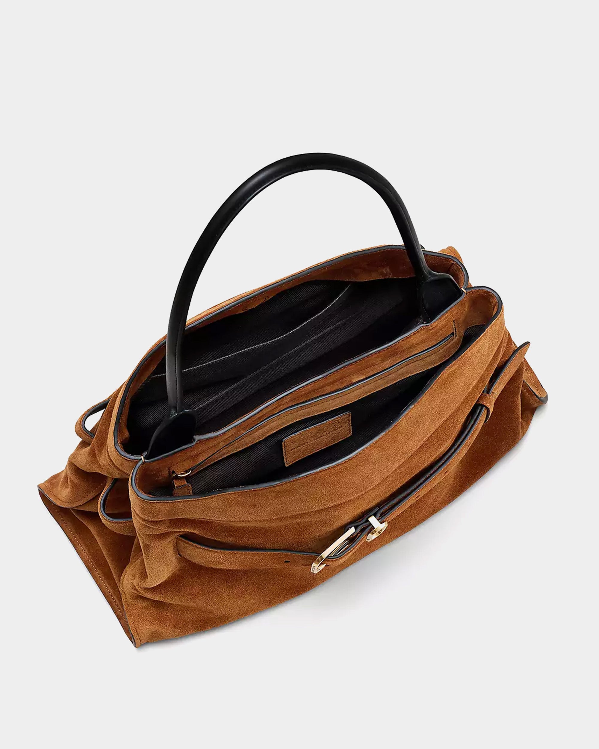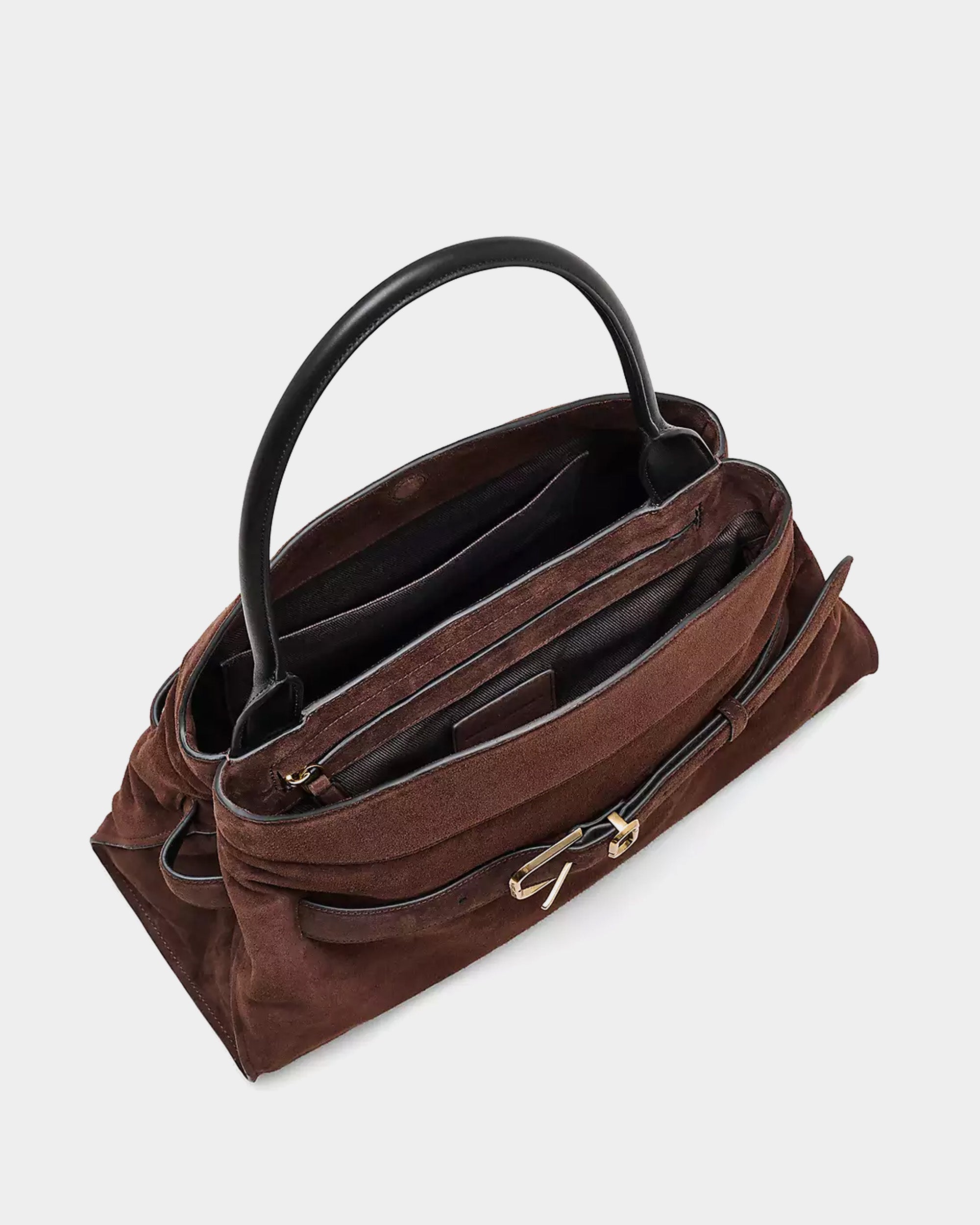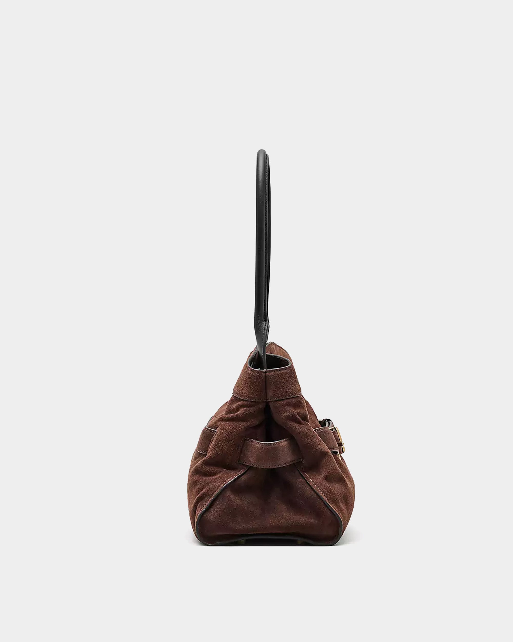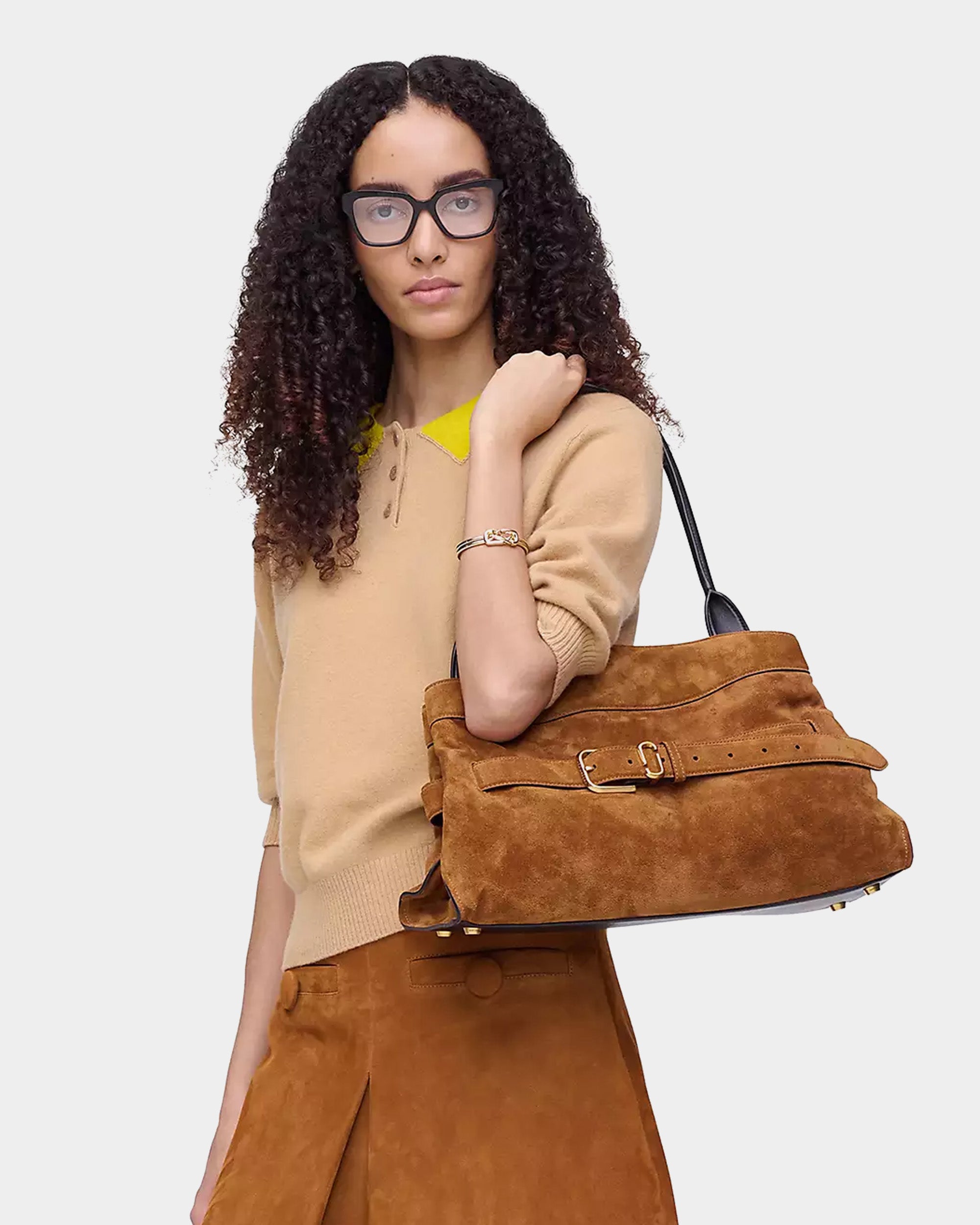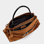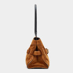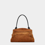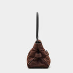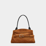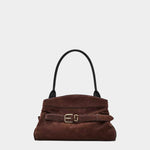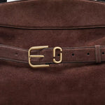 柔軟高級麂皮打造,呈現自然垂墜的優雅線條。包身以可調式皮革腰帶與金屬釦環點綴,展現復古與都會並存的風格。寬敞包內空間附有拉鍊口袋與多層收納,搭配光滑皮革手把,兼具實用與高級質感,為秋冬造型增添一抹沈穩魅力。