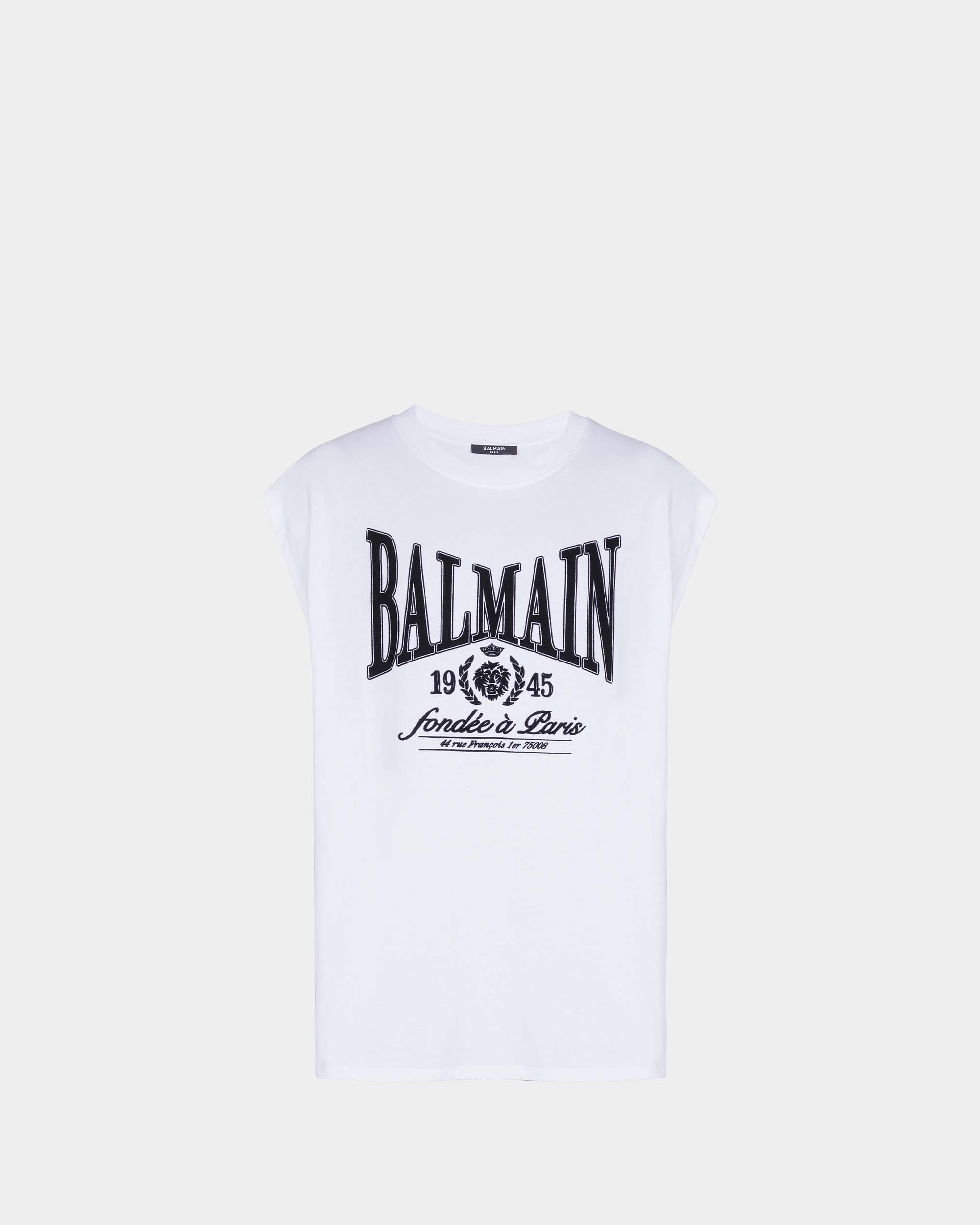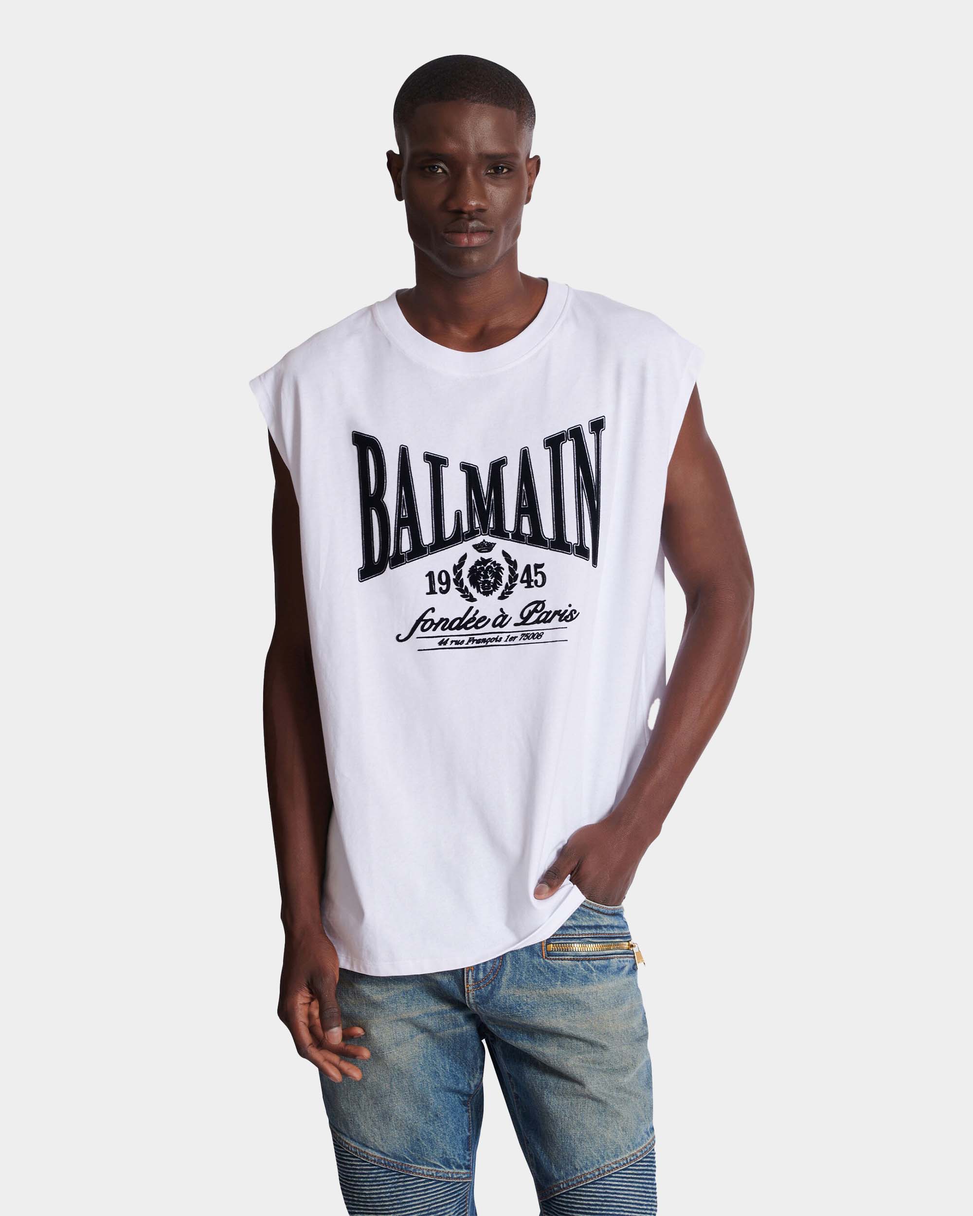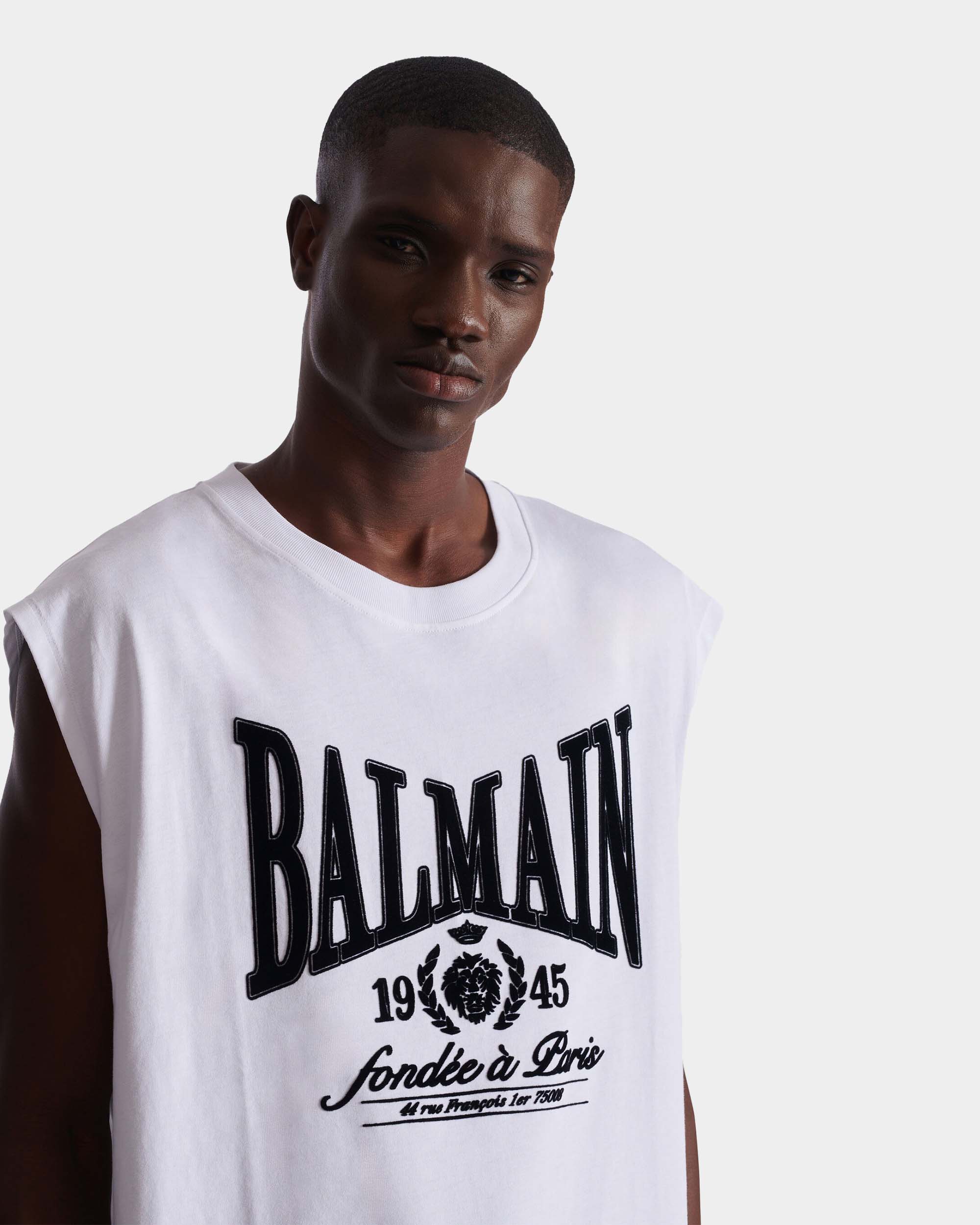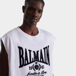 此款無袖背心以寬鬆剪裁呈現率性輪廓,正面「Balmain 1945」印花成為視覺焦點,展現鮮明風格態度。採用純棉針織布料製作,質地柔軟透氣,適合單穿或作為層次搭配。圓領設計與簡潔線條,使整體造型更顯俐落自然,是夏季與街頭風格穿搭的實穿單品。