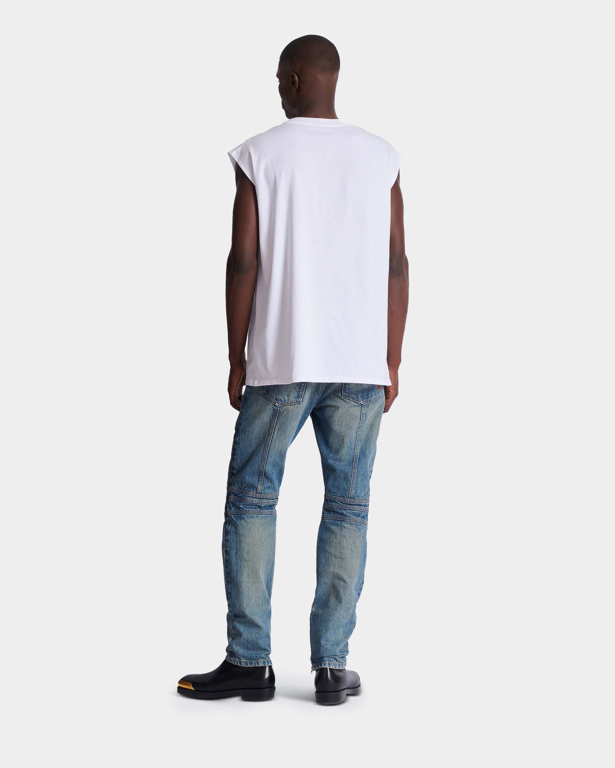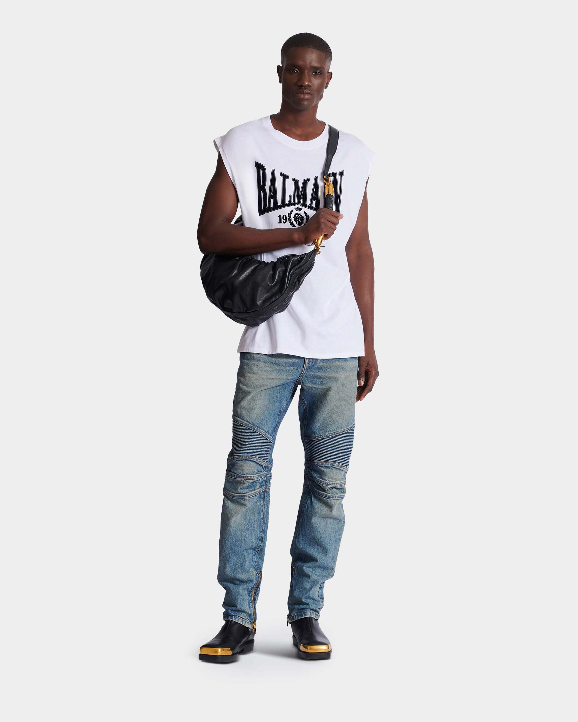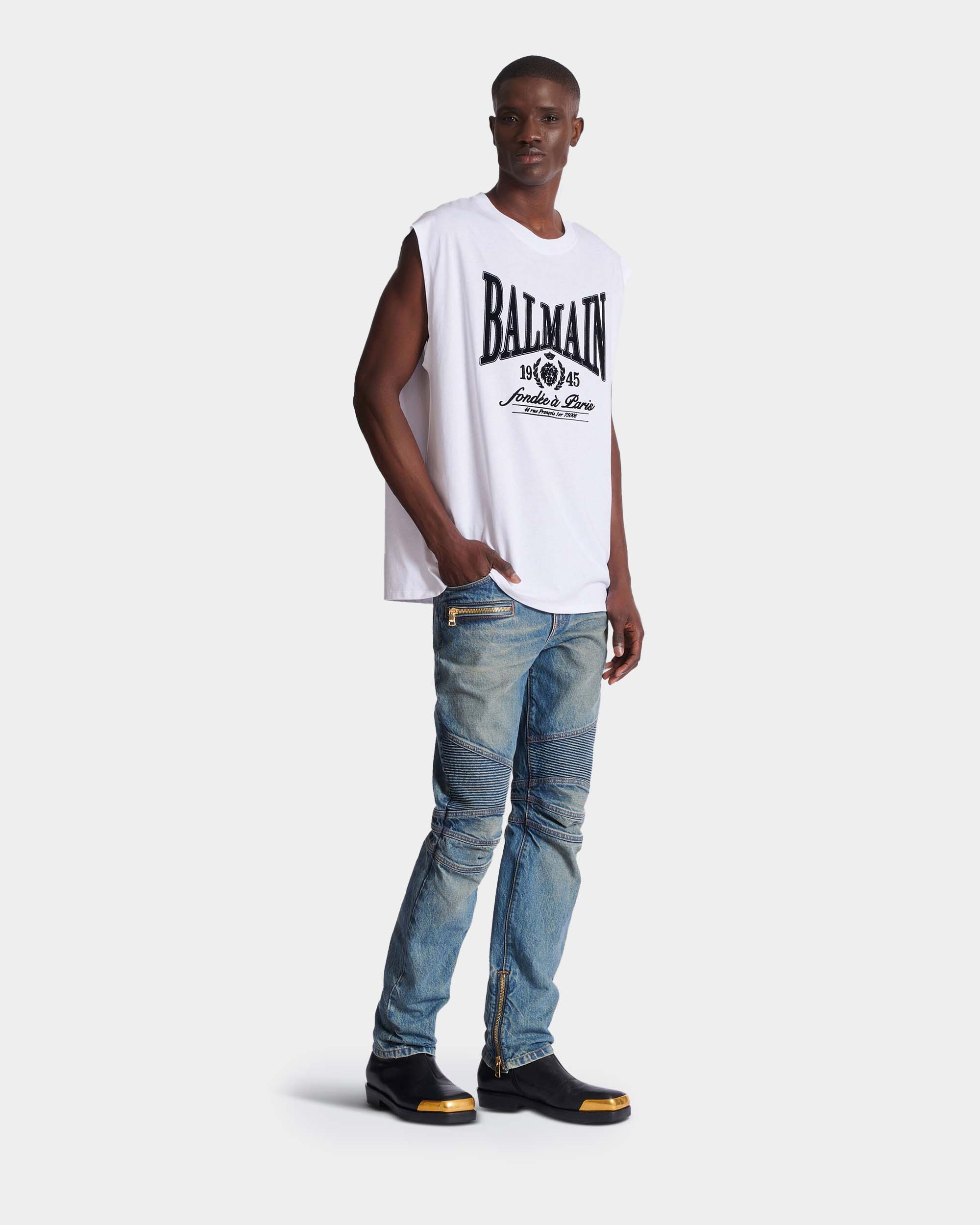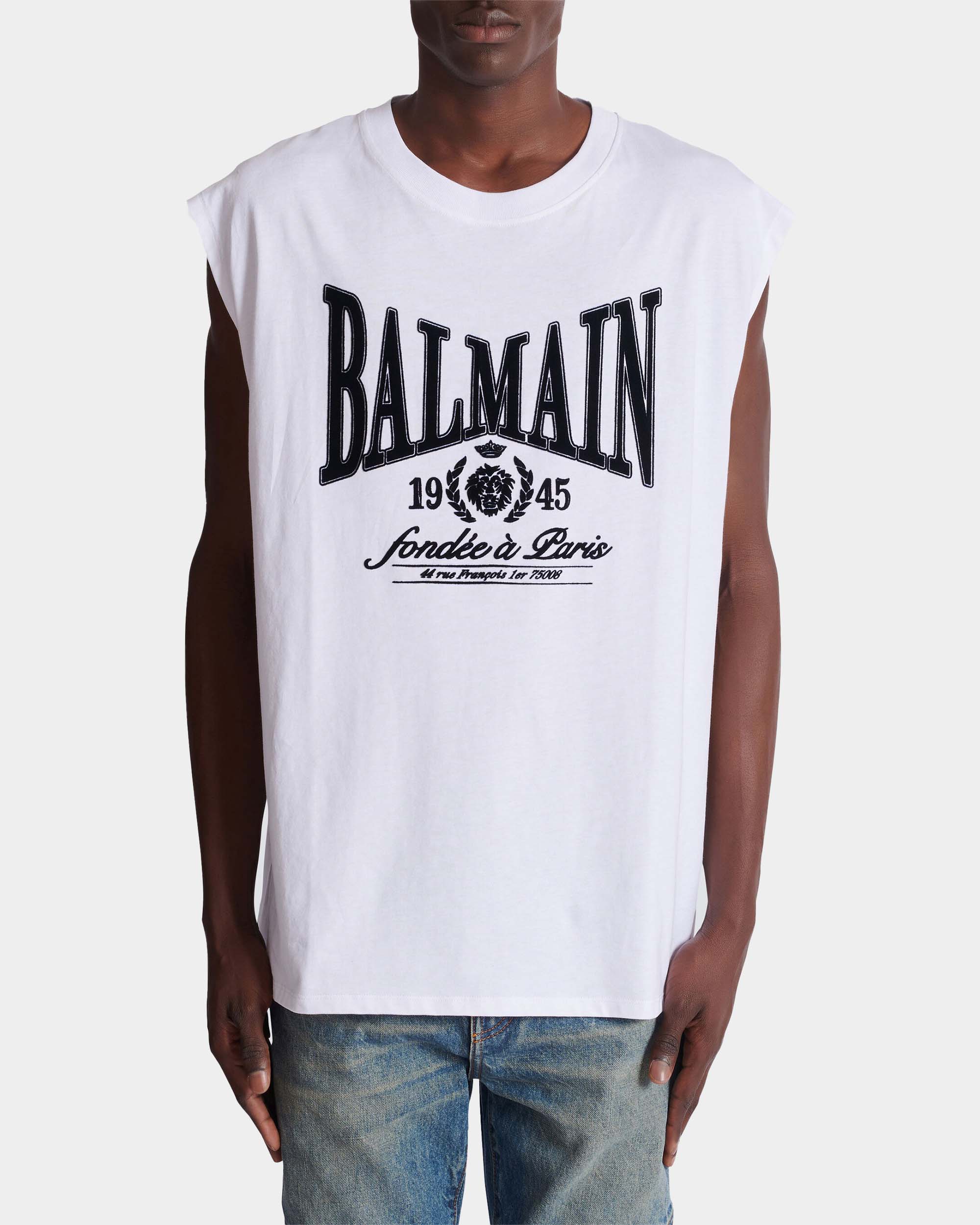 此款無袖背心以寬鬆剪裁呈現率性輪廓,正面「Balmain 1945」印花成為視覺焦點,展現鮮明風格態度。採用純棉針織布料製作,質地柔軟透氣,適合單穿或作為層次搭配。圓領設計與簡潔線條,使整體造型更顯俐落自然,是夏季與街頭風格穿搭的實穿單品。