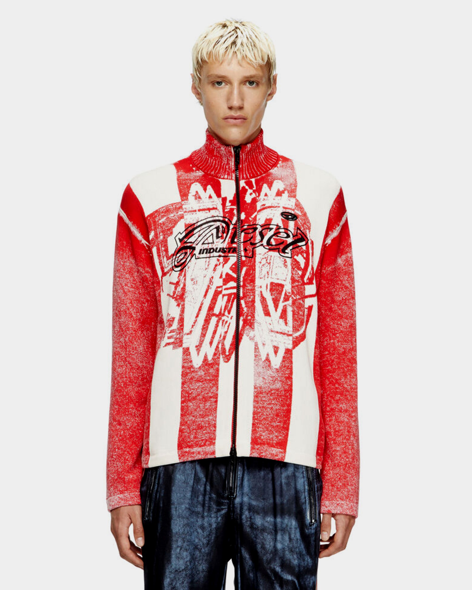 這款 K-OLIBA JKT 的設計靈感源自足球運動藝術風格:內裡與外層都印製有條紋圖案,營造內外反轉視覺效果。立領搭配雙向拉鍊開合,使穿脫更便利,也可調整領口造型。胸前以鏤空與刺繡交錯呈現 Oval “D” 標誌,為整件衣服增添品牌識別細節。版型屬常規剪裁,兼具休閒與造型感。