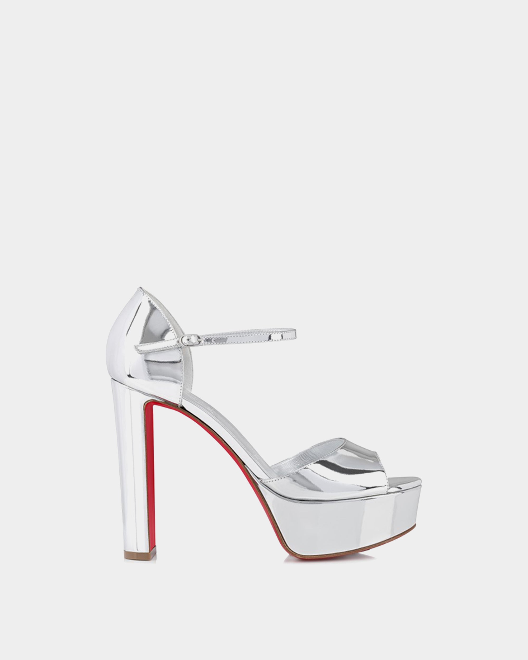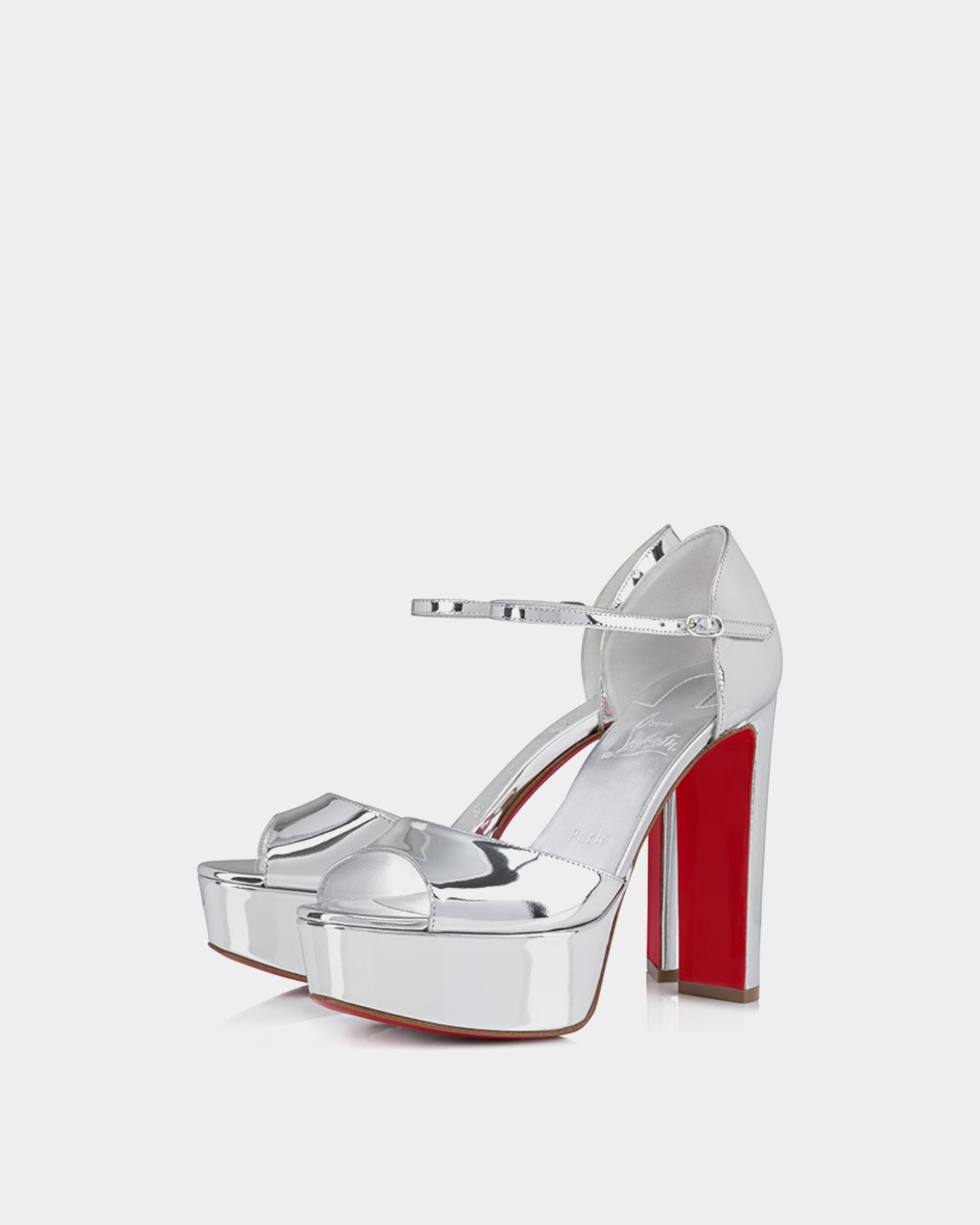 Made of silver glossy calfskin, with a thick forefoot sole and 13cm thick high heels, it shows a luxurious aura in stability. The ankle strap design modifies the ankle line, which is full of party atmosphere and modern fashion. The iconic red bottom echoes the brand's classics, and it is full of aura whether paired with a dress or pants.