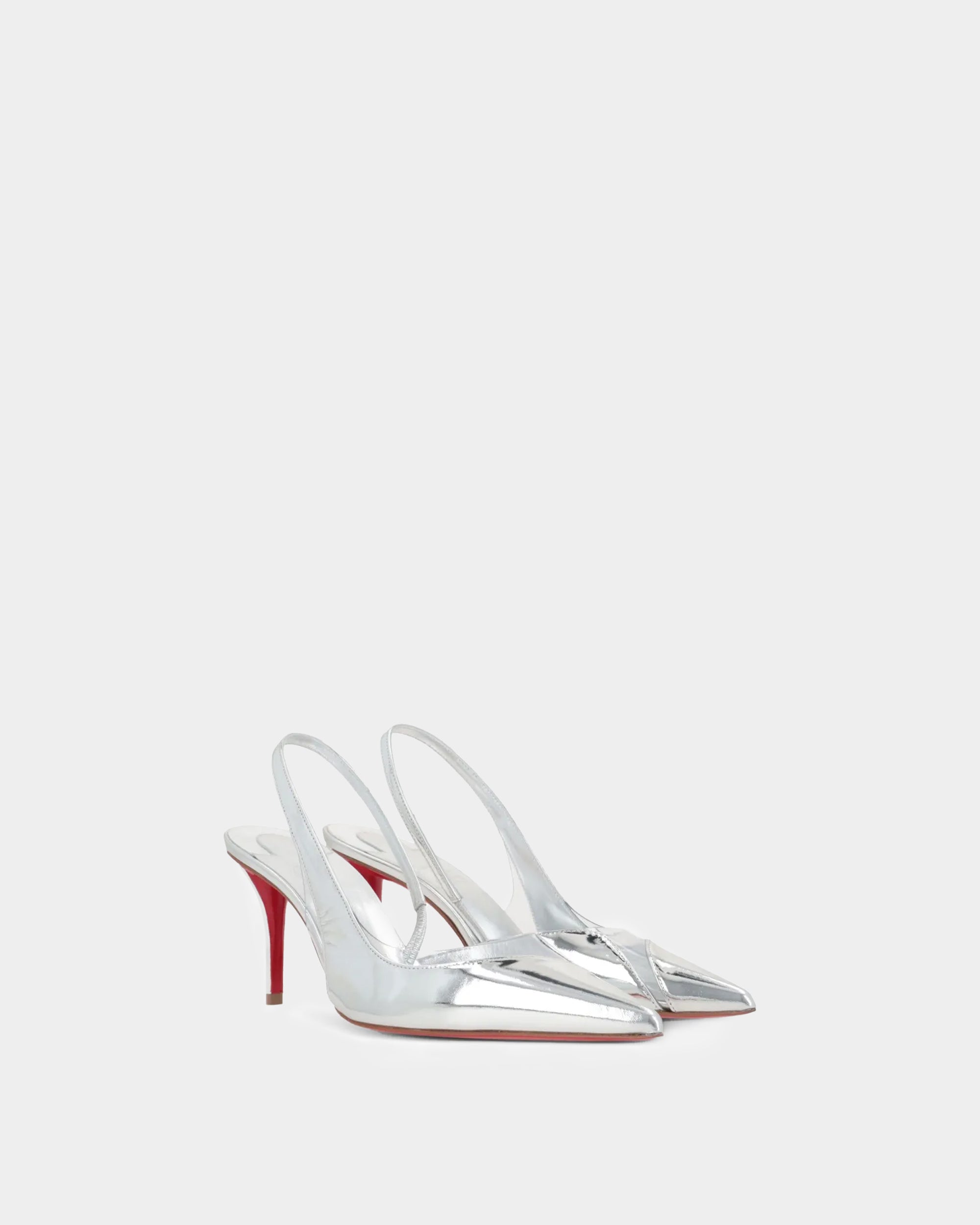Posticha silver high heels combine a futuristic mirror texture with a classic pointed toe design, showing a neat and confident style. The mirrored calfskin upper is shiny, paired with the brand's iconic red sole and 8cm heel height. It is both comfortable and fashionable, and is a versatile item suitable for day and night wear.