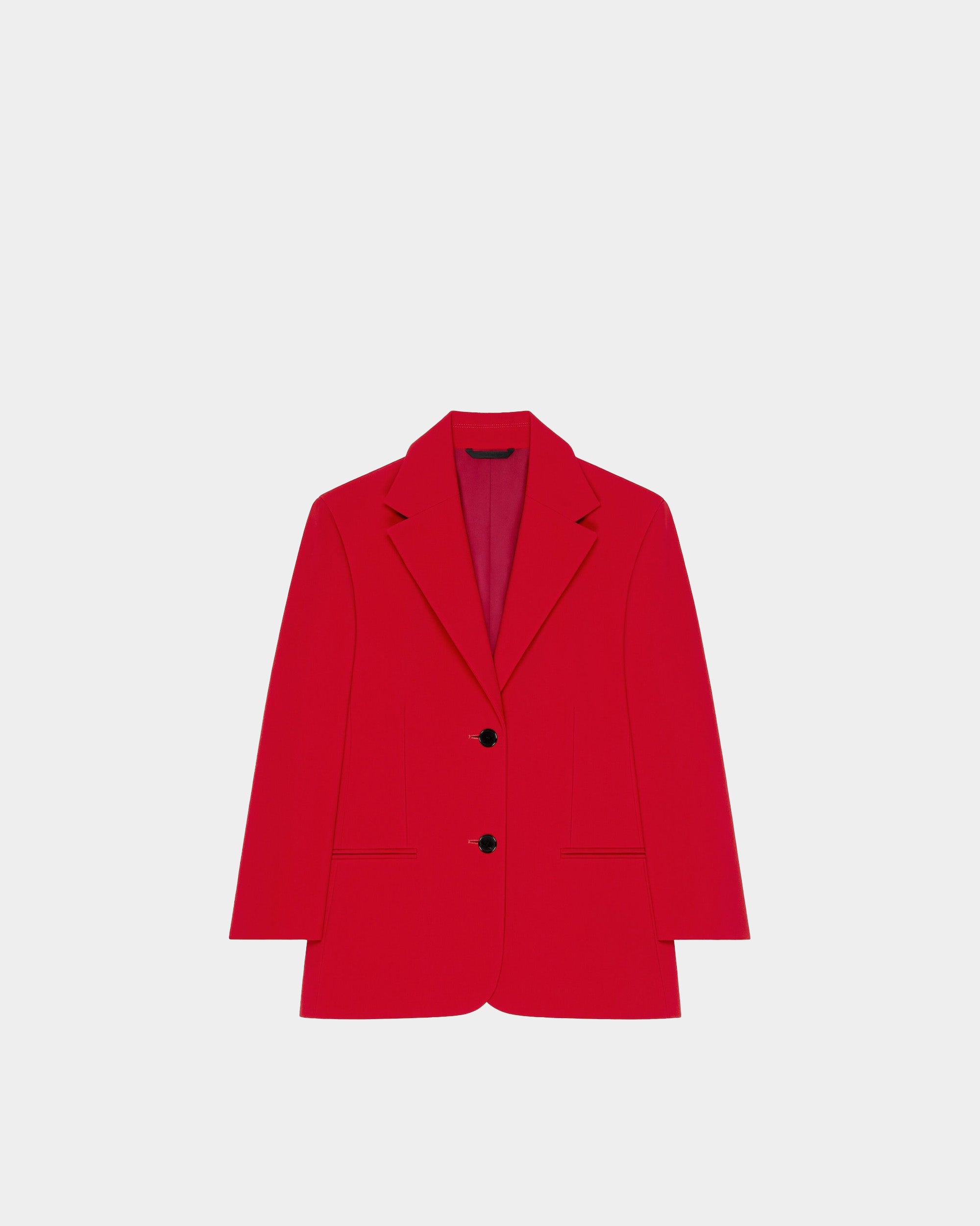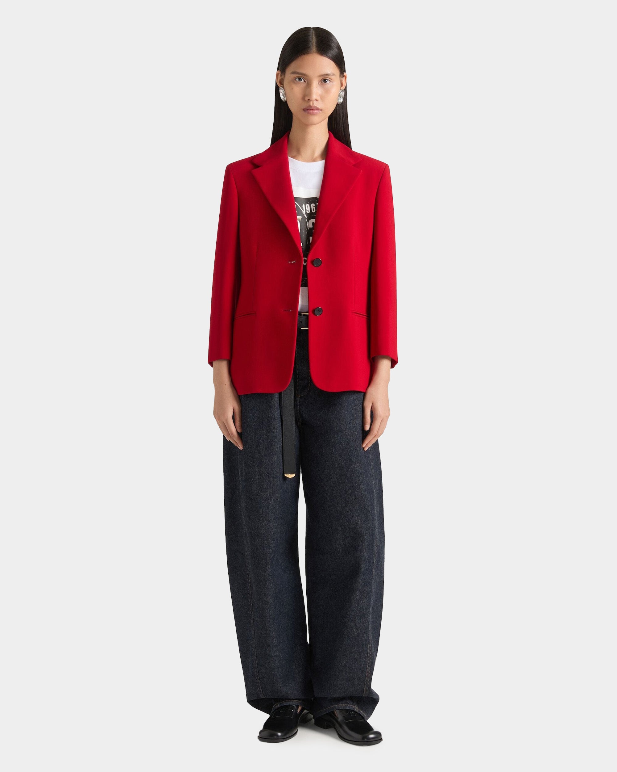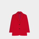 這款 Givenchy 深紅色西裝外套採用柔滑的克雷普面料製作,剪裁設計以結構感與現代氣質取得完美平衡;採單排扣前襟、缺角翻領設計,搭配七分袖與前方雙口袋細節,內襯為緞面質地,提高穿著舒適度與整體質感,俐落輪廓既適合正式場合搭配優雅套裝。