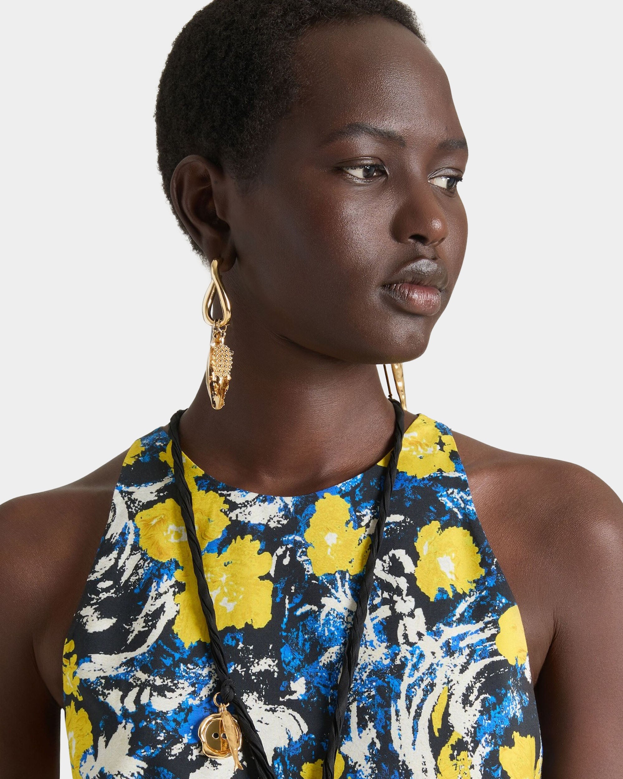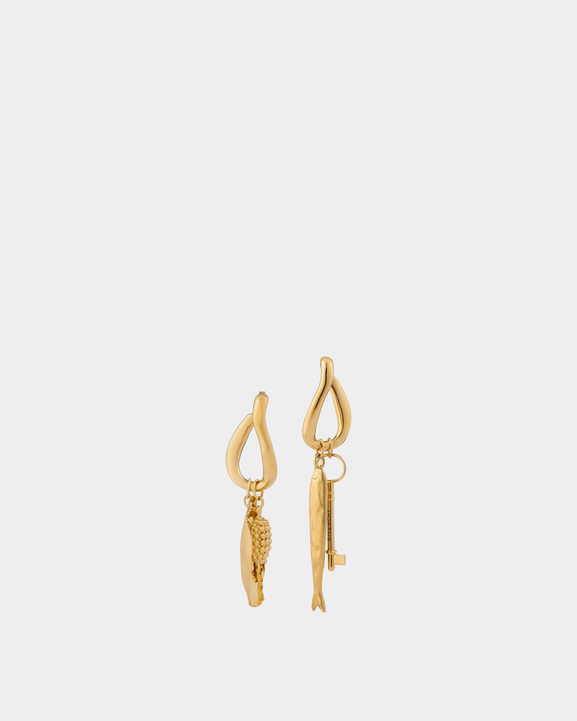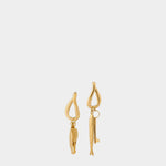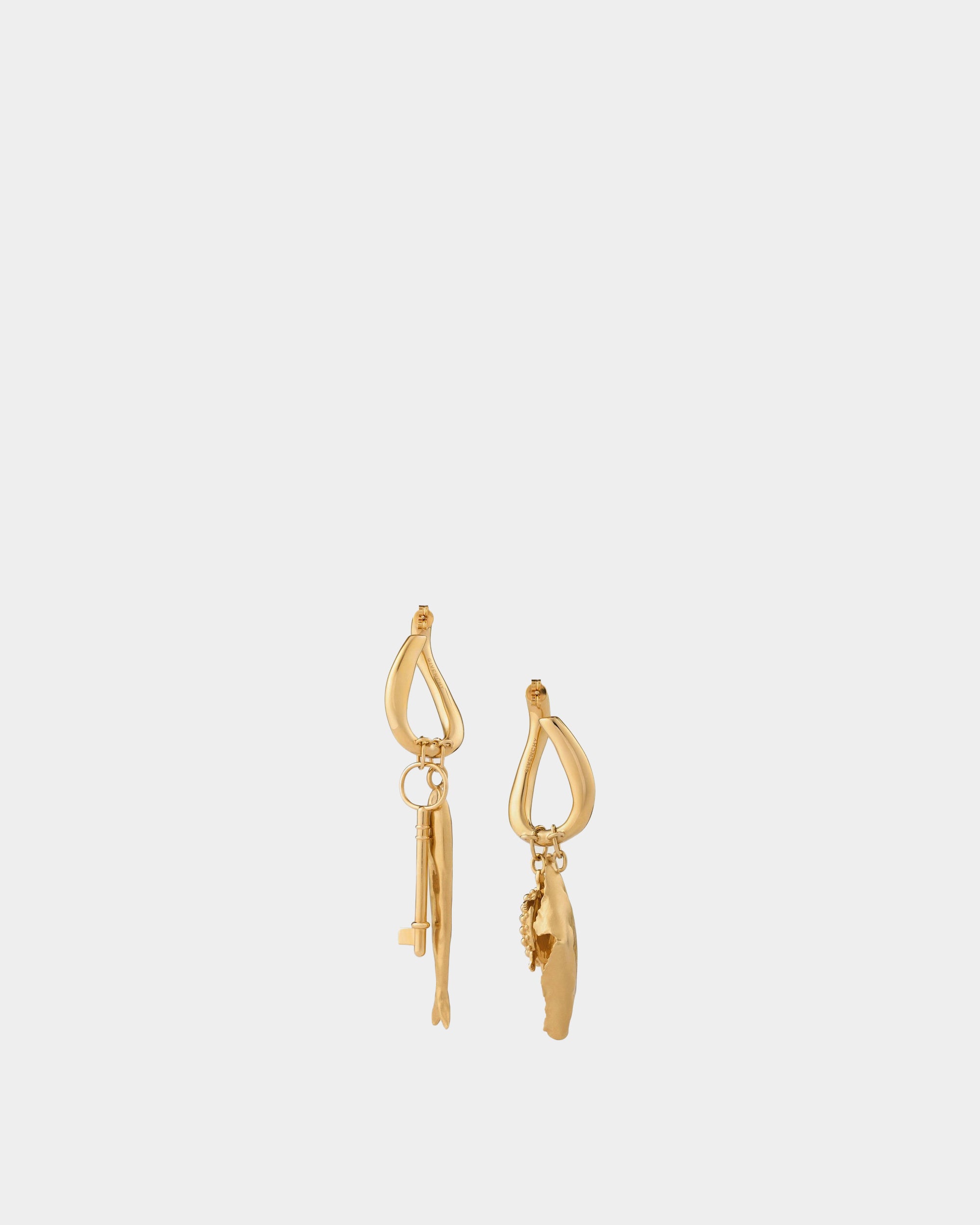 來自 Givenchy Lucky Charms 系列的不對稱耳環,以金色金屬打造,搭配可自由擺動的幸運吊飾設計,靈感源自 Hubert de Givenchy 珍藏物件,包含花朵、烏龜、魚與鑰匙元素,鑰匙與背面皆刻有 GIVENCHY 標誌,耳針採傾斜設計,佩戴時能自然維持筆直線條,為造型增添個性與高級感。