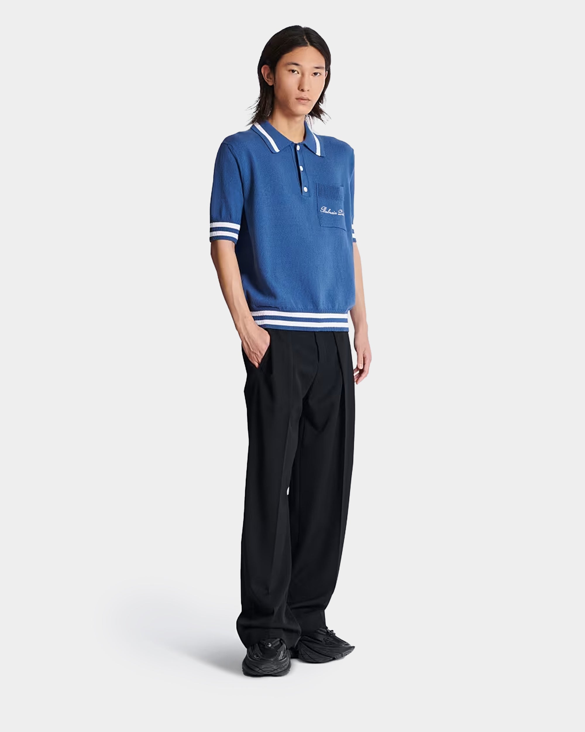 Cut in a classic short-sleeved polo shirt silhouette, it features Balmain Paris embroidery on the chest and ribbed trims, creating an elegant sporty style perfect for everyday or casual dress-up.