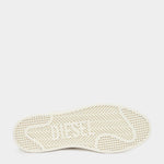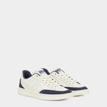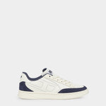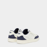 採用柔軟皮革製成,造型以白色與徽藍色拼接方式呈現,鞋面帶有透氣打孔 Diesel 標誌,帶有簡約的質感與品牌特色。鞋底採用橡膠材質,提供舒適抓地力,適合日常休閒或運動穿搭。
