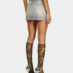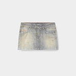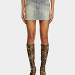 以獨特的條紋牛仔布料精製而成,染水與手工打磨技術帶出自然舊化與立體洗紋效果。低腰剪裁搭配原創毛邊下擺,散發隨性又帶點俏皮的街頭個性。三口袋設計加上腰間織標與小「D」刺繡細節,展現 Diesel 品牌獨特辨識度。