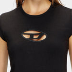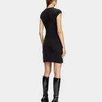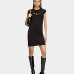 採用 93% 有機棉與 7% 彈性纖維的混紡材質,呈現修身版型。設計特色包括圓領、短袖,以及胸前的圓形「D」字母刺繡與切割細節,展現品牌獨特風格。裙身採用 高低擺設計,增添層次感。。