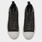 這款高筒運動鞋以帆布為材質,靈感來自品牌的暢銷手提包。鞋面經手工做舊處理,呈現出完美的復古外觀。搭配品牌標誌性的黃色鞋底和橡膠外底上的品牌名稱標誌,展現獨特的設計風格。