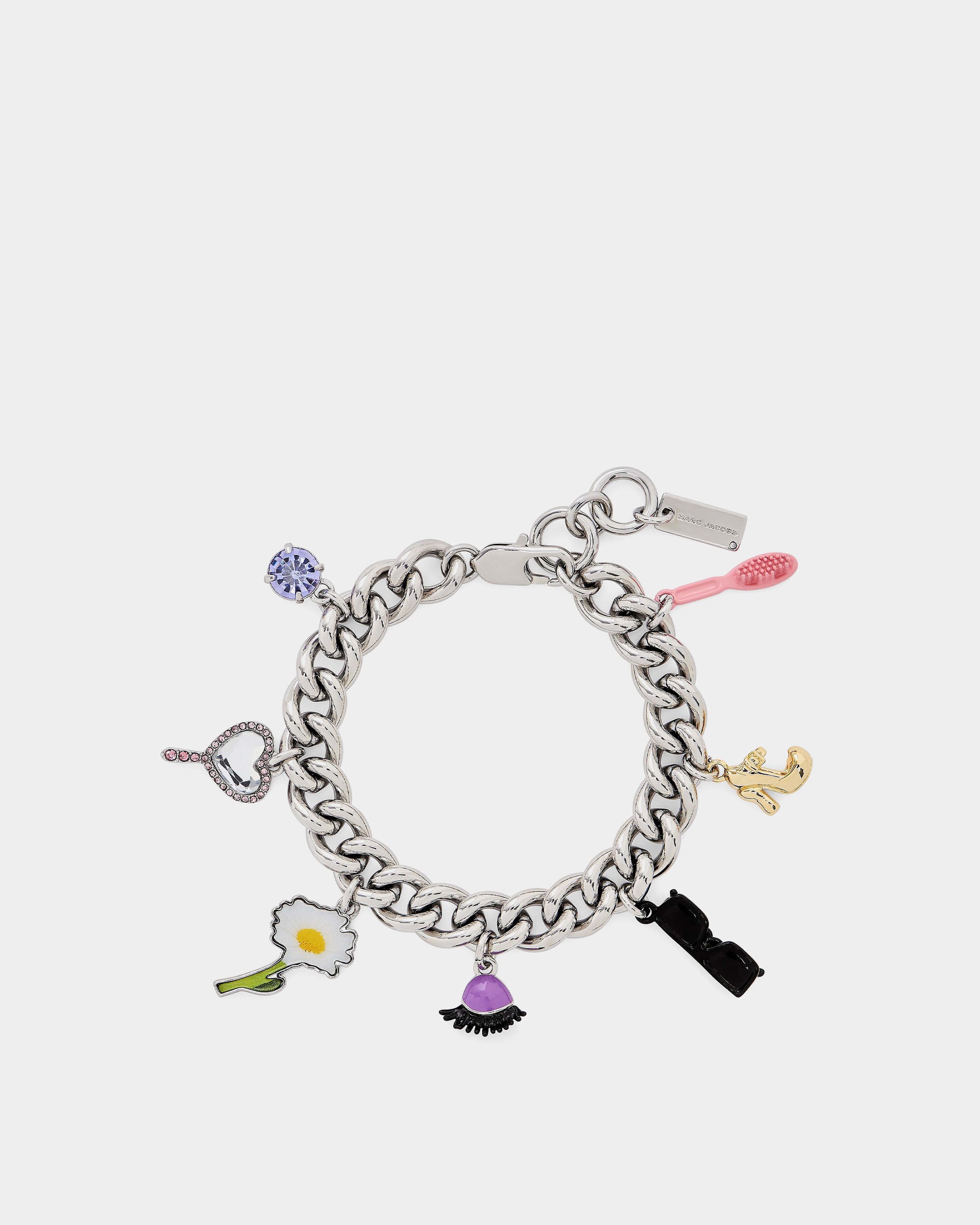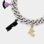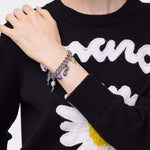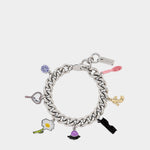 以鍍銀黃銅鏈條為基底,搭配琺瑯與玻璃水晶裝飾吊飾,以娃娃屋為設計靈感,吊飾活潑俏皮又具設計感。