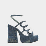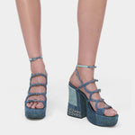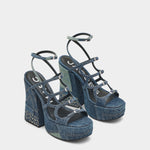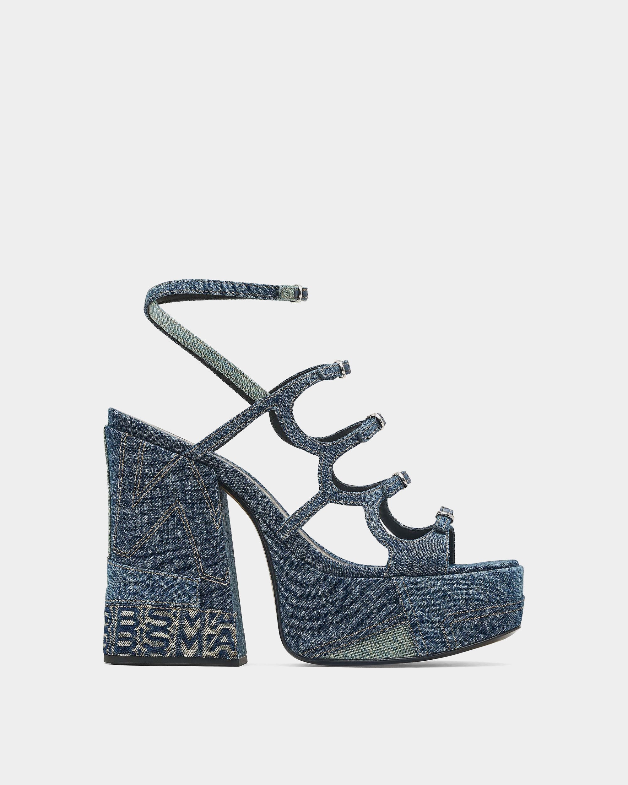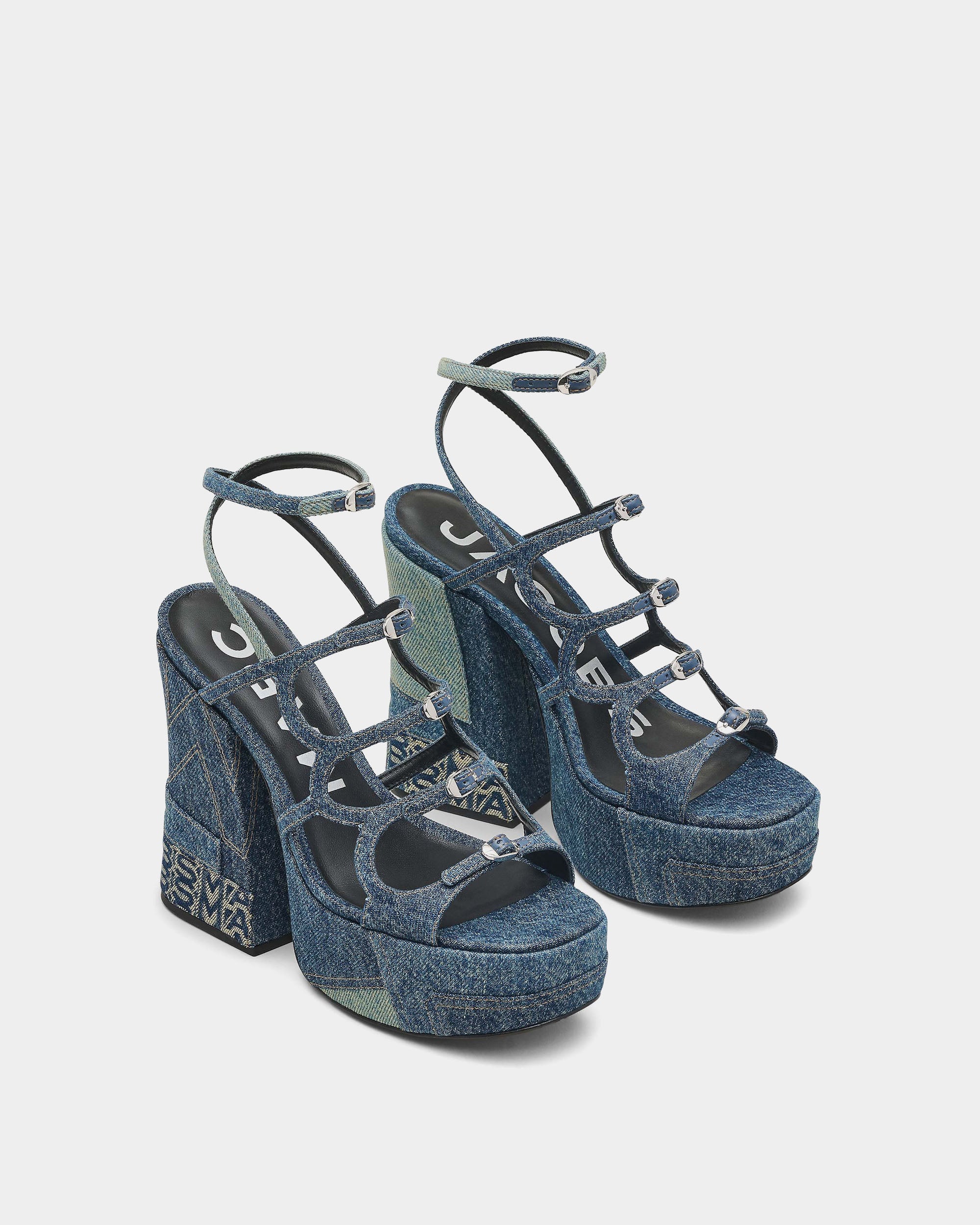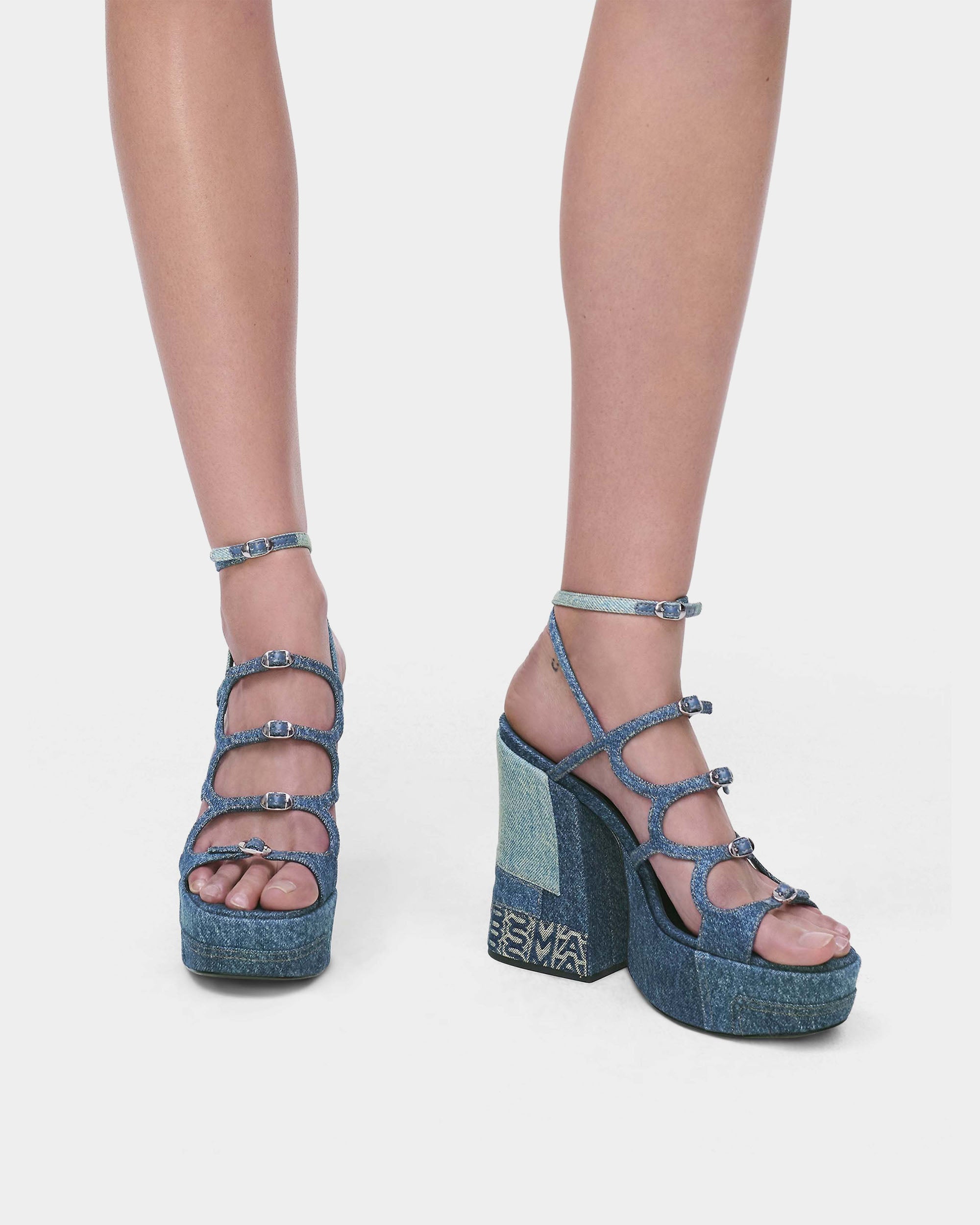 採用拼接牛仔布鞋面結合皮革鞋墊與底盤,配有金屬多扣環設計與扣帶腳踝固定,鞋跟約 125 mm,厚底提升高度與造型感。