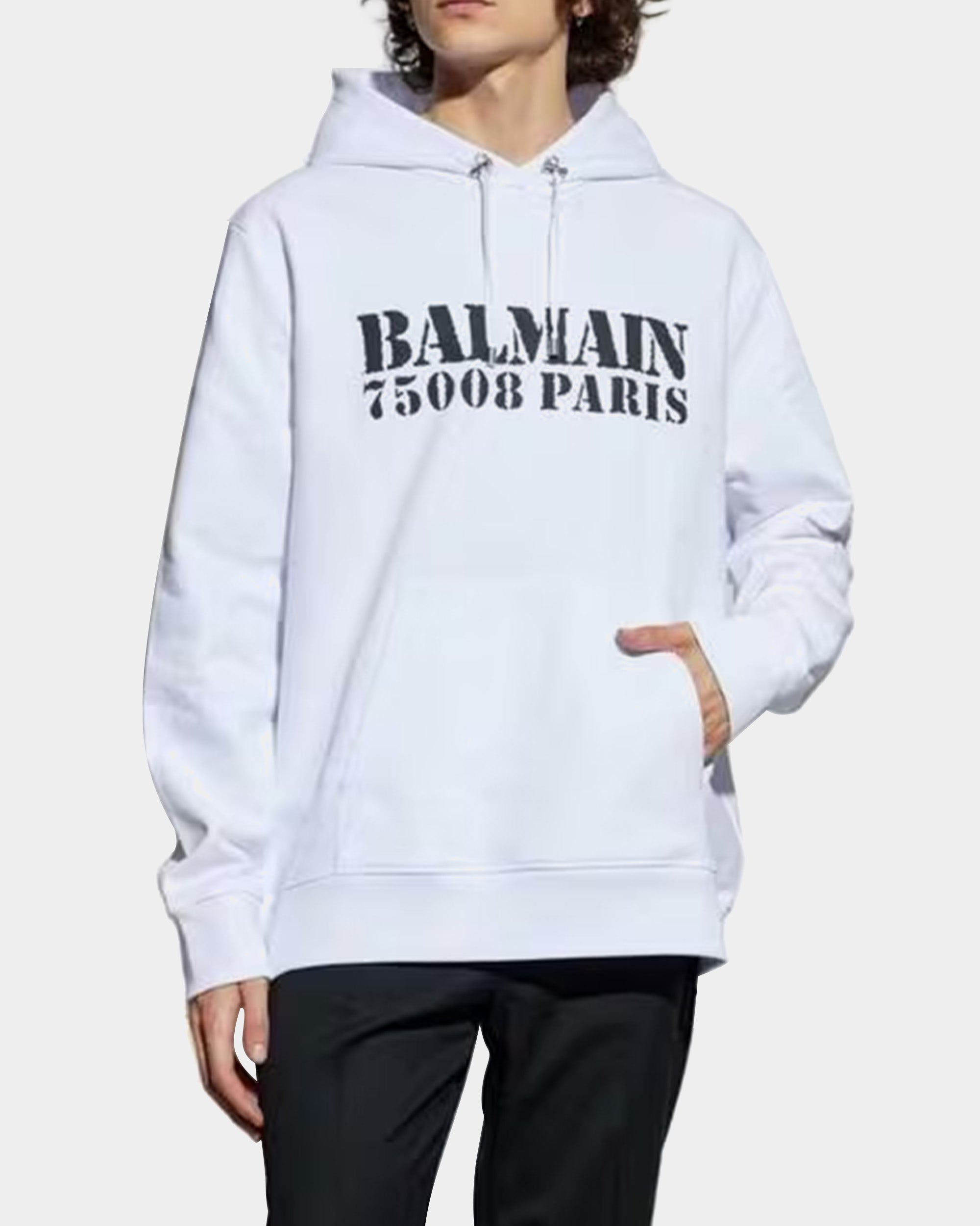 經典連帽上衣,以簡約剪裁搭配「BALMAIN 75008 PARIS」印字,象徵品牌位於巴黎第八區的時尚核心地標,將高級訂製的巴黎精神融入日常穿搭。
