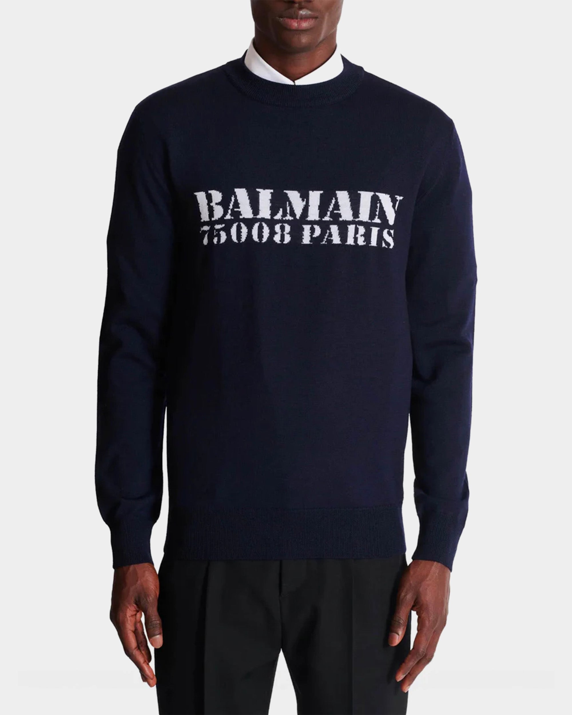 羊毛針織上衣,正面飾有「BALMAIN 75008 PARIS」字樣,象徵品牌位於巴黎第八區的總部,簡約中彰顯高級與專屬身份感。