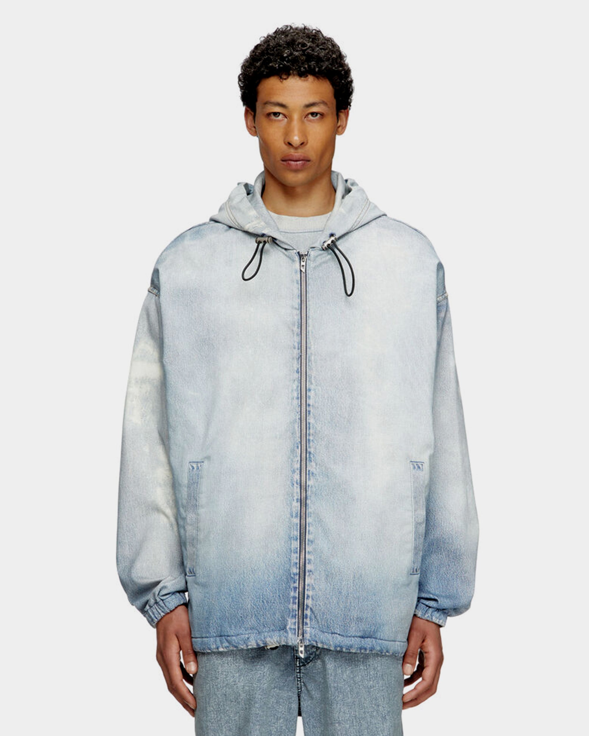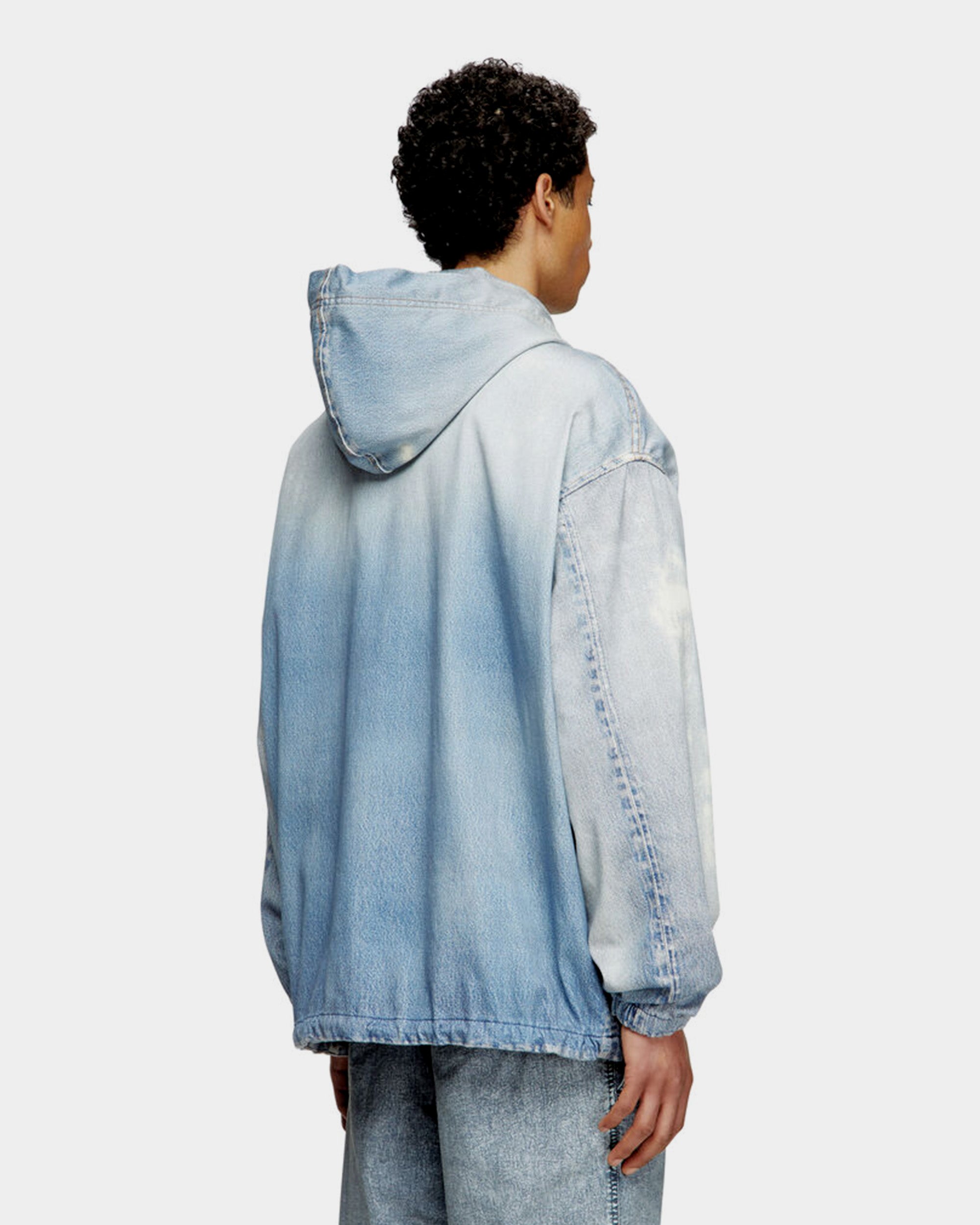 這款 D-WYNNY JOGG 男款連帽衛衣採用90% 有機棉、8% 聚酯纖維與 2% 彈性纖維(氨綸)製成,質地柔軟且富彈性。設計上採丹寧漸層感,正面胸口處印有品牌標誌,展現品牌特色;袖口與下擺採用彈性羅紋設計,貼合身形,保暖效果佳。