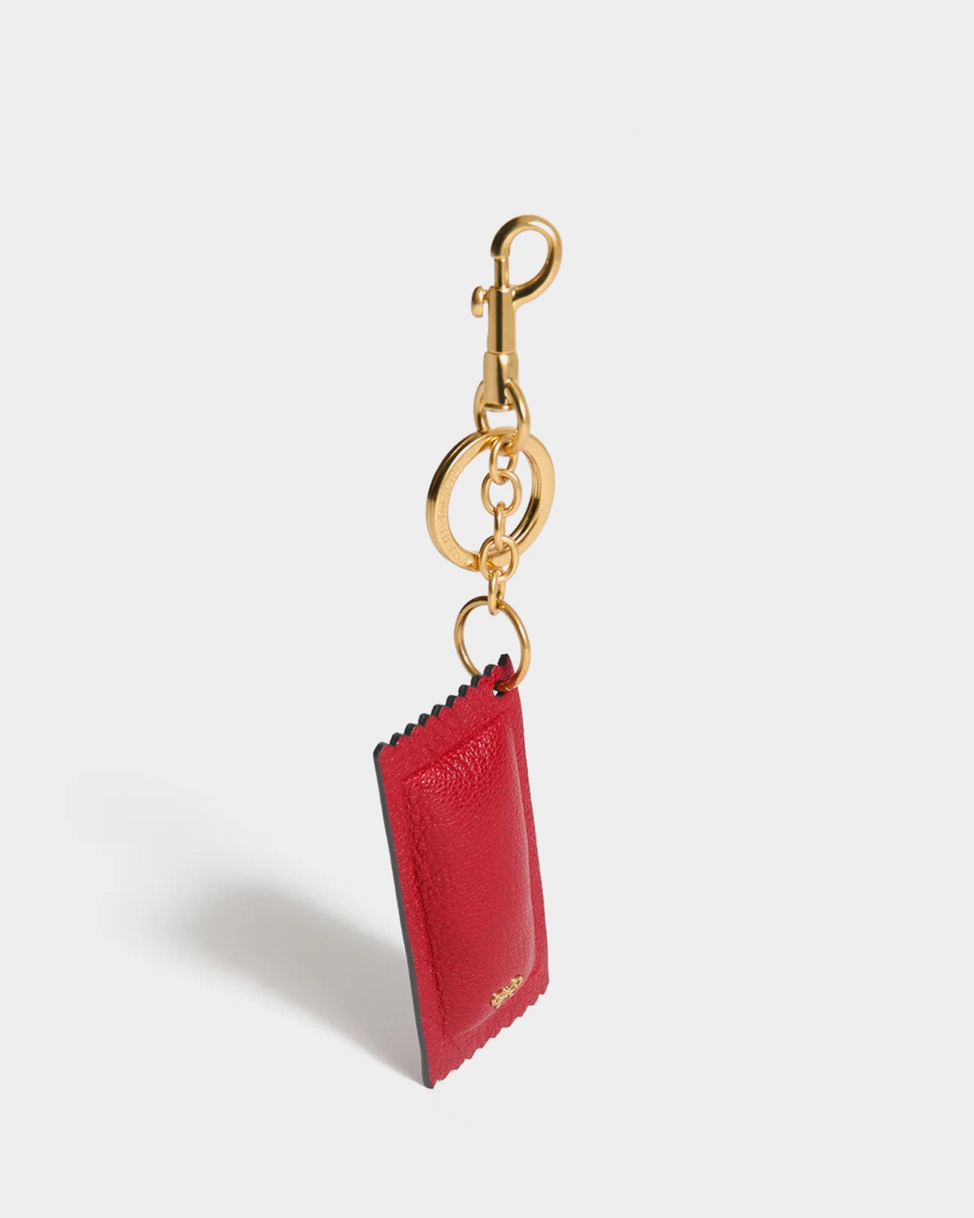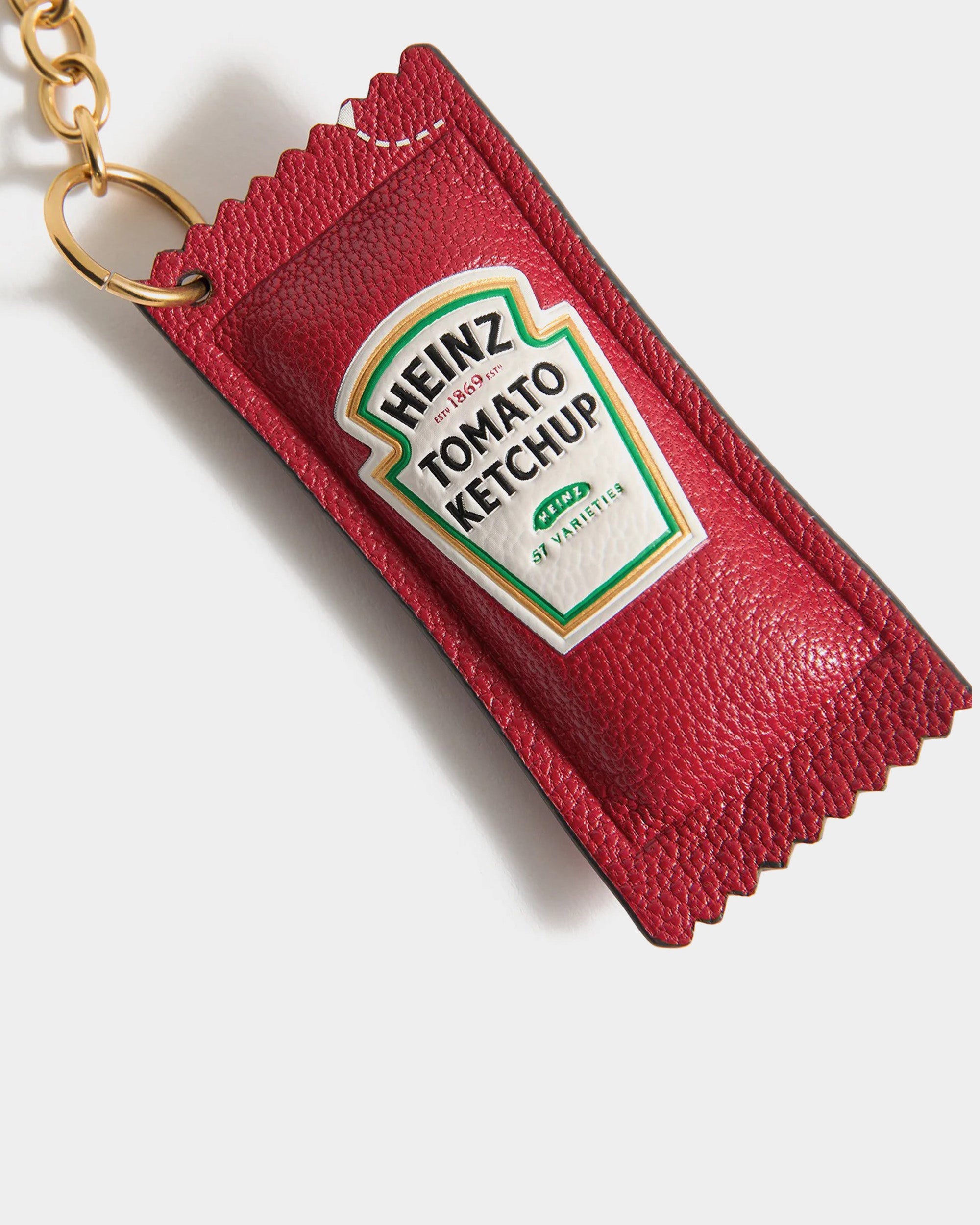 此款 Ketchup 吊飾以番茄醬小包裝為靈感設計,趣味十足且充滿辨識度。以亮面紅色山羊皮製作,搭配熟悉的標誌圖樣與「tear here」細節,呈現幽默又精緻的設計語言。附金色金屬扣環,可輕鬆掛於托特包或其他包款上,為日常造型增添玩味亮點。