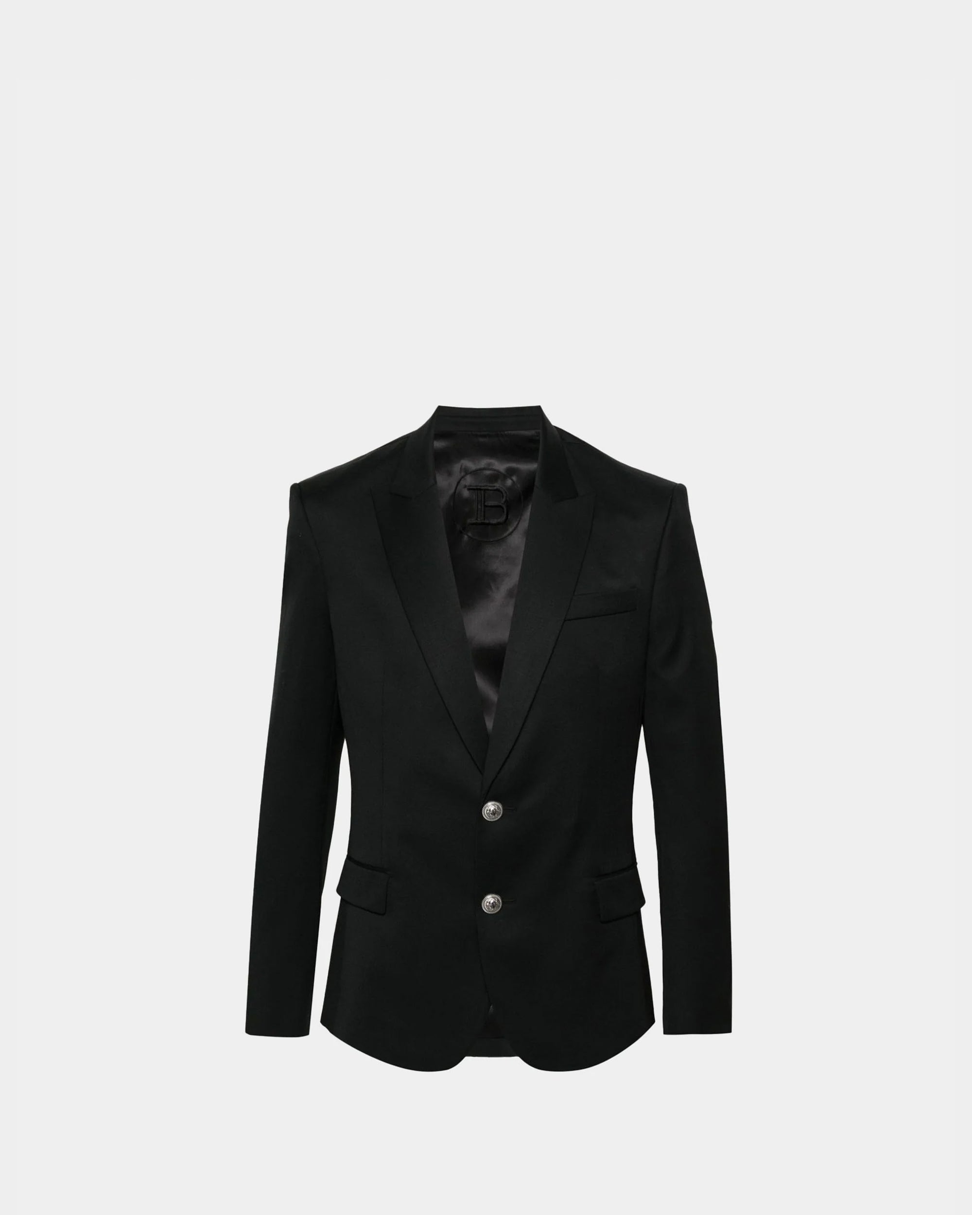 The Balmain Black Two Button Jacket is crafted from classic black wool, showcasing refined tailoring and elegance. It features a peaked collar and structured shoulders for a refined silhouette. The double-breasted front is finished with two iconic silver lion metal buttons for a luxurious feel. Two flap pockets and a chest pocket are both practical and stylish, while slim cuffs add further detail. This blazer perfectly blends classic design with a modern feel, making it an ideal choice for formal occasions or everyday wear.