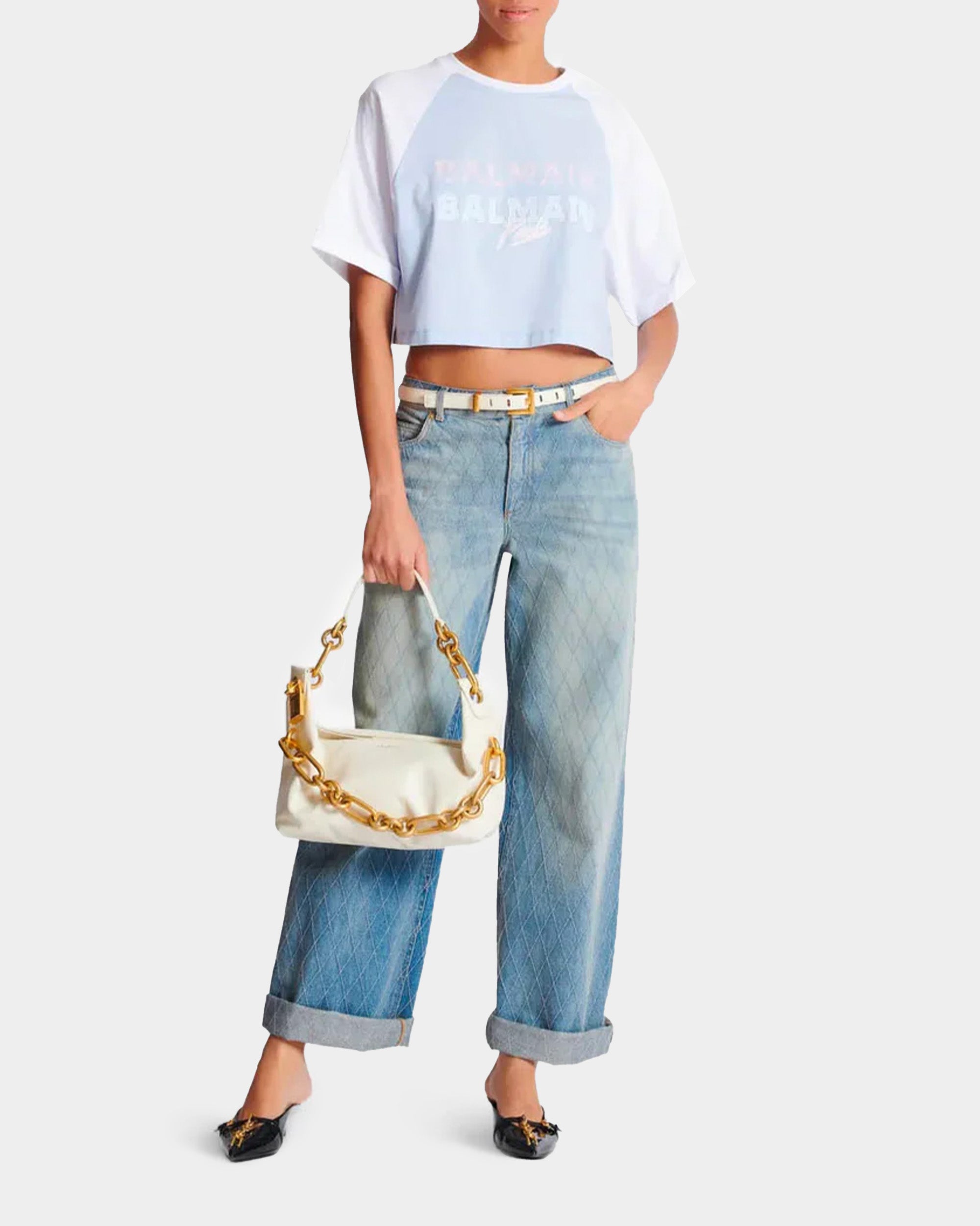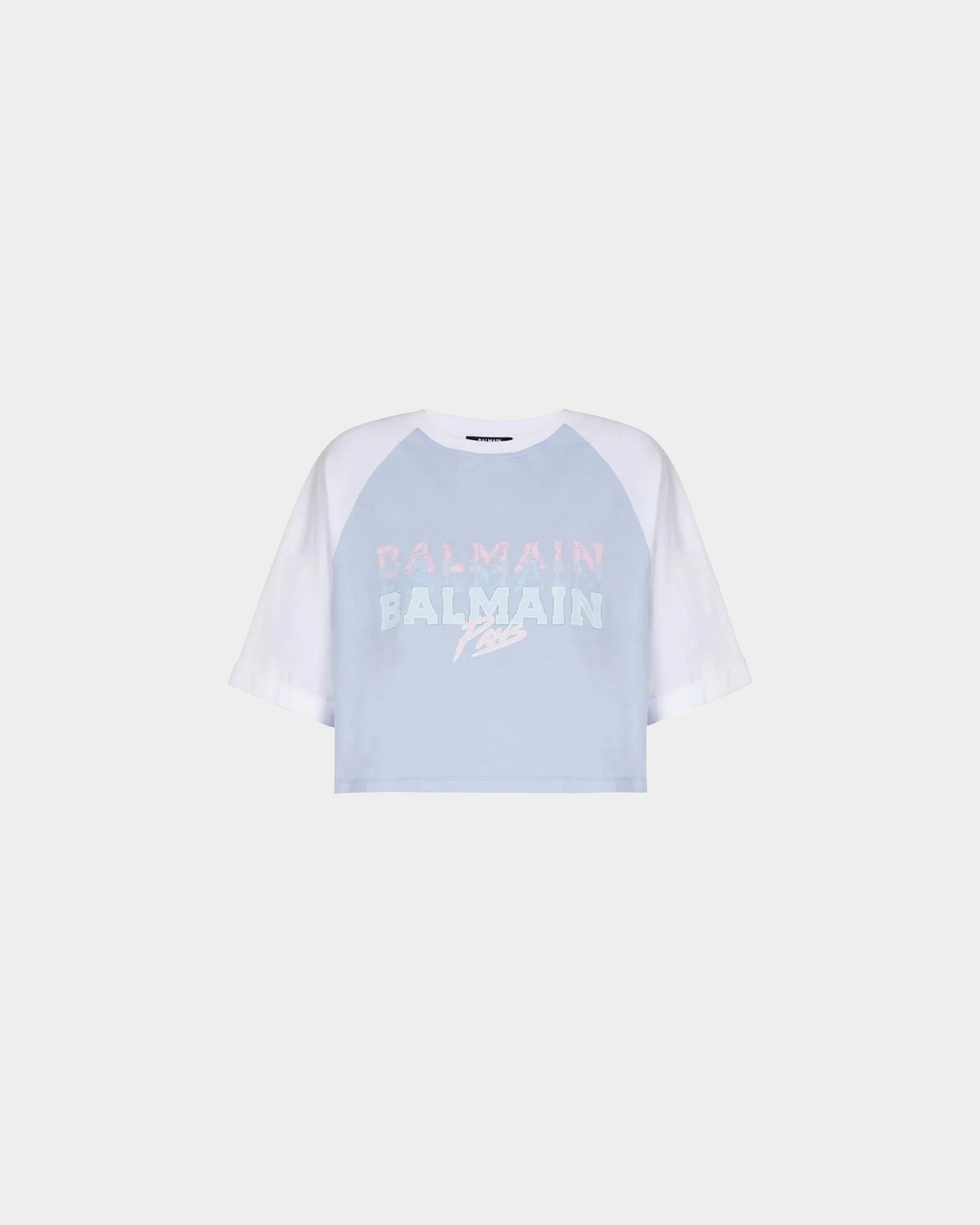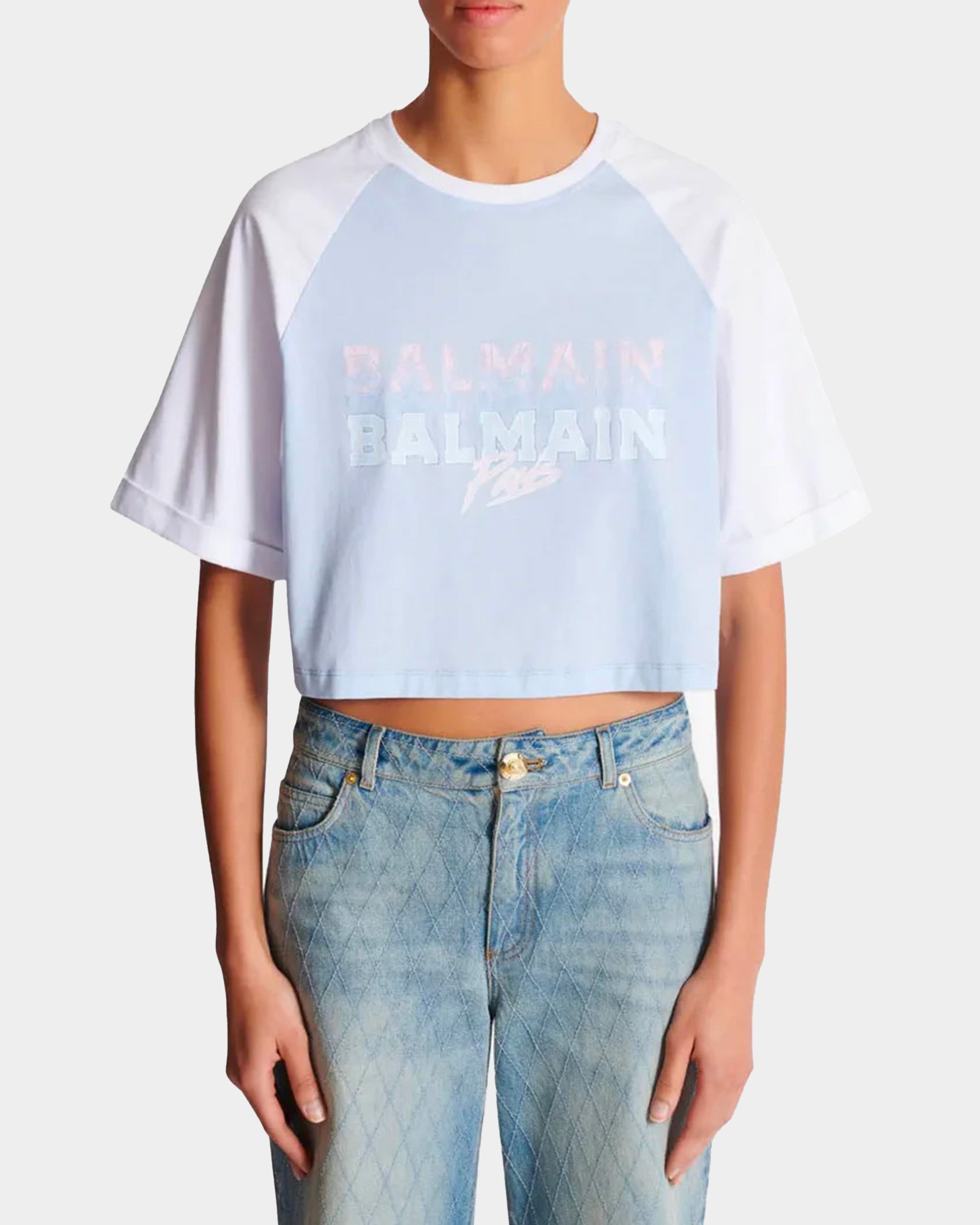 以 Raglan 袖設計搭配粉藍色調,胸前大面積 BALMAIN PARIS 字樣印花,帶有運動休閒感。短版剪裁修飾身型比例,展現年輕、俐落的時髦氣息。