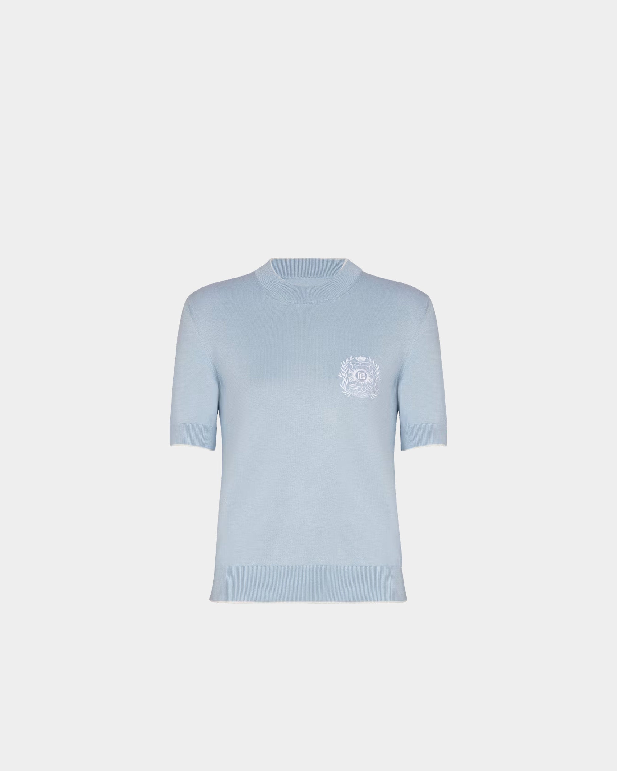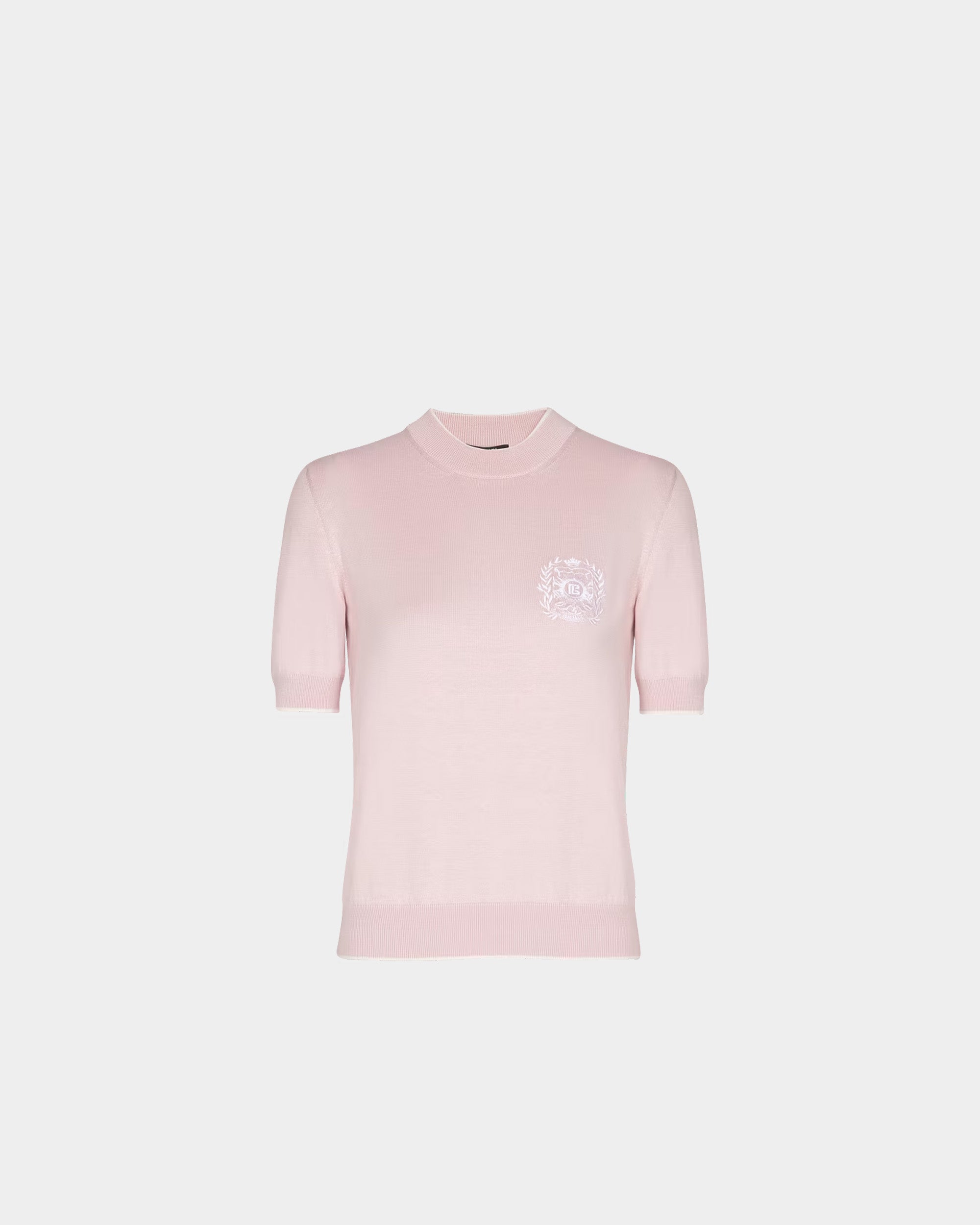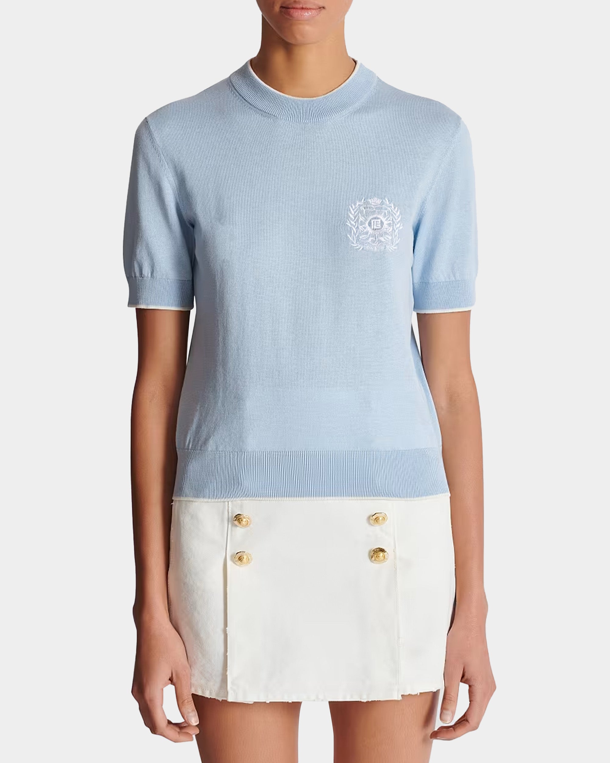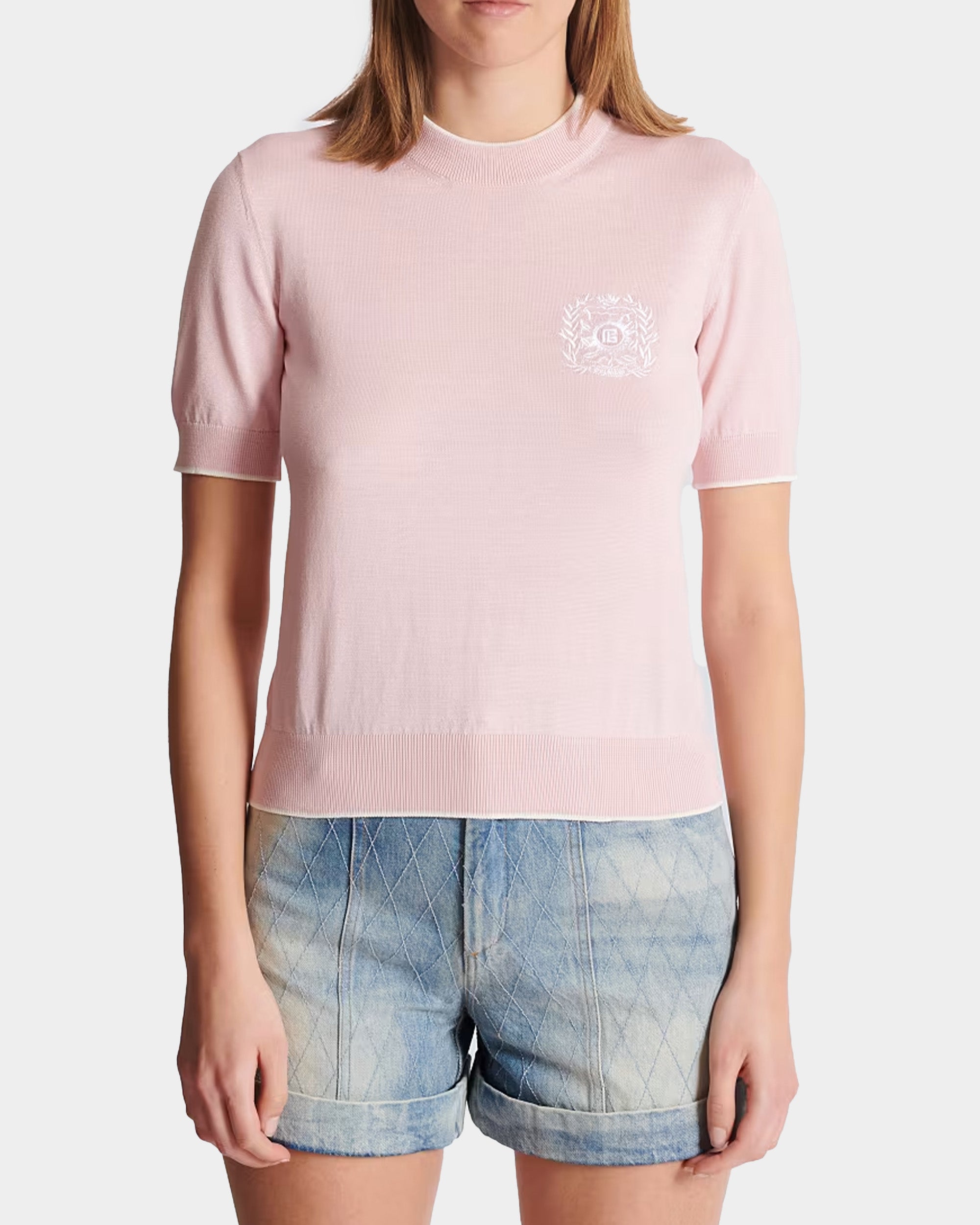 以細緻針織布料製成,觸感柔軟舒適。經典圓領與短袖設計,簡約百搭。胸前飾有 BALMAIN 經典徽章刺繡,低調展現品牌辨識度。以淺色調增添柔美氣息,適合日常穿搭或與外套層疊搭配。