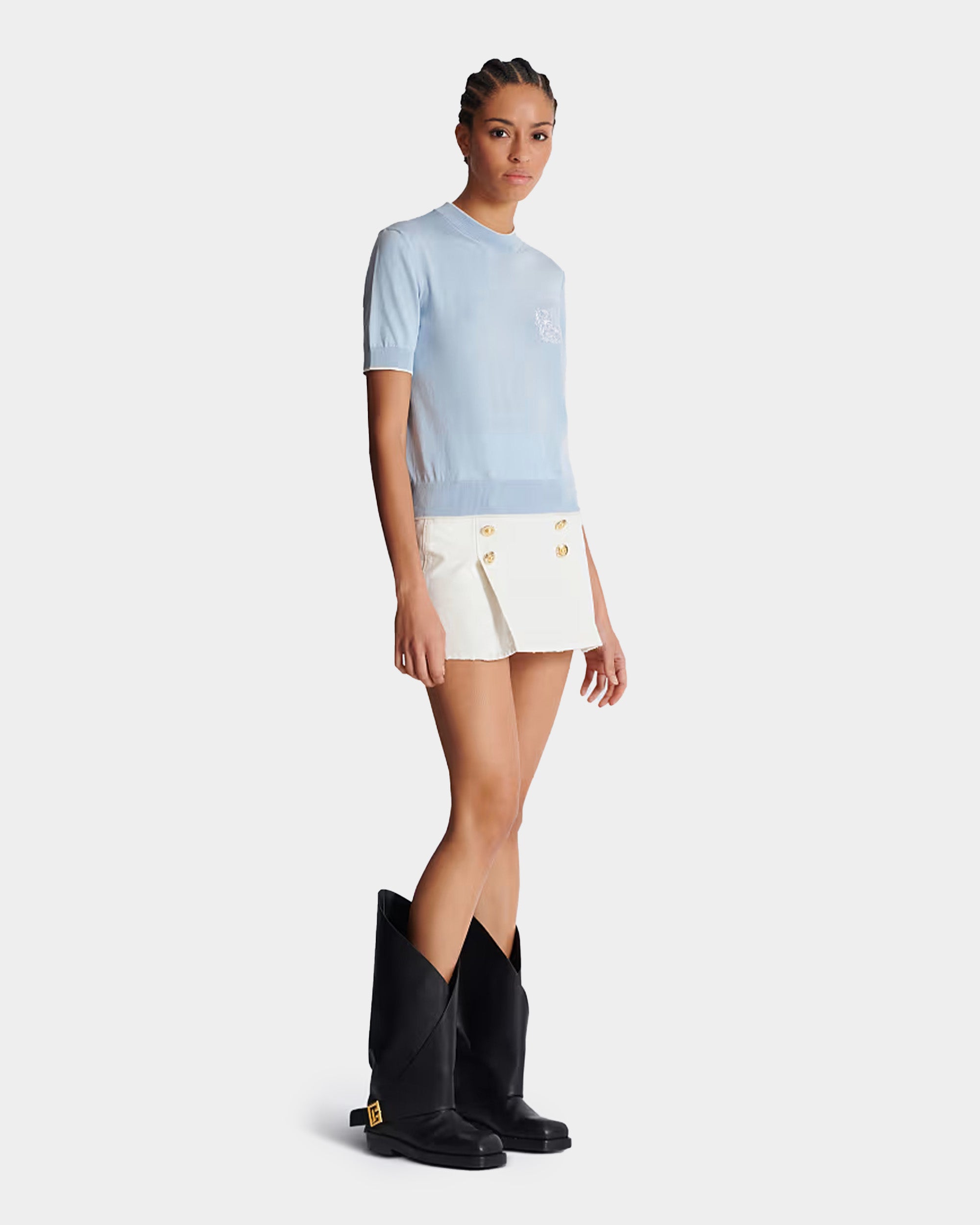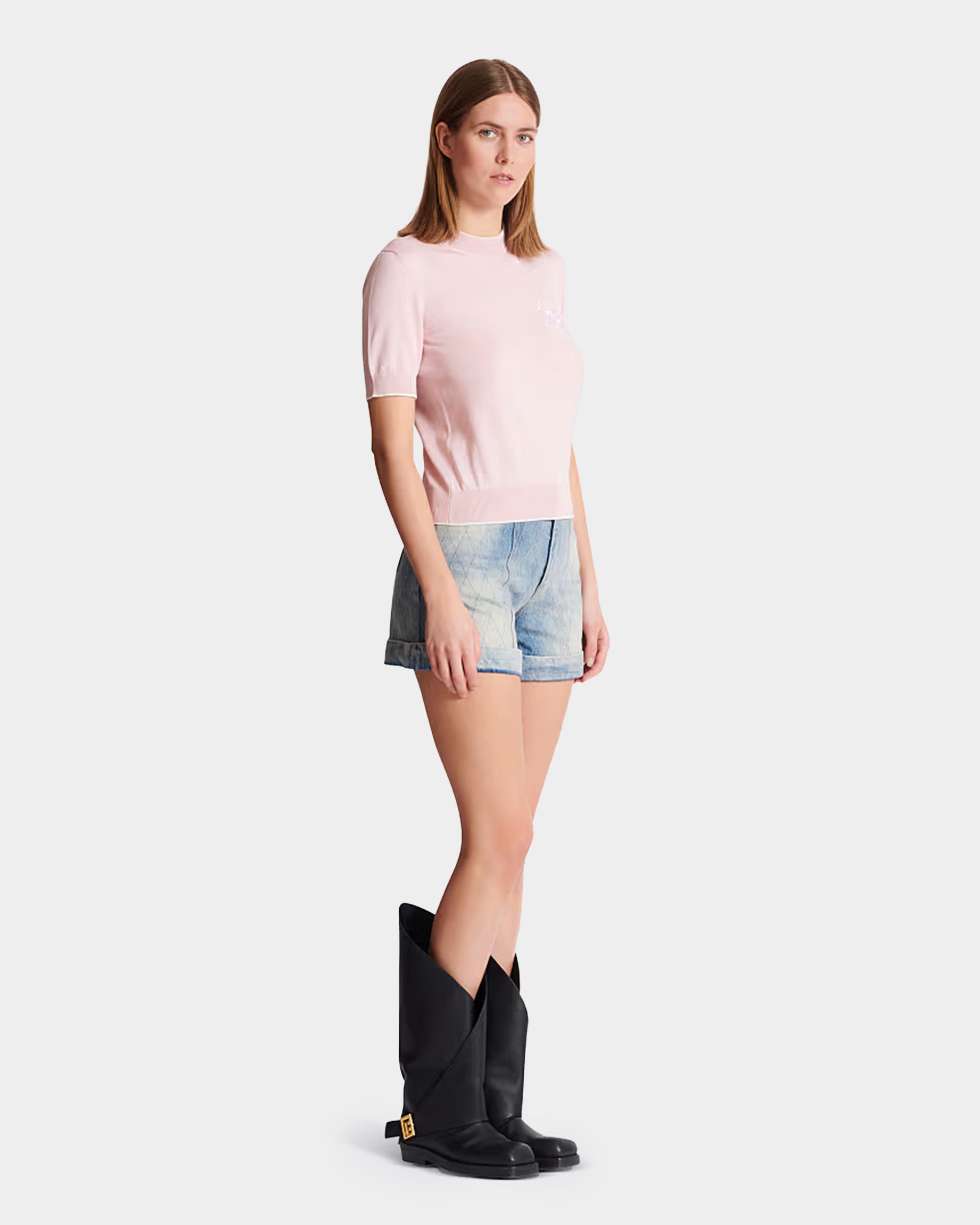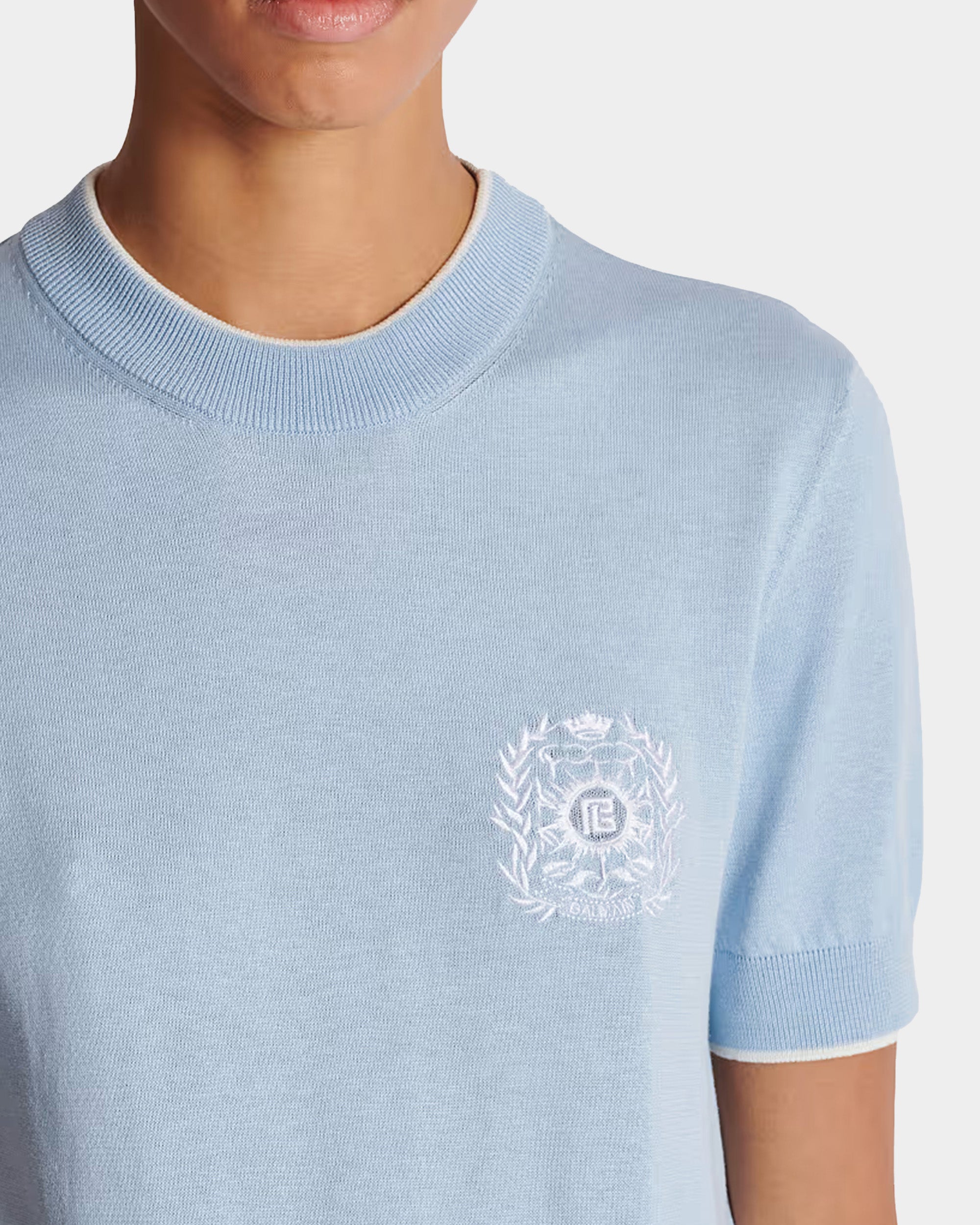 以細緻針織布料製成,觸感柔軟舒適。經典圓領與短袖設計,簡約百搭。胸前飾有 BALMAIN 經典徽章刺繡,低調展現品牌辨識度。以淺色調增添柔美氣息,適合日常穿搭或與外套層疊搭配。