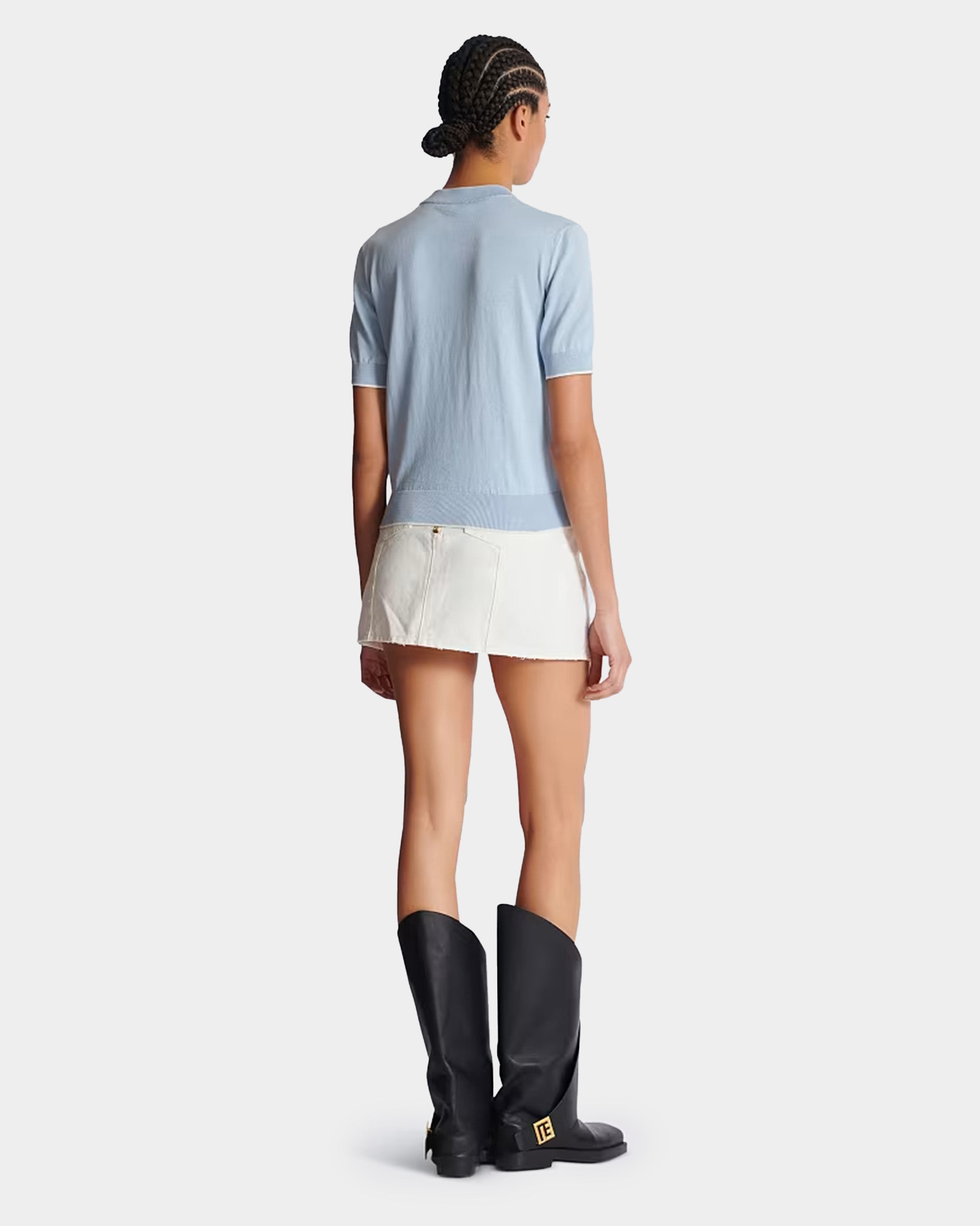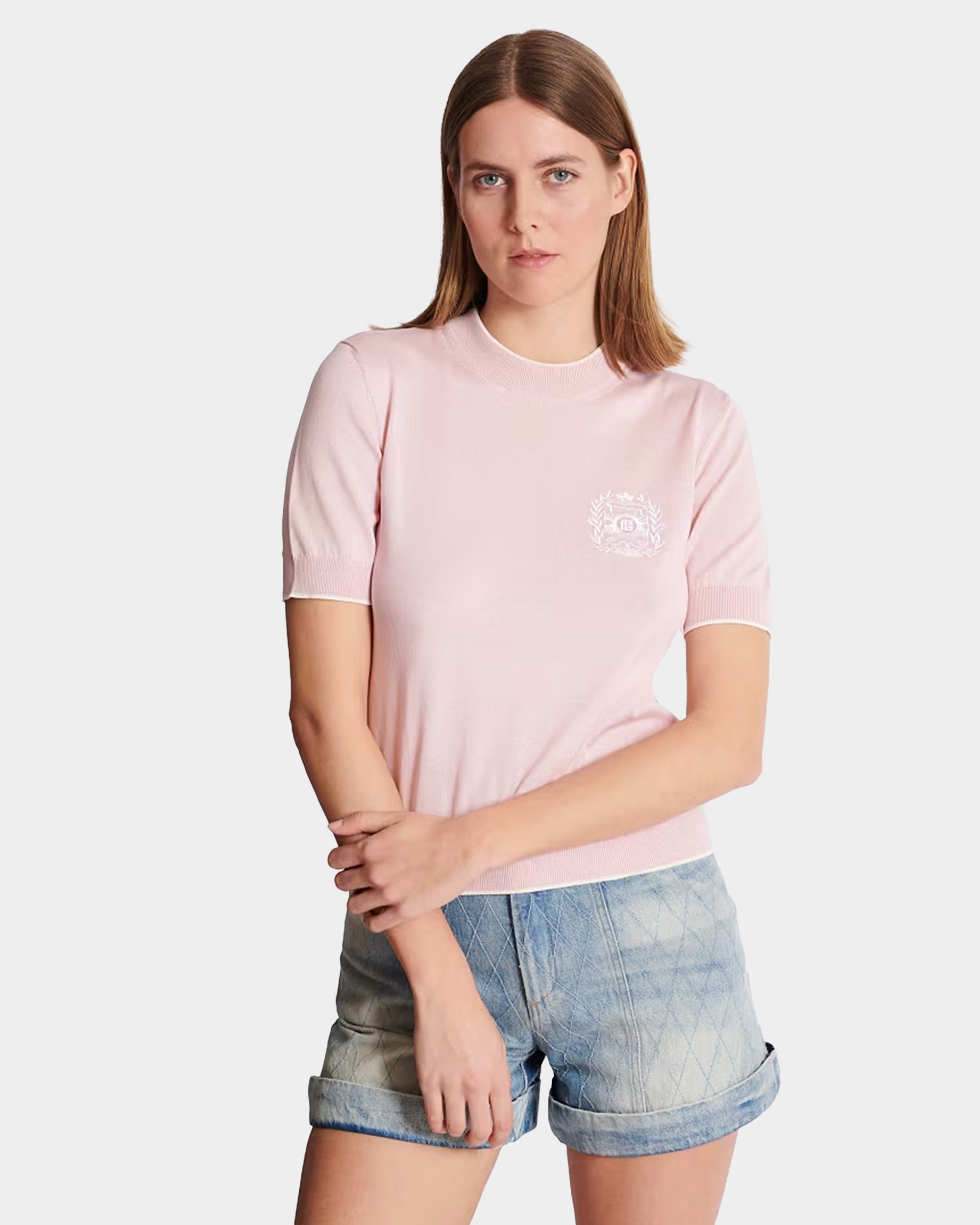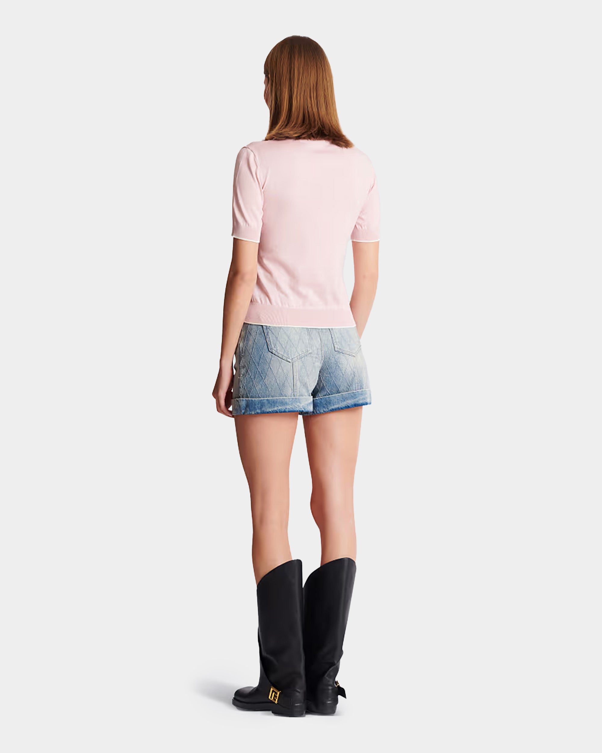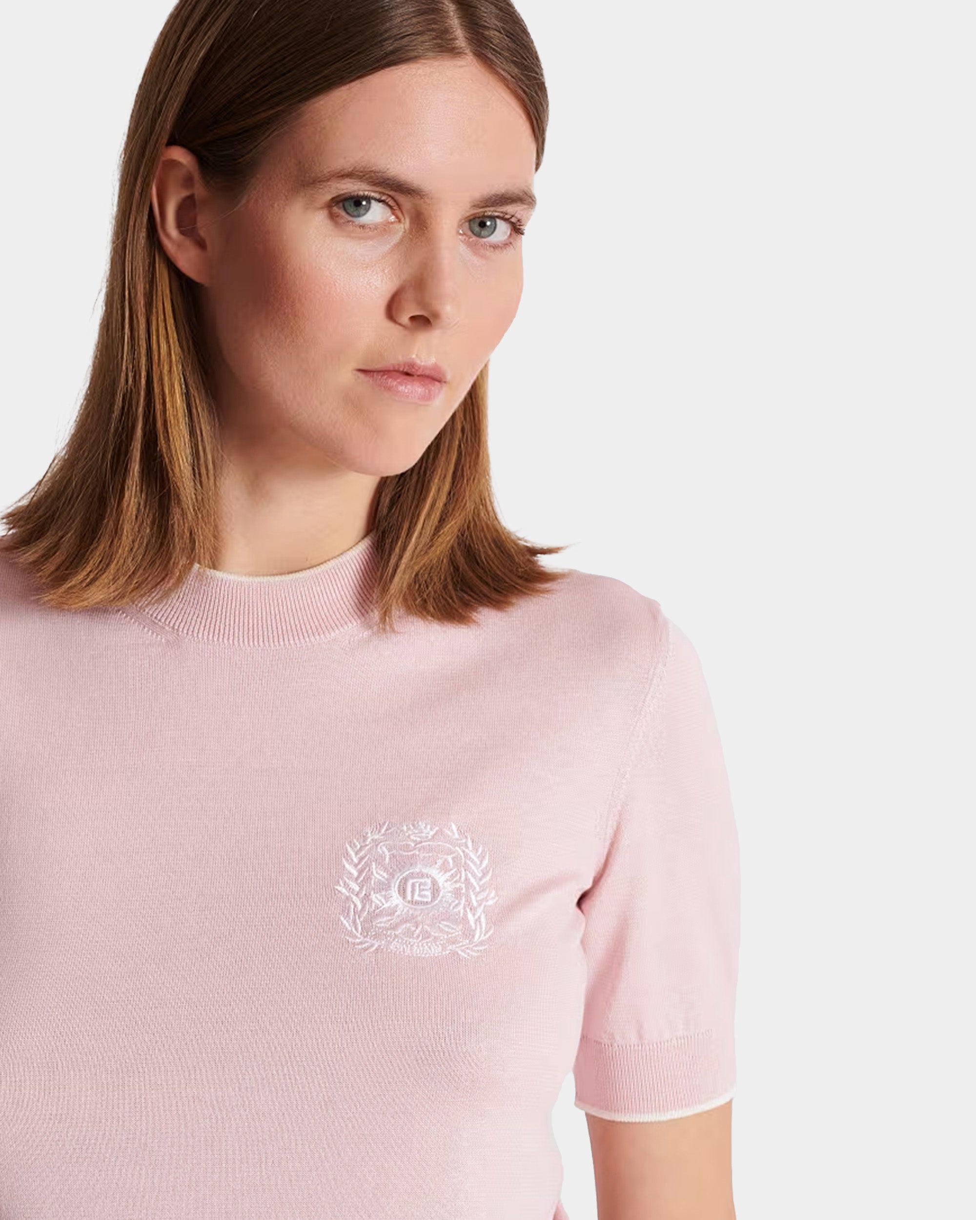 以細緻針織布料製成,觸感柔軟舒適。經典圓領與短袖設計,簡約百搭。胸前飾有 BALMAIN 經典徽章刺繡,低調展現品牌辨識度。以淺色調增添柔美氣息,適合日常穿搭或與外套層疊搭配。