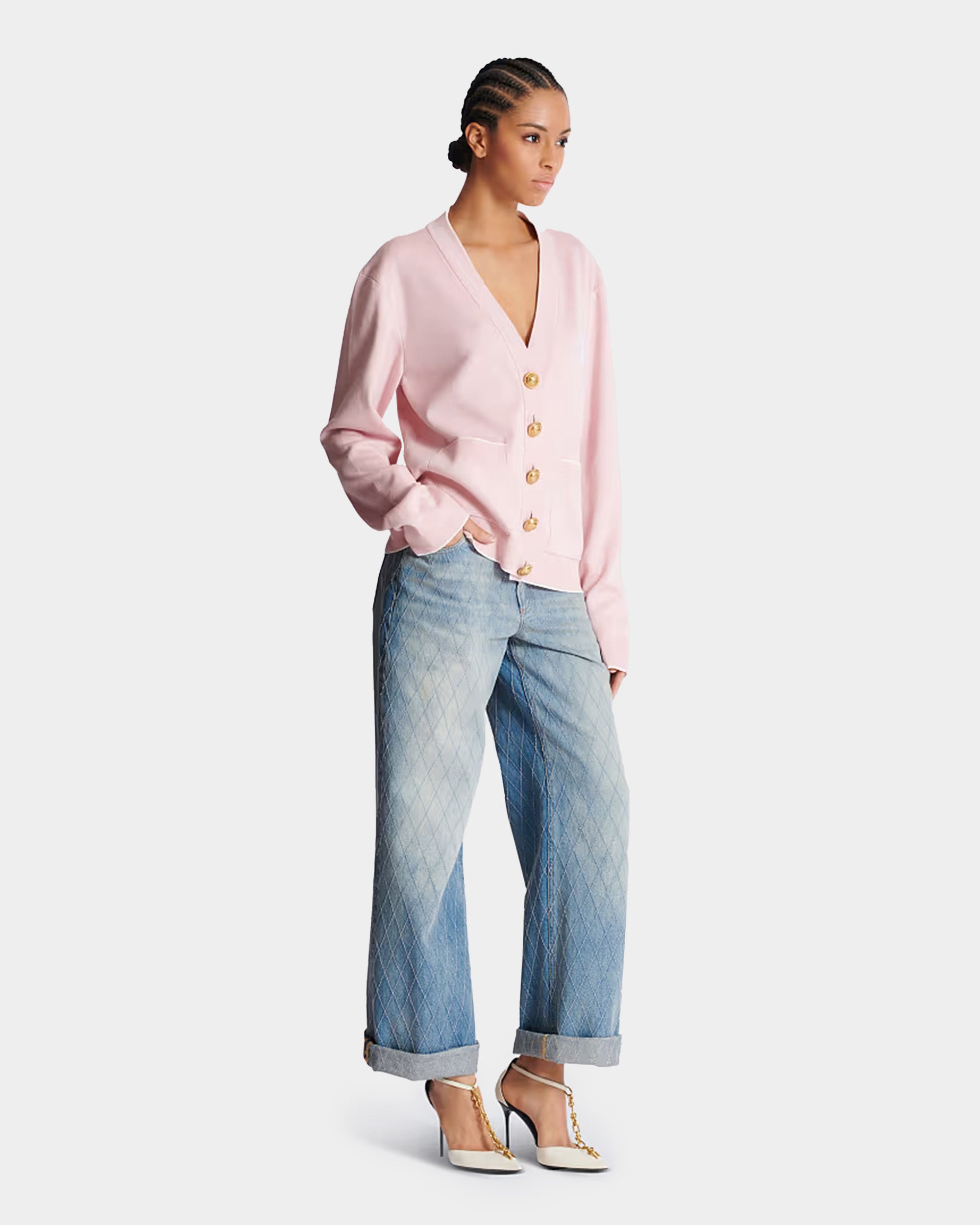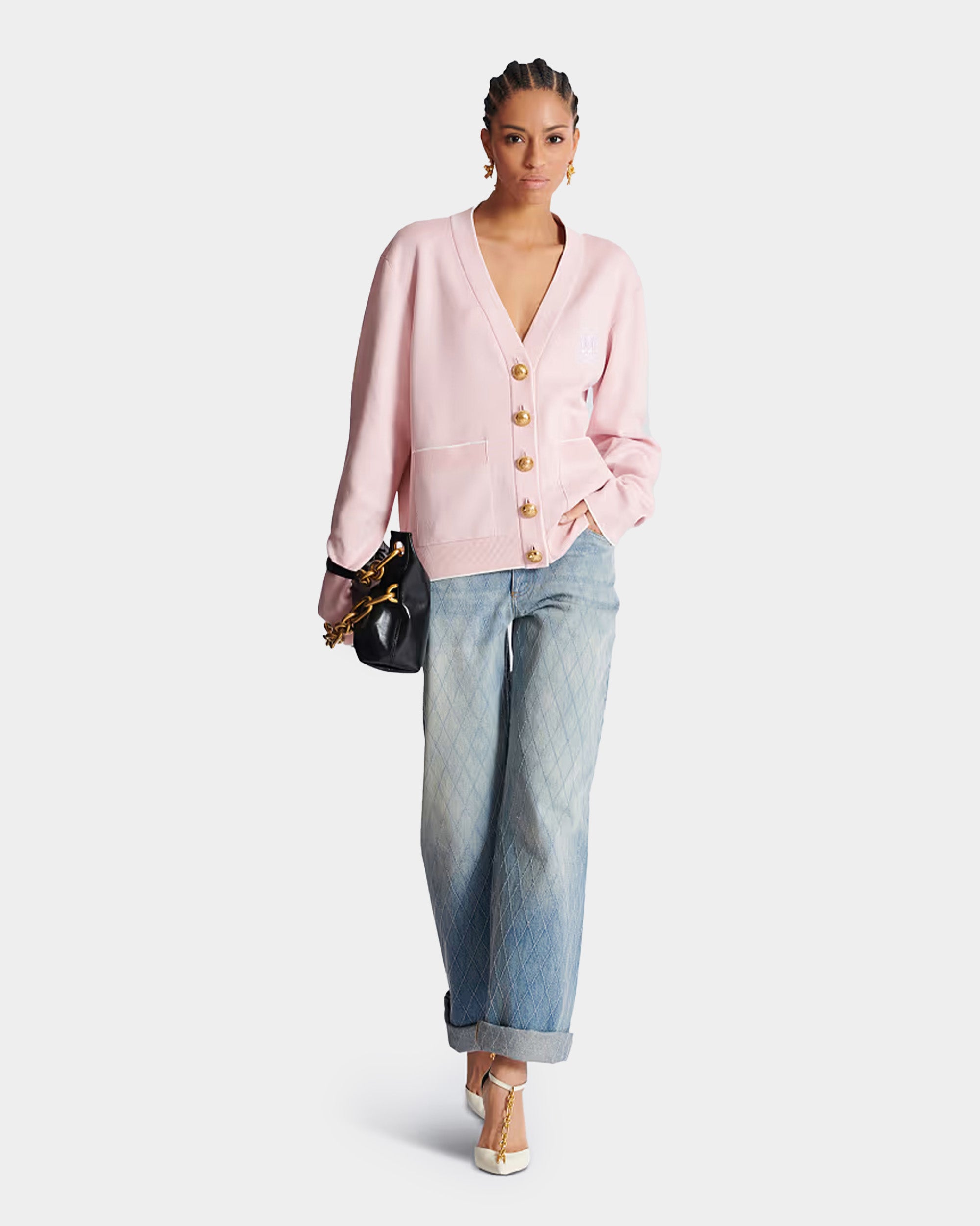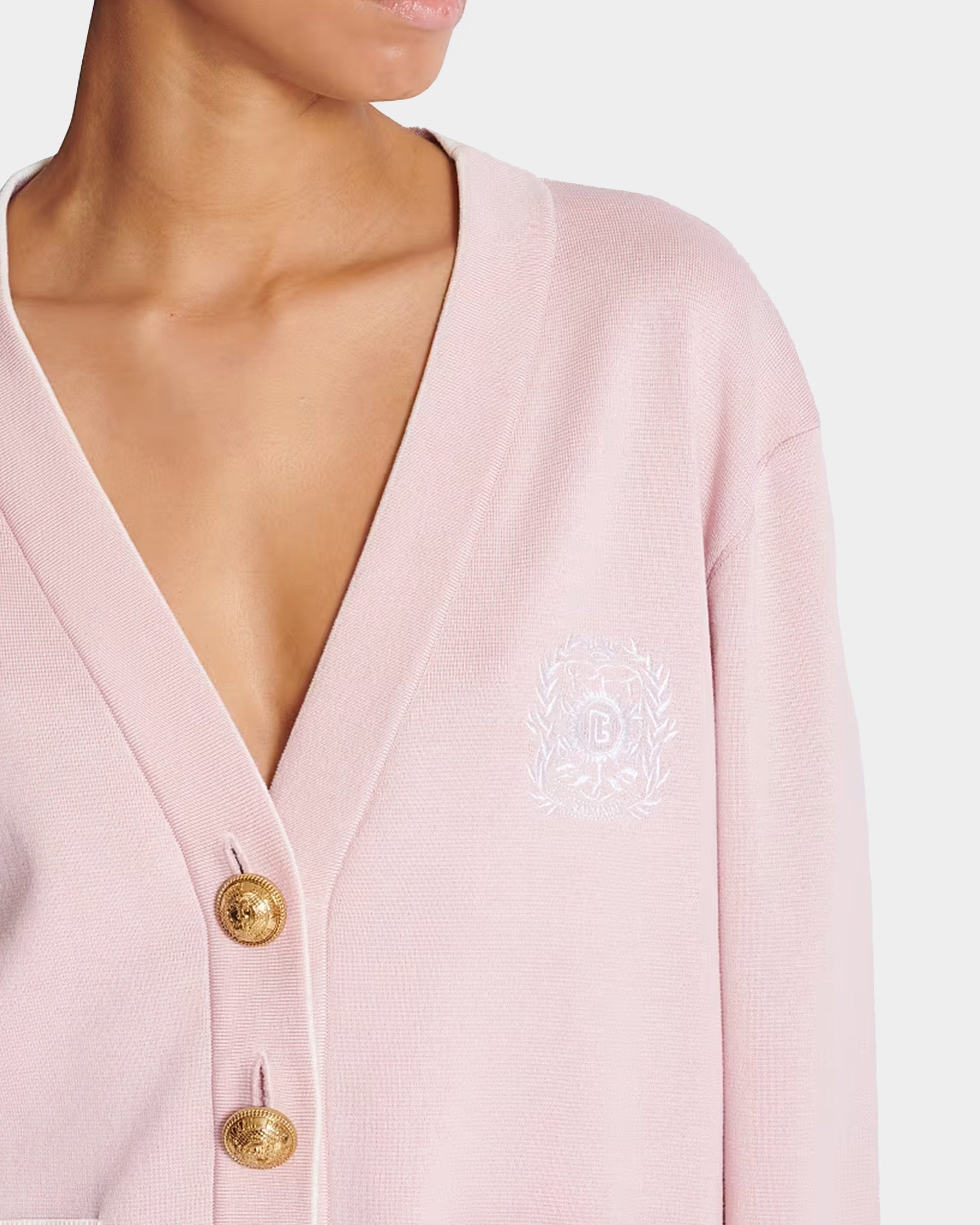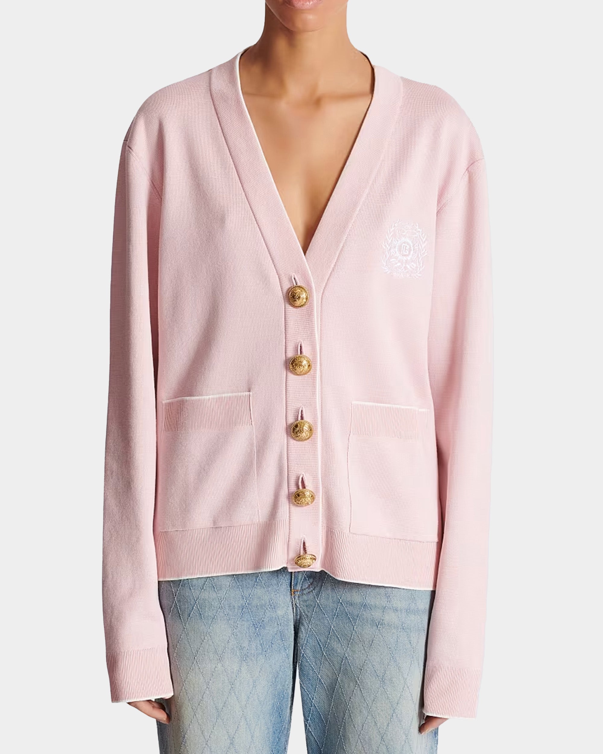 以柔軟針織材質打造,V 領設計搭配長袖,舒適又百搭。胸前飾有 BALMAIN 經典徽章刺繡,展現品牌辨識度。前排金色徽章釦與實用口袋細節,結合典雅與實穿性。粉嫩色調增添柔美氣息,適合日常或層次搭配。