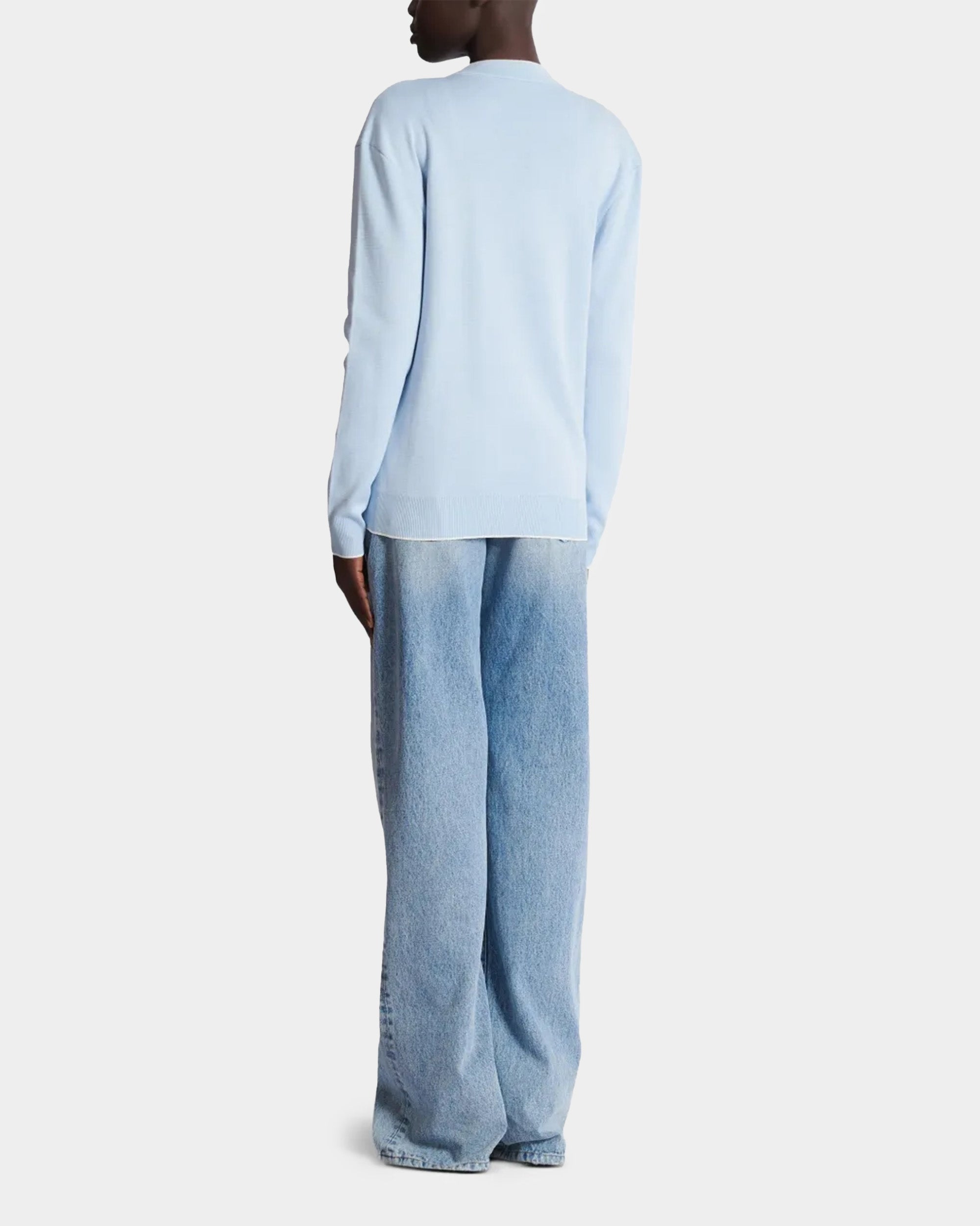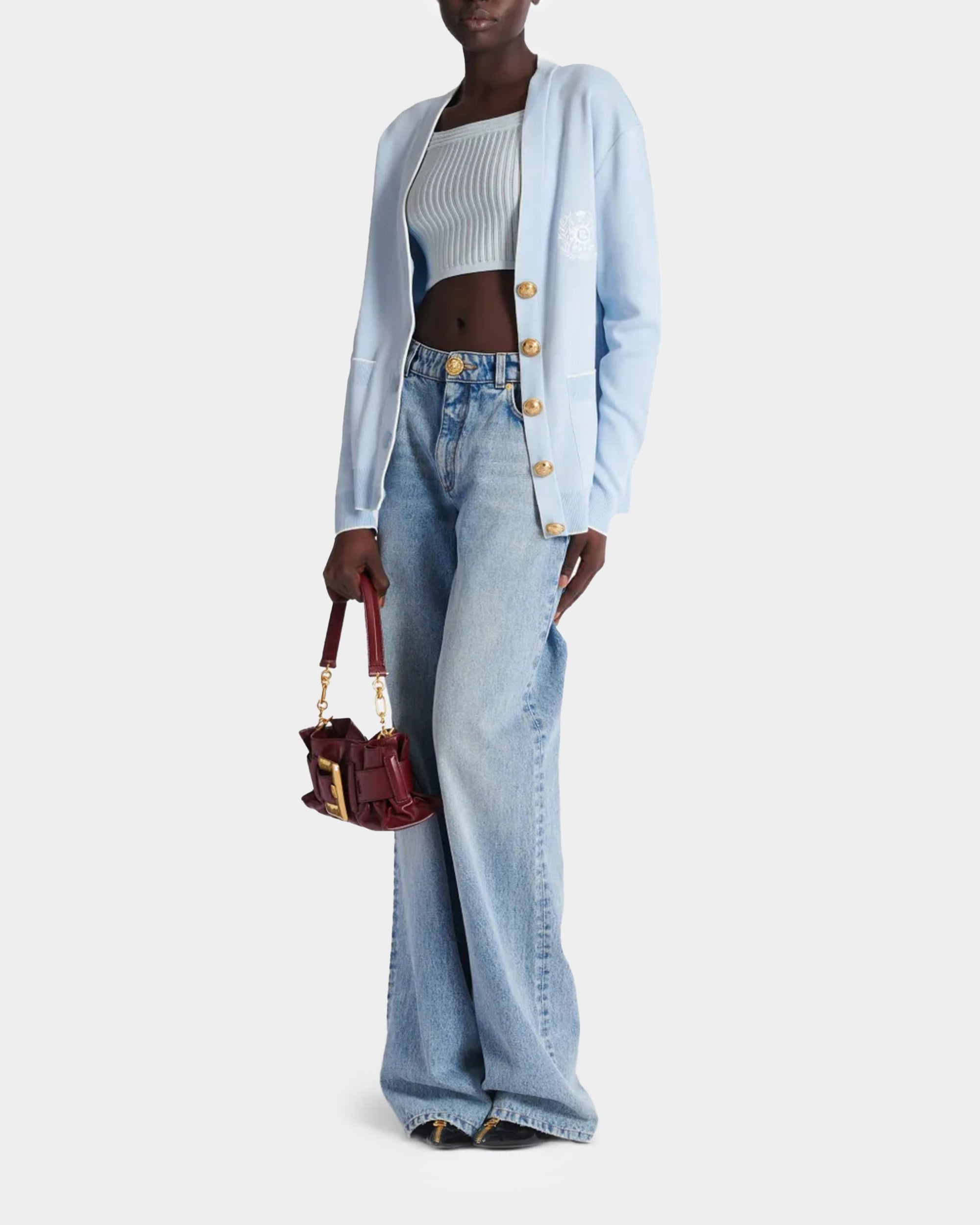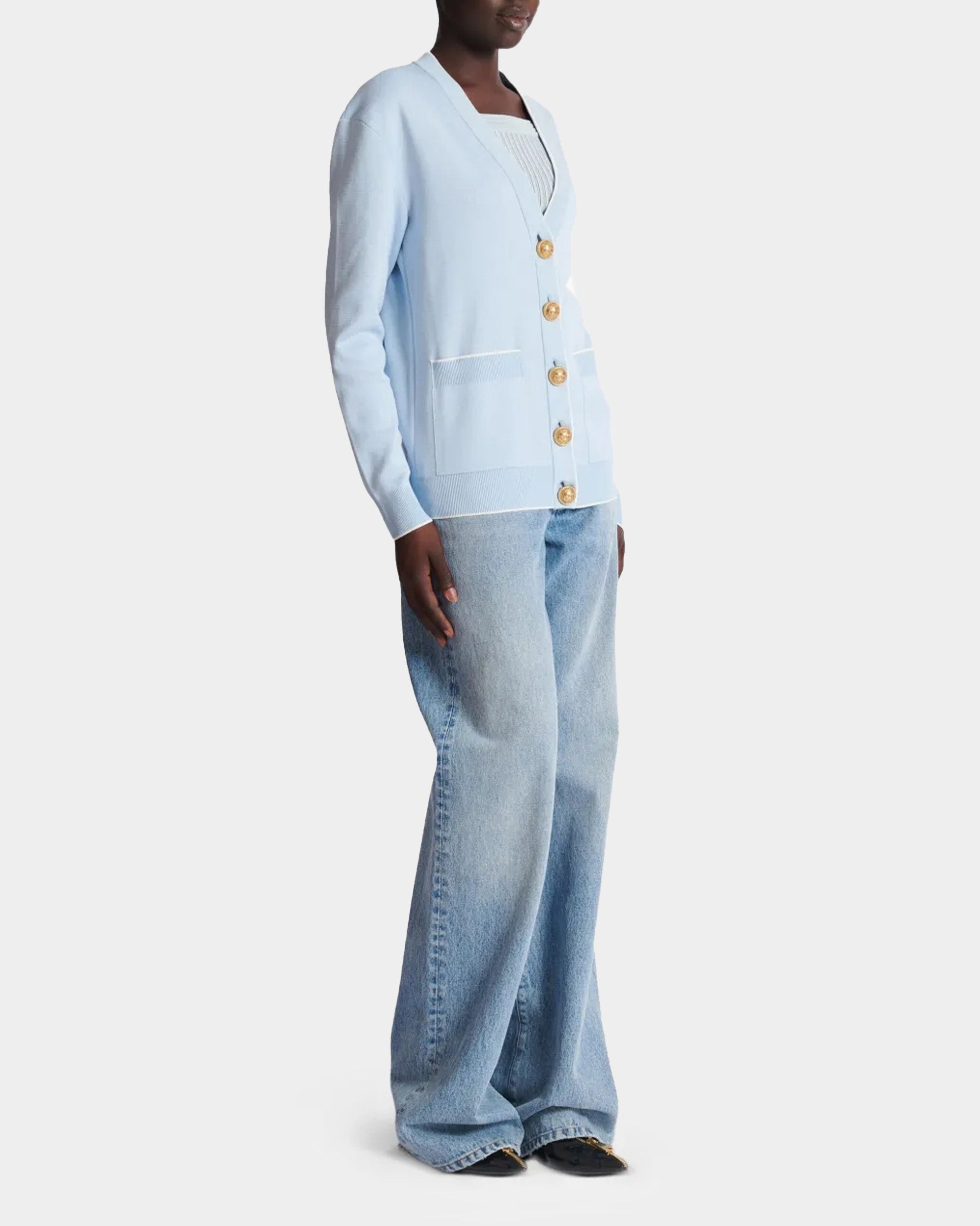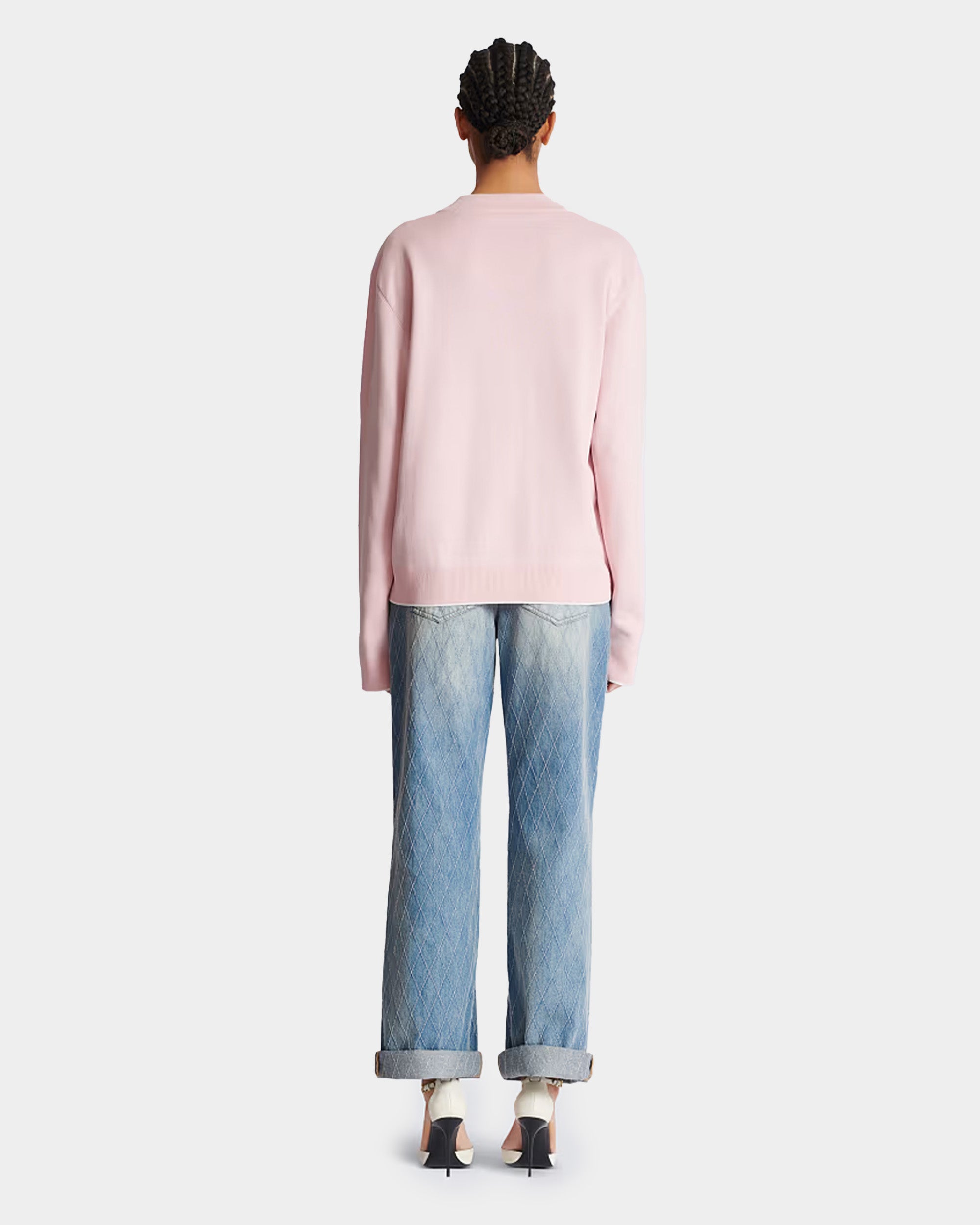 以柔軟針織材質打造,V 領設計搭配長袖,舒適又百搭。胸前飾有 BALMAIN 經典徽章刺繡,展現品牌辨識度。前排金色徽章釦與實用口袋細節,結合典雅與實穿性。粉嫩色調增添柔美氣息,適合日常或層次搭配。