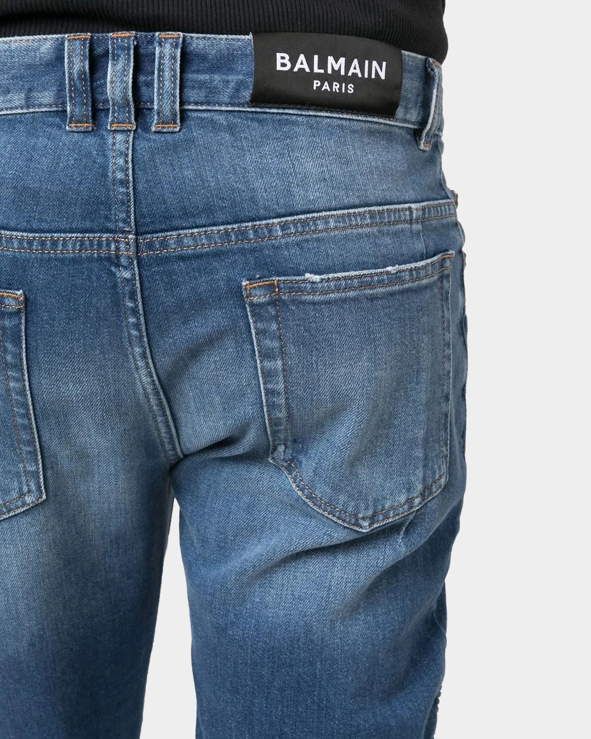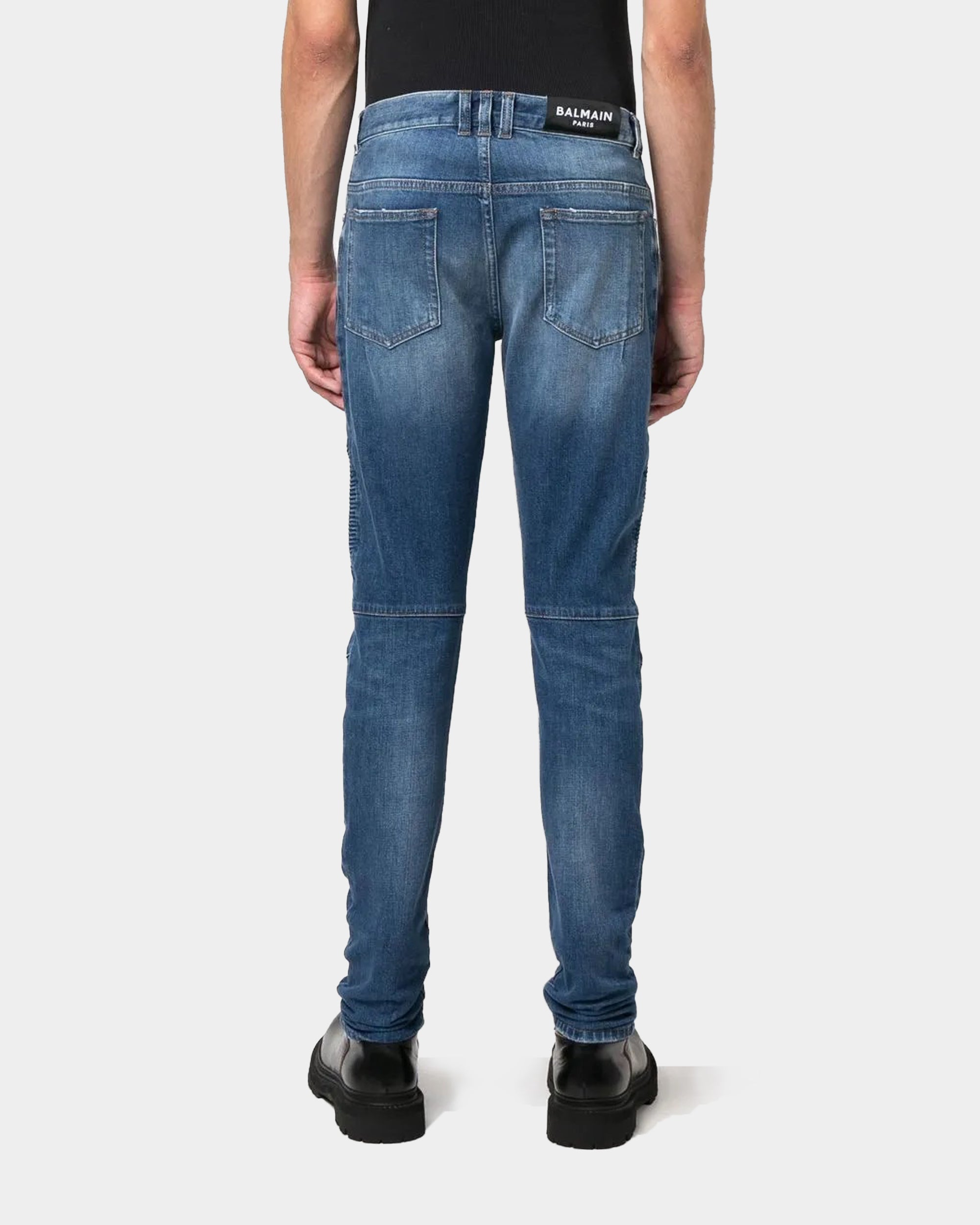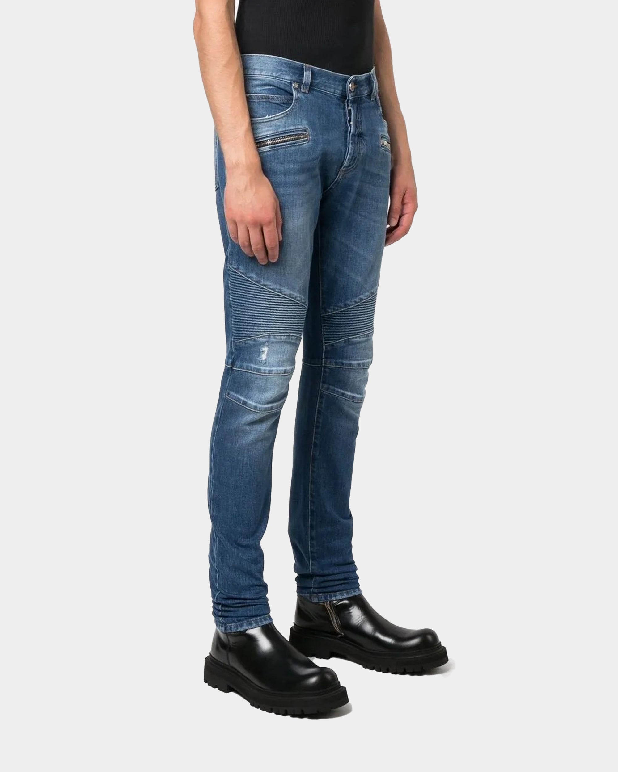 Balmain's Biker Distressed Skinny Jeans are a signature piece of the brand, combining moto style with high fashion. Cut for a slim fit, these jeans are made from a high-quality cotton blend with elastane for comfort. They feature classic ribbed panels, zip pockets and distressed details for a rugged, edgy look. Made in Japan, these jeans are crafted with refined details and pair well with a knit sweater or shirt for a modern, contemporary look.