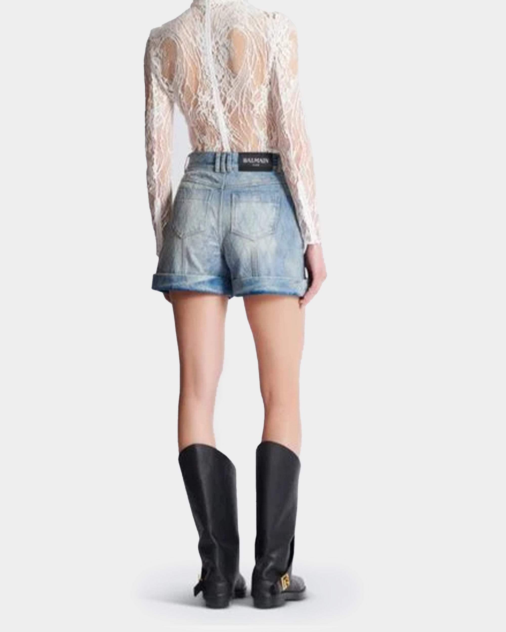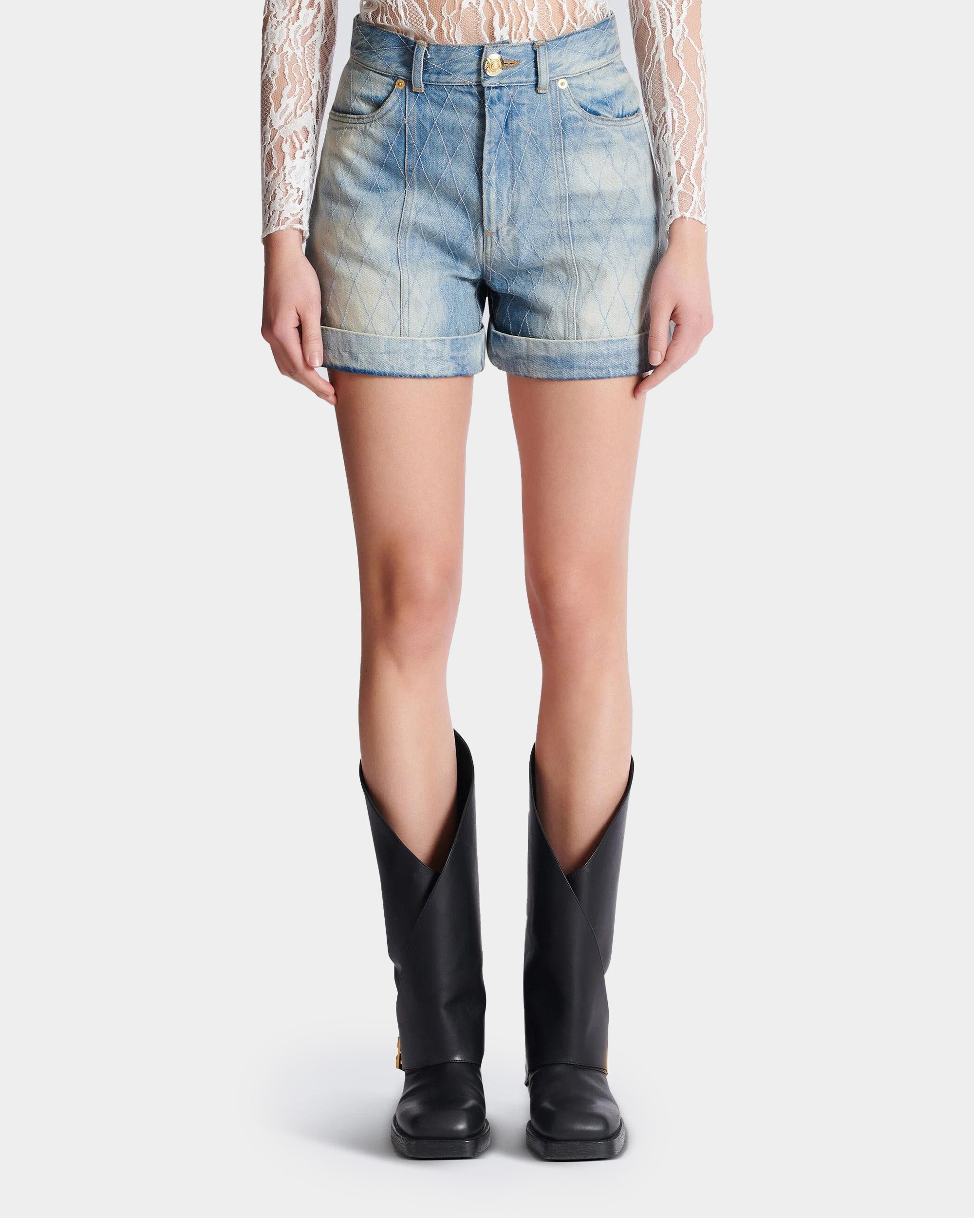 立體菱格壓紋設計展現 BALMAIN 經典元素,搭配淺藍刷色效果,散發復古與摩登並存的氛圍。高腰剪裁修飾身形,翻折褲腳設計增添率性細節。無論搭配襯衫或 T-shirt,都能輕鬆穿出自信格調。