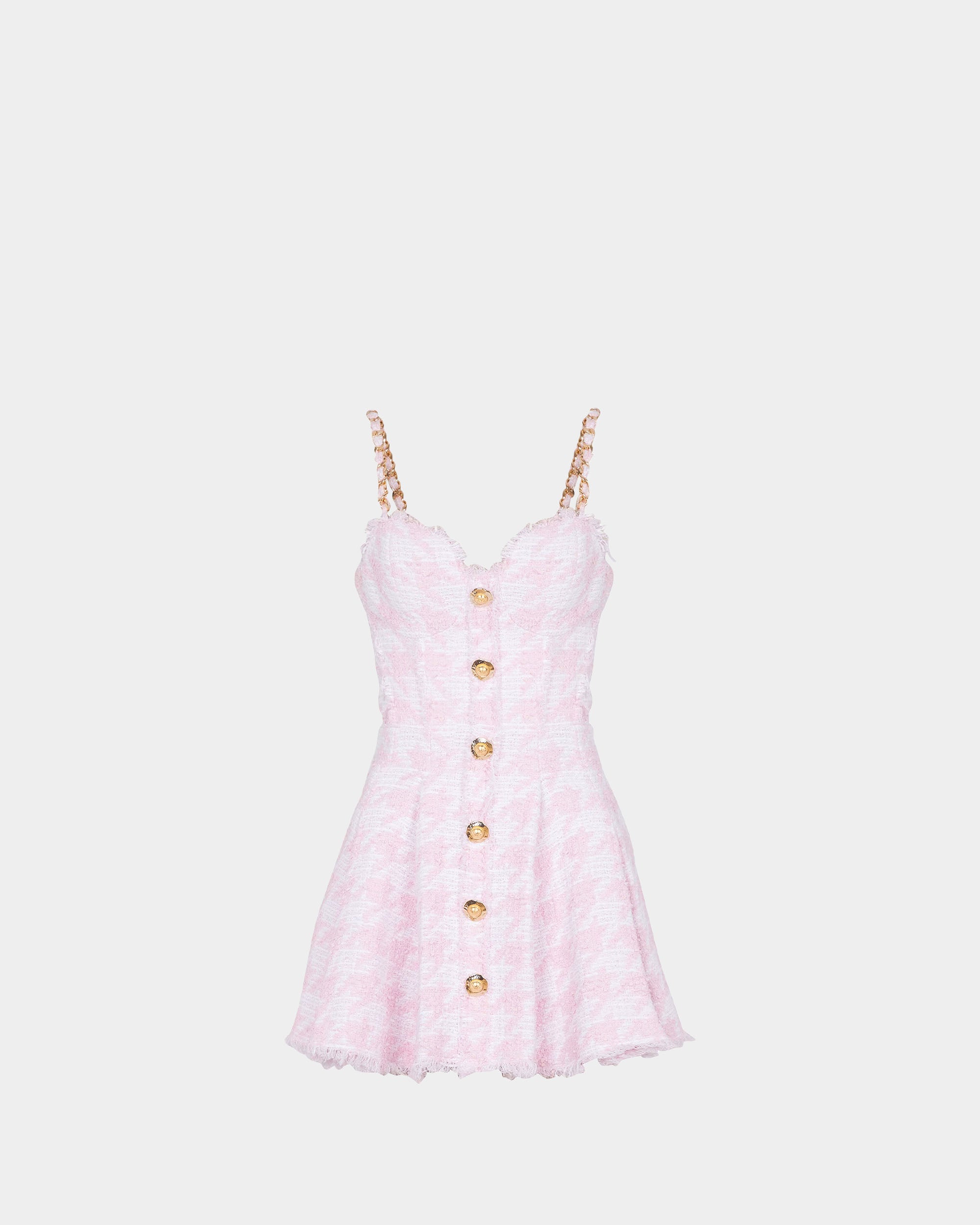 柔和粉色千鳥格粗花呢製成,展現甜美優雅氣息。金色徽章排釦延續品牌標誌性設計,細緻鏈條吊帶增添奢華感。A字裙擺修飾腿型,適合日常或派對場合,展現浪漫又俐落的巴黎風格。