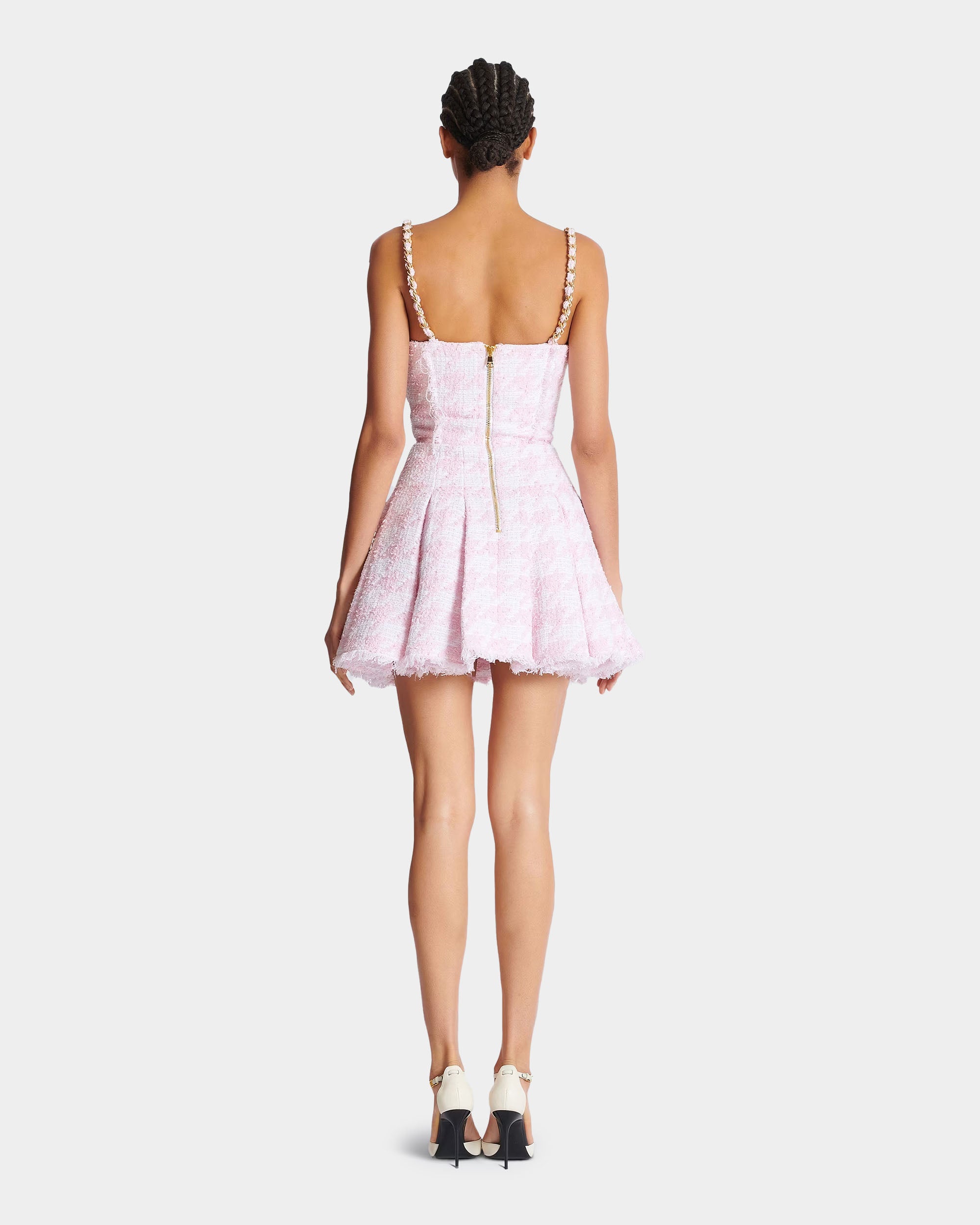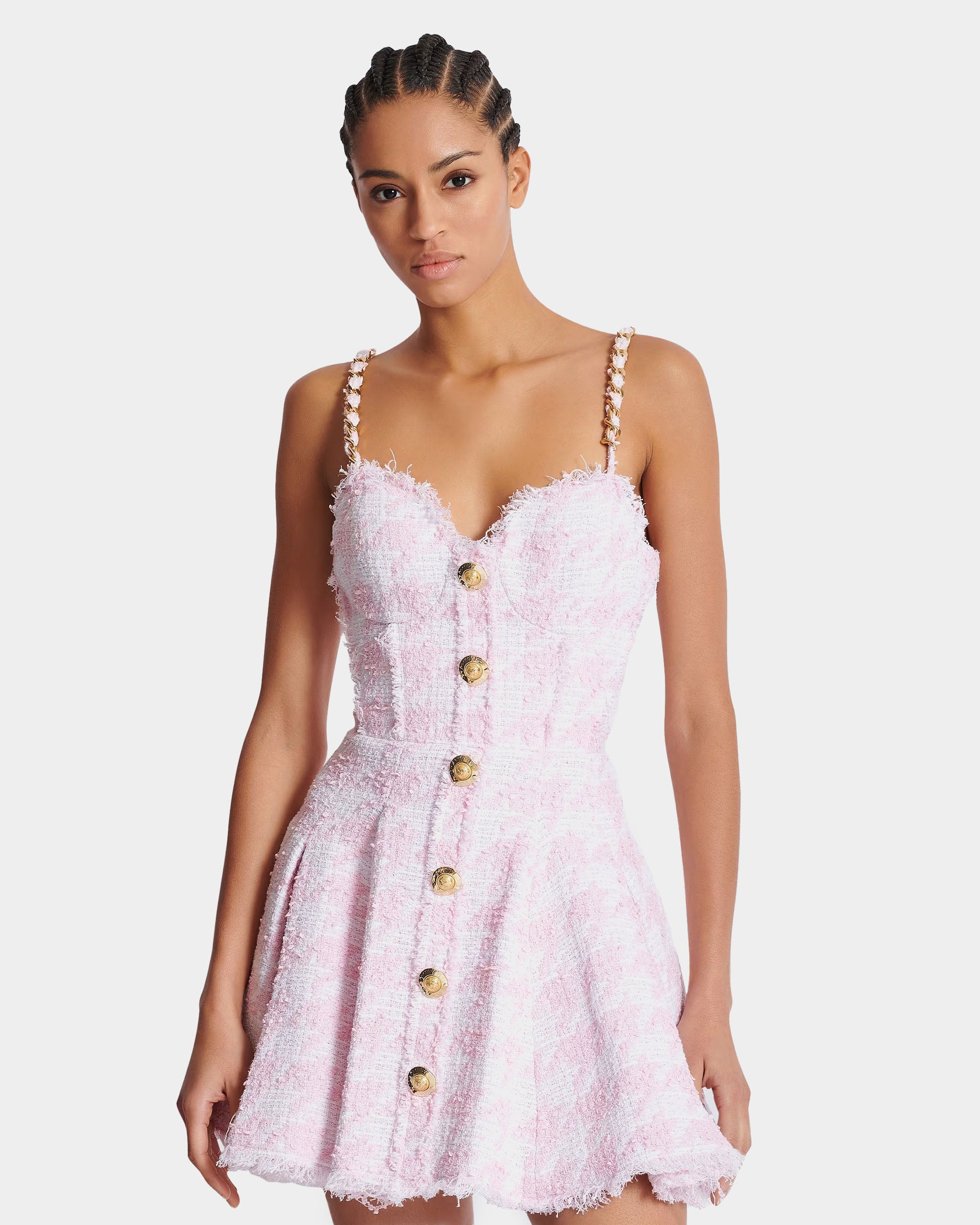 BALMAIN 粉色千鳥格吊帶 A 字洋裝